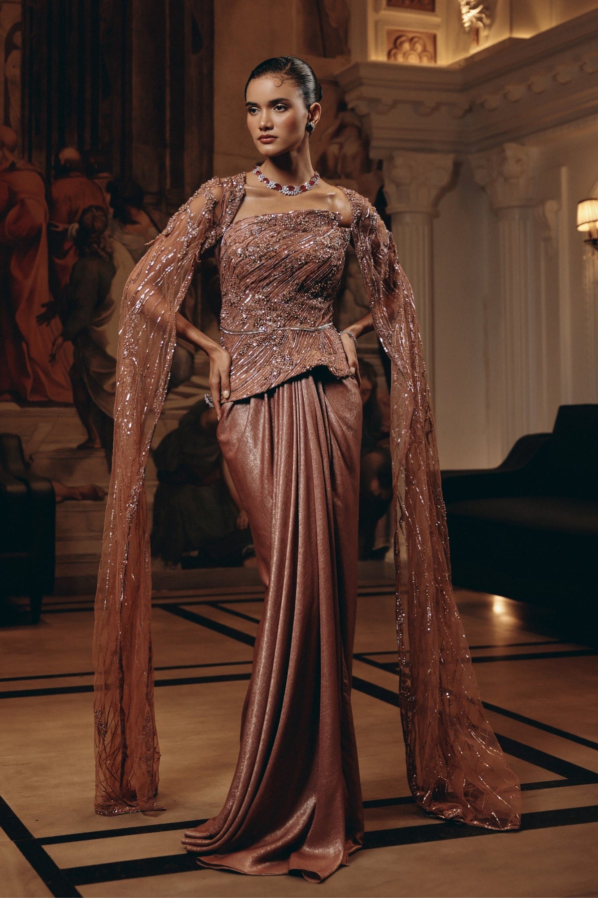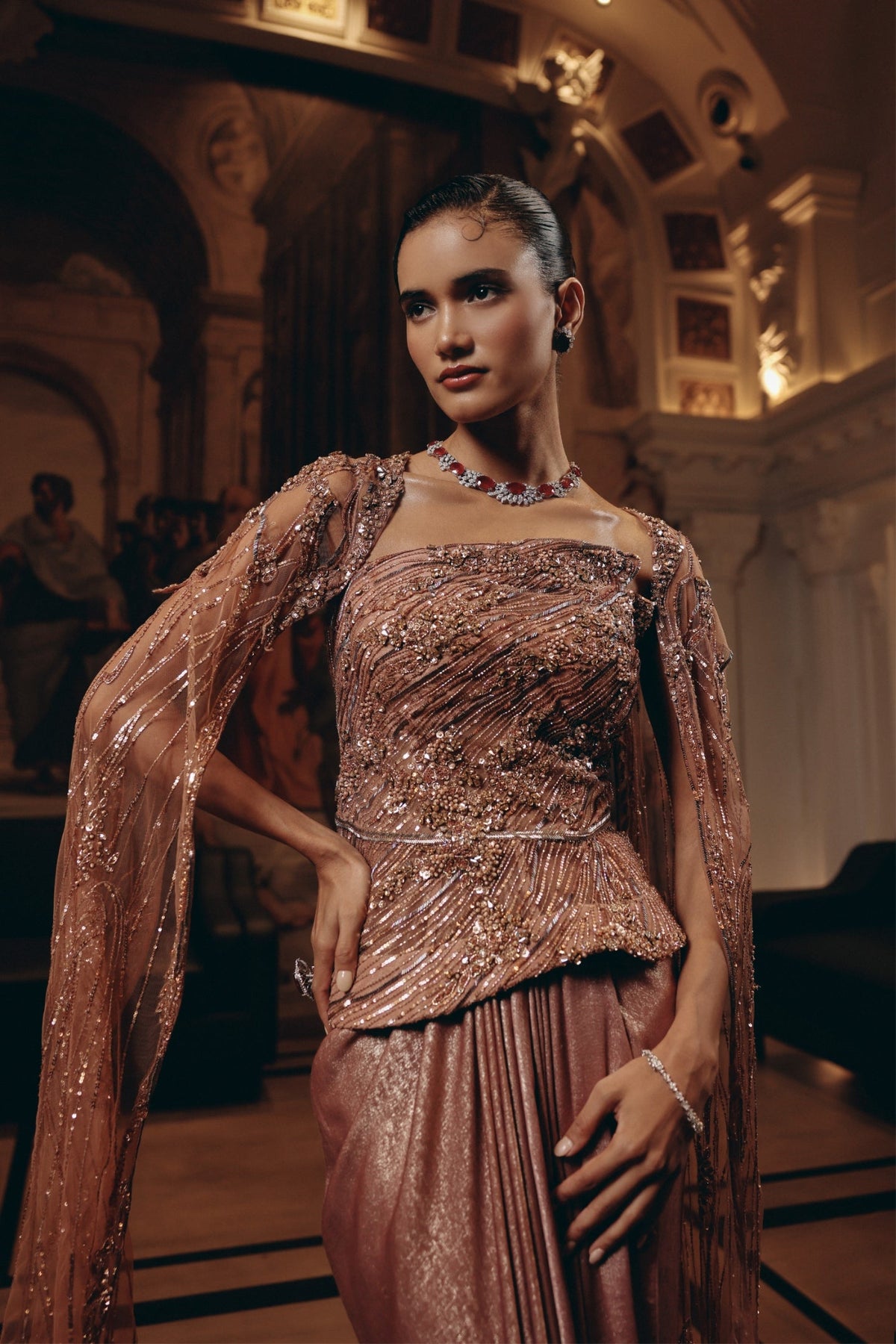'Rose Gold Cape Saree' is from Notte collection by Adaara Couture. Featuring an asymmetrical, hand-beaded bodice that sculpts the waist and descends into a soft, column skirt with fluid drape. A sheer, sequinned cape cascades from the shoulders. A tonal embroidery crystals, bugle beads, and micro-sequins create a refined shimmer, balanced by clean lines and a graceful floor-length finish.