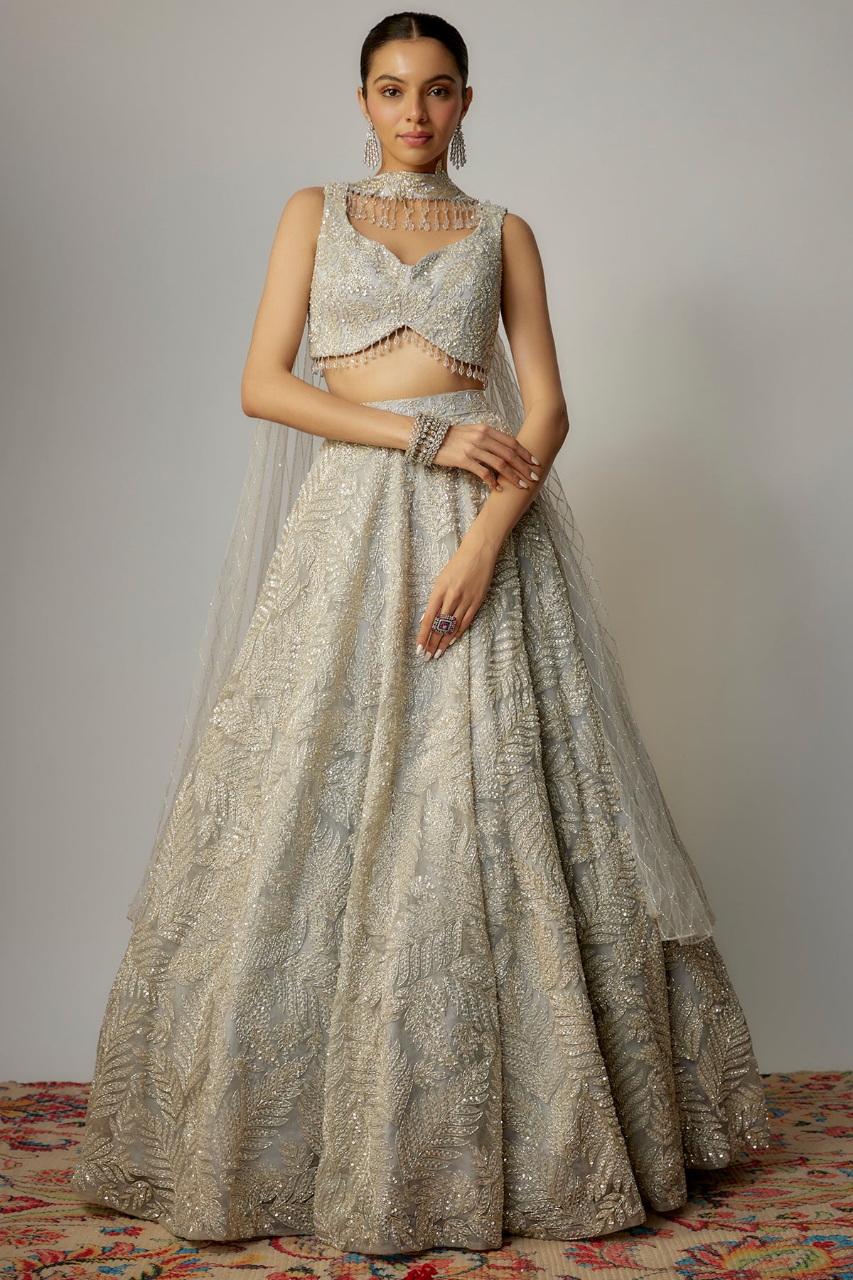 'Grey Net Sequins Embellished Lehenga Set' is from Celestial collection by Kalighata. Featuring A Grey Lehenga In Net Base With Sequins, Crystals And Cutdana Embellishments, Including A Cancan. It Is Paired With A Sequins Work Blouse And A Dupatta. This Designer Lehenga Is The Perfect Addition To Your Bridal Trousseau.