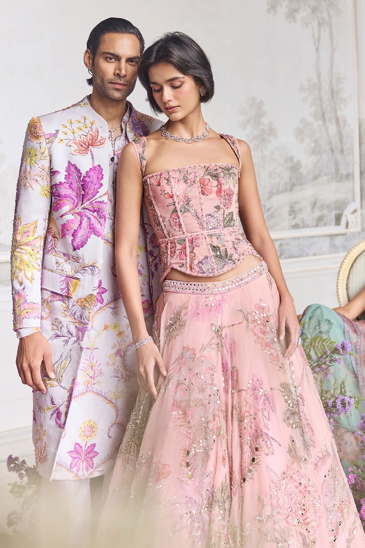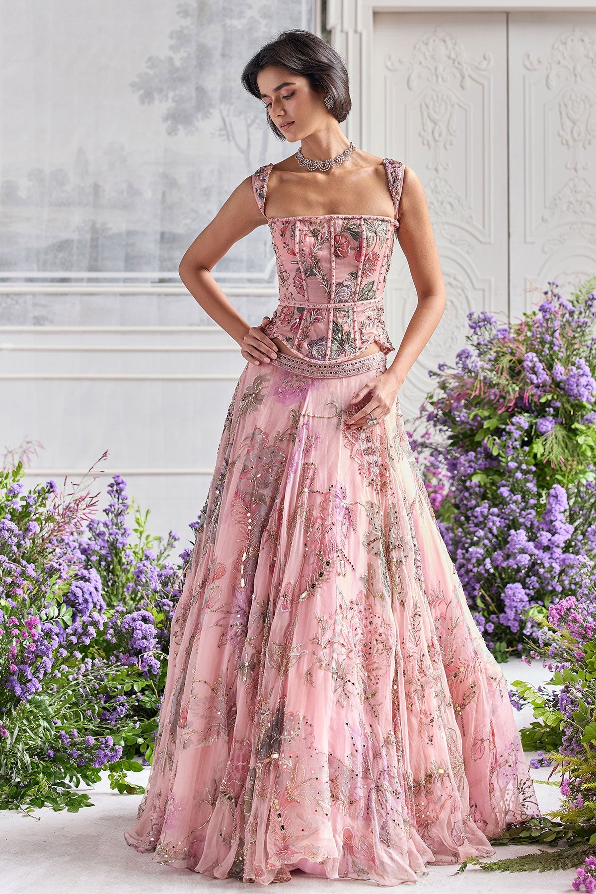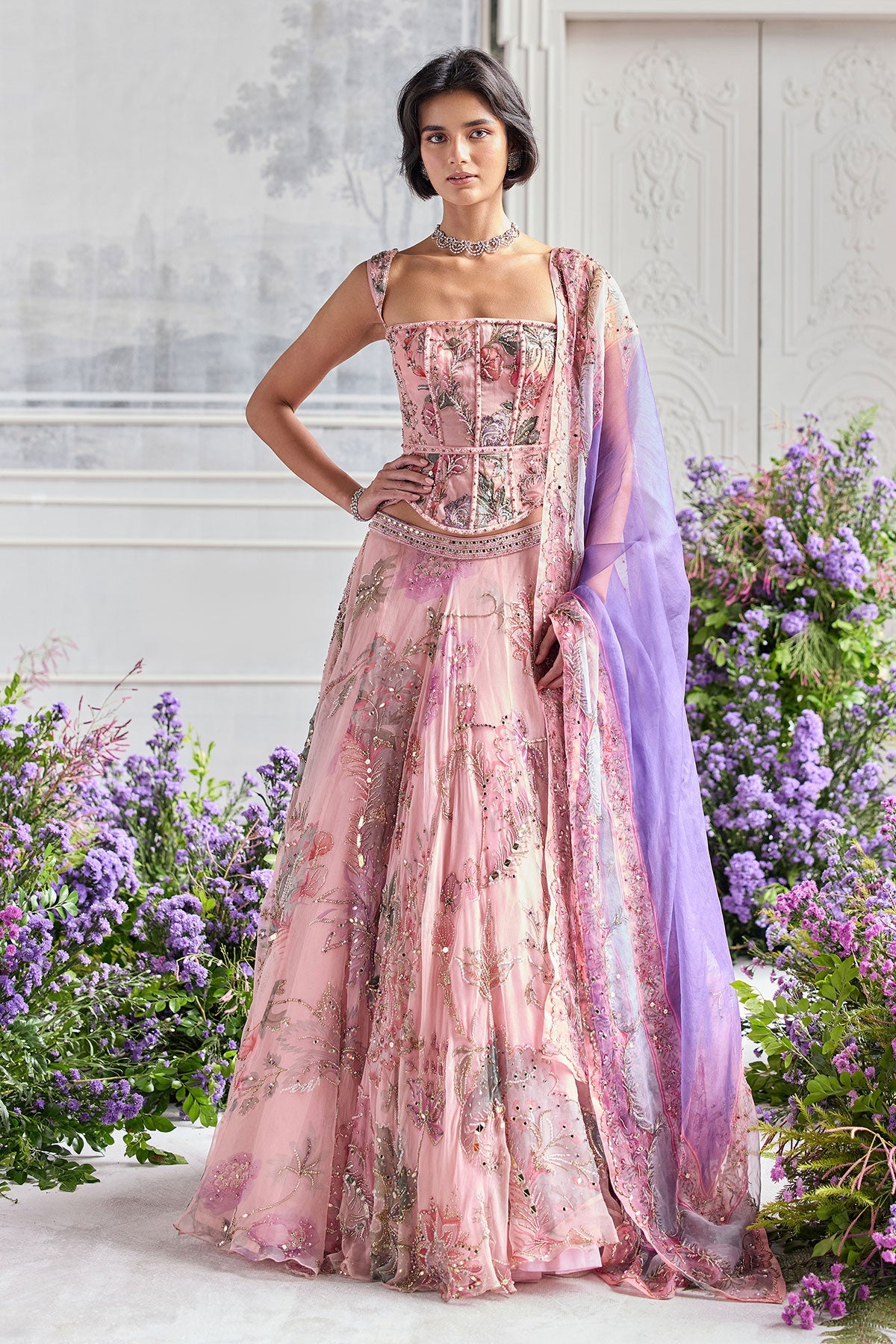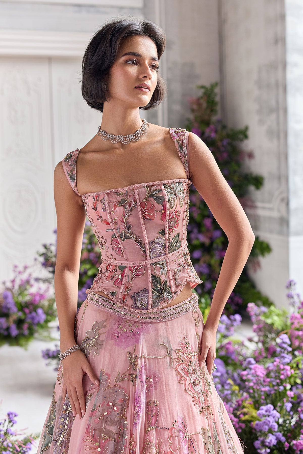 'Bhumi Pednekar In Izel' is from Fanah collection by Mahima Mahajan. HAND EMBROIDERED CORSET FEATURING DETACHABLE STRAPS AND EMBROIDERED LEHENGA PAIRED WITH CONTRAST DUPATTA