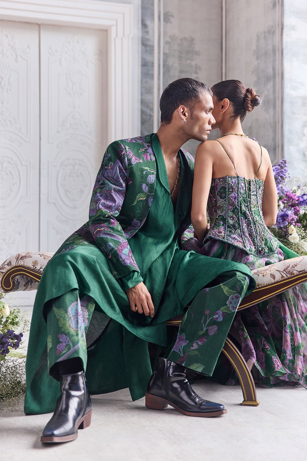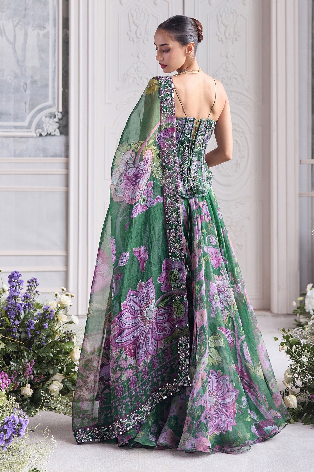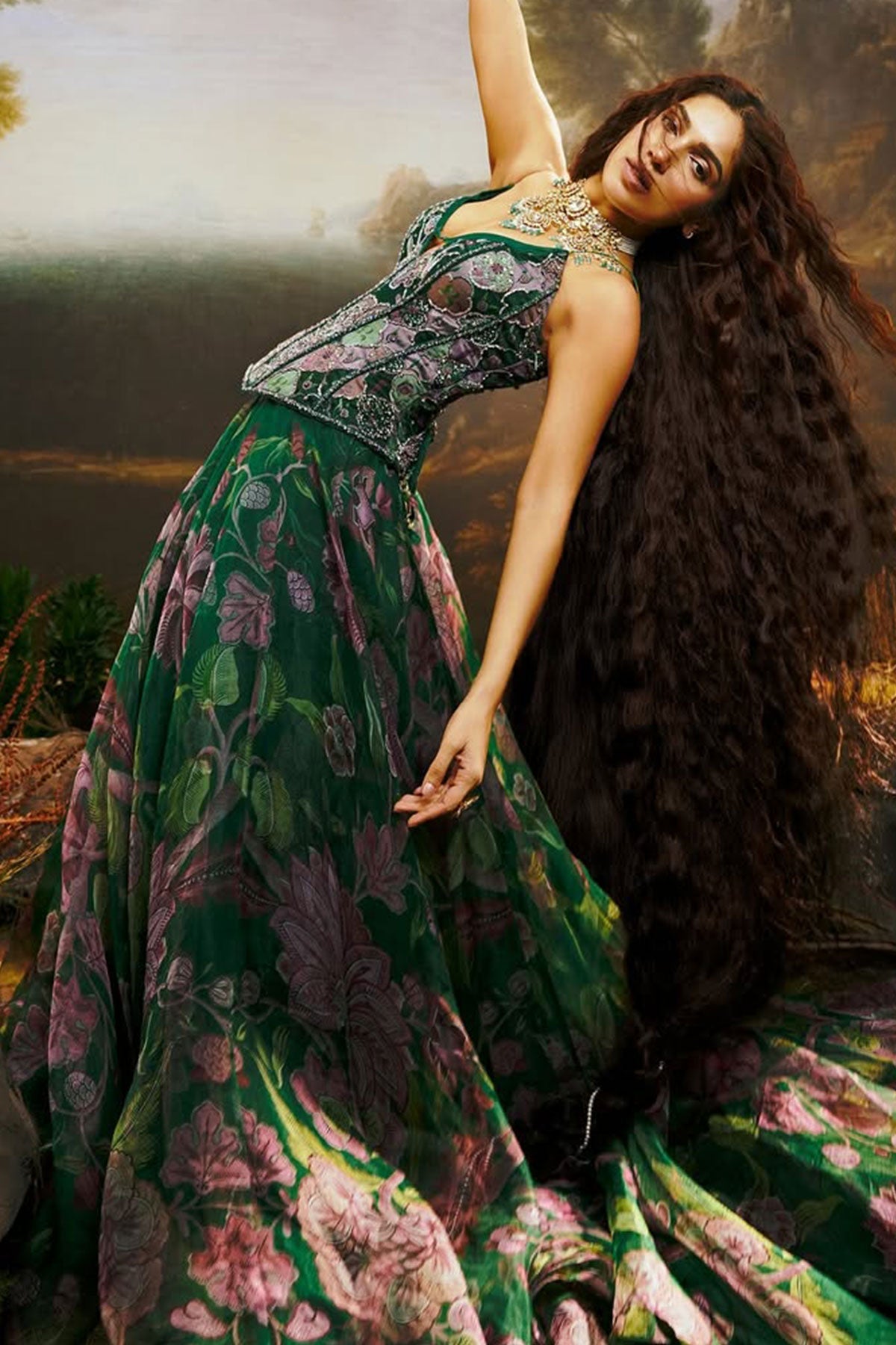 'Bhumi Pednekkar In Esra' is from Fanah collection by Mahima Mahajan. EMBRODIERED PANELLED CORSET TOP PAIRED WITH EMBROIDERED DUPATTA AND FLORAL LEHENGA