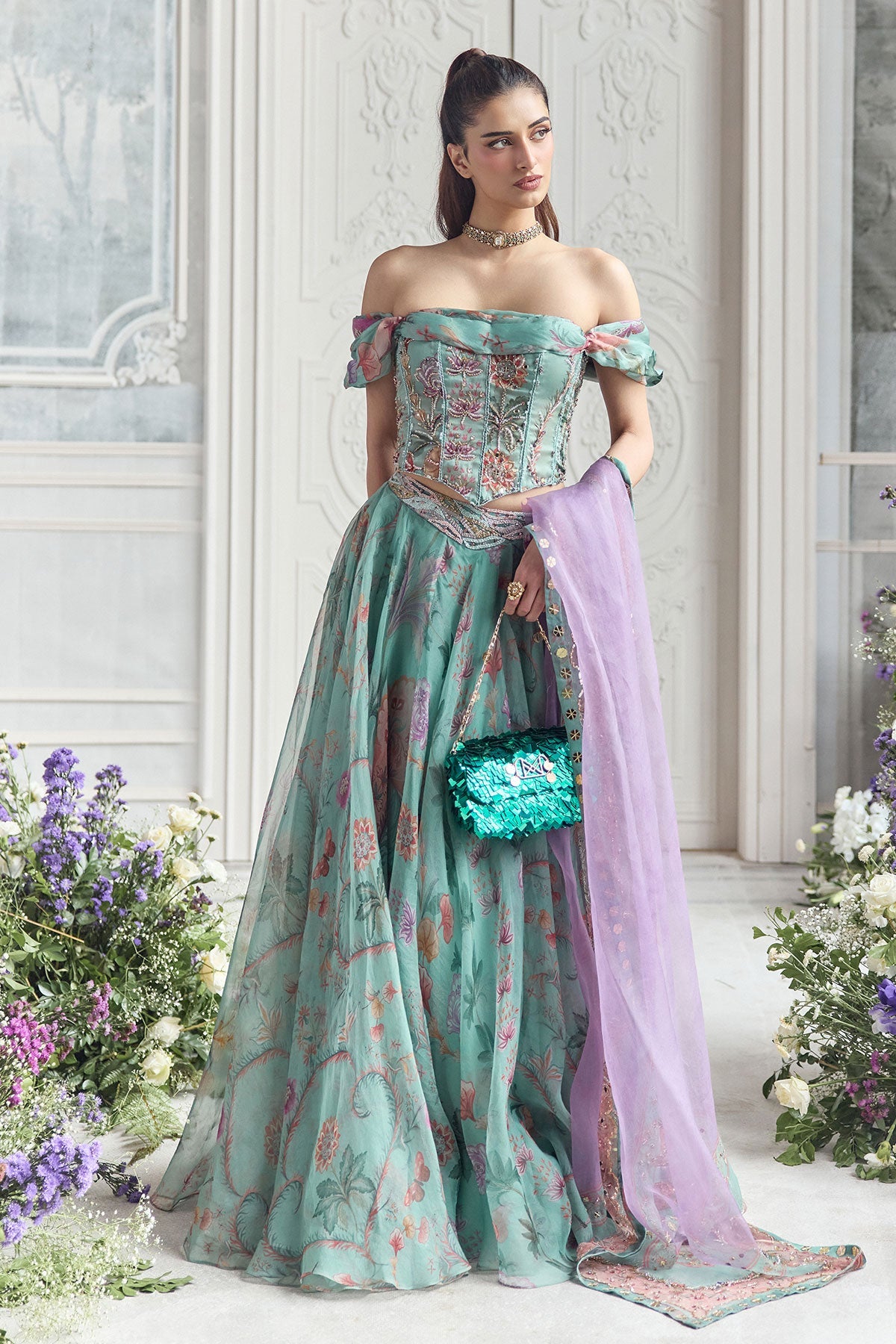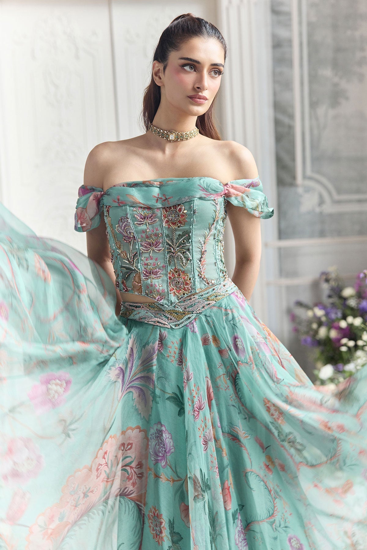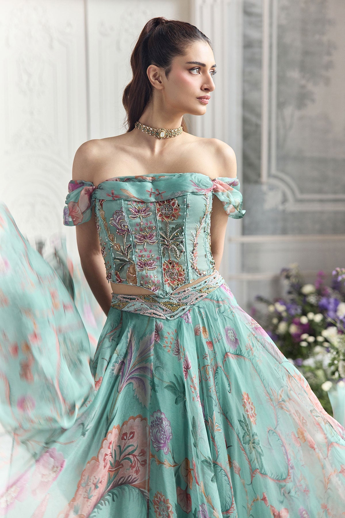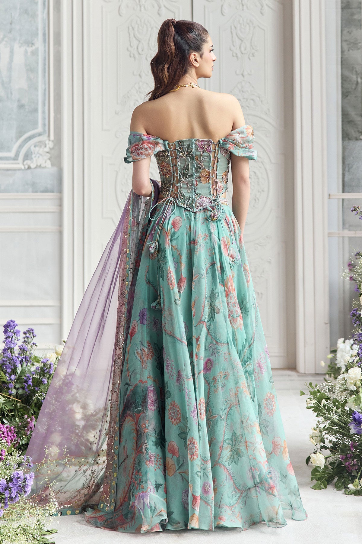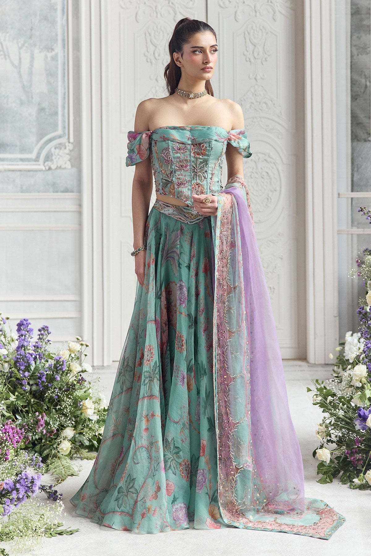 'Camila' is from Fanah collection by Mahima Mahajan. EMBROIDERED OFF SHOULDER CORSET TOP PAIRED WITH EMBROIDERED DUPATTA AND FLORAL LEHENGA