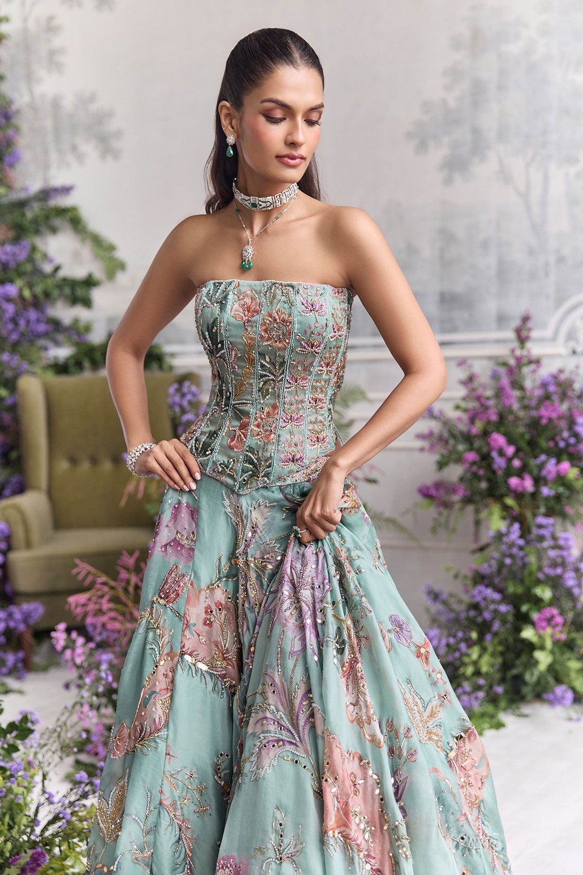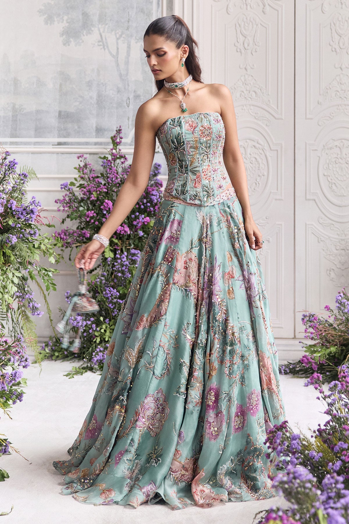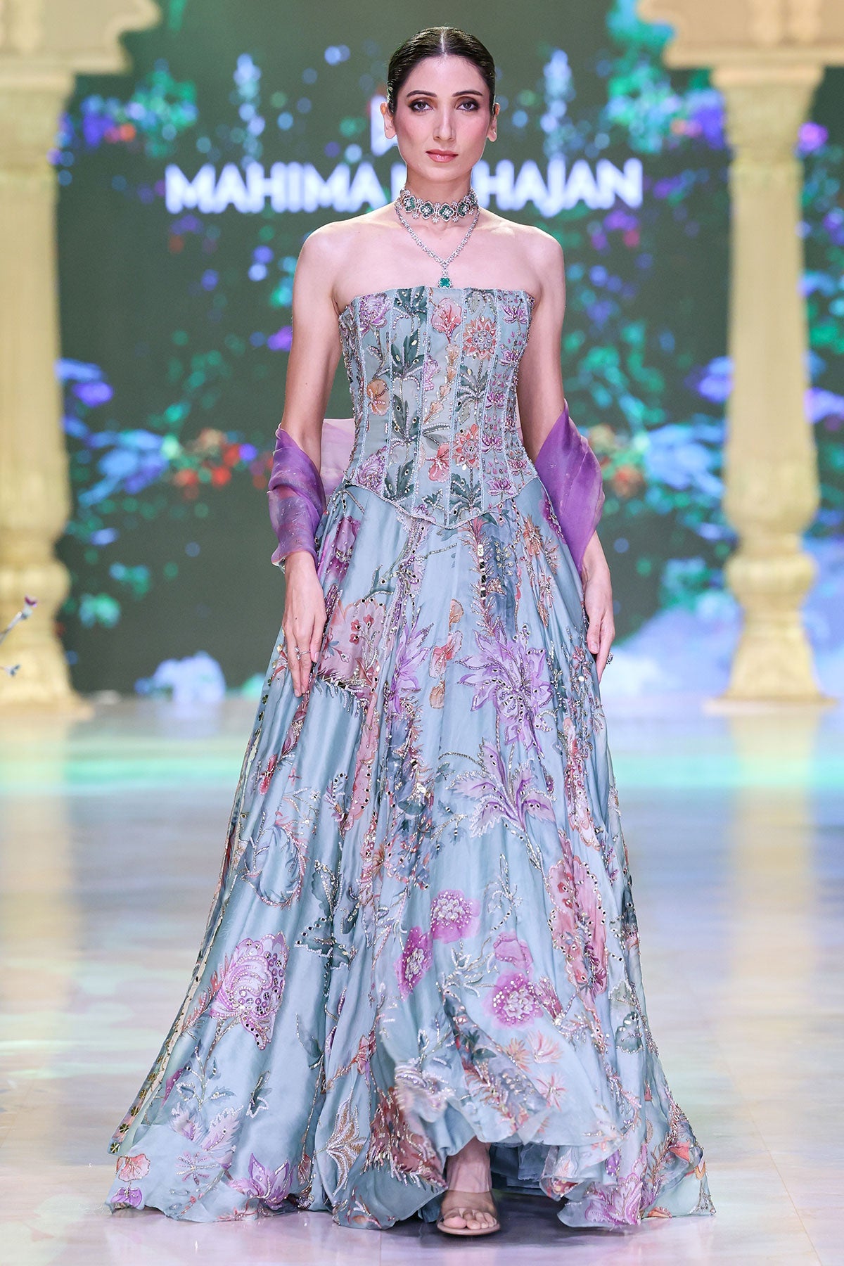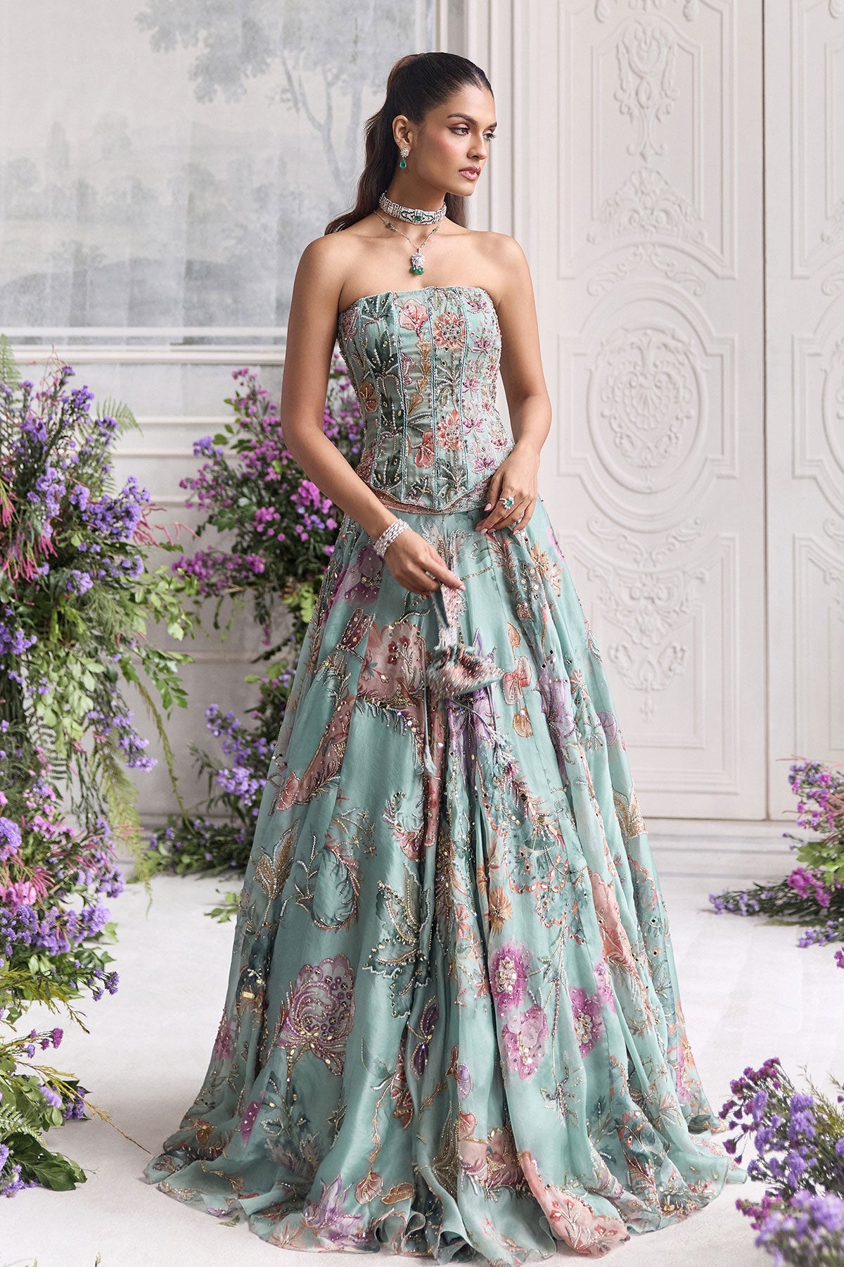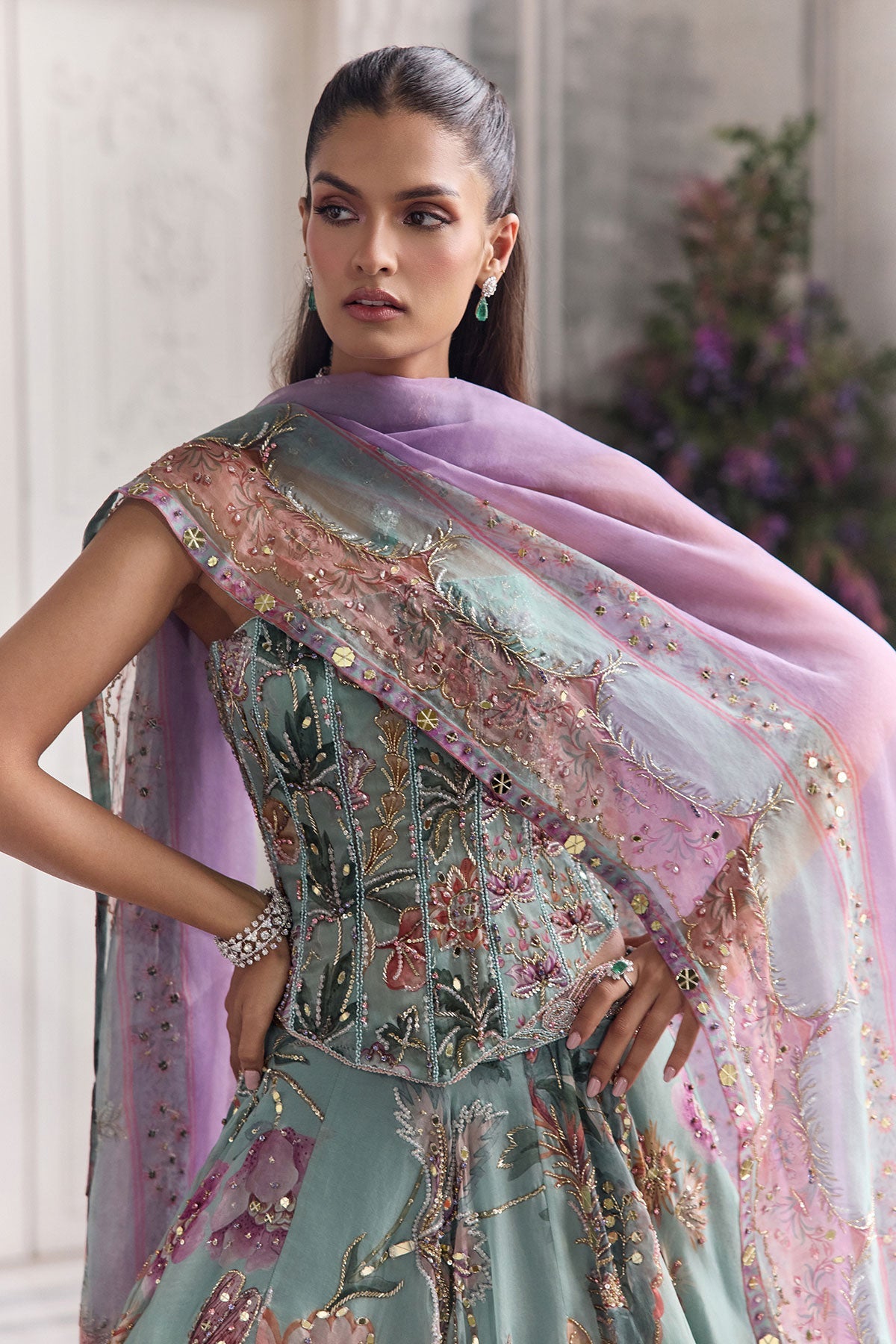 'Ilana' is from Fanah collection by Mahima Mahajan. EMBROIDERED CORSET WITH HEAVY EMBROIDERED LEHENGA PAIRED WITH DUPATTA