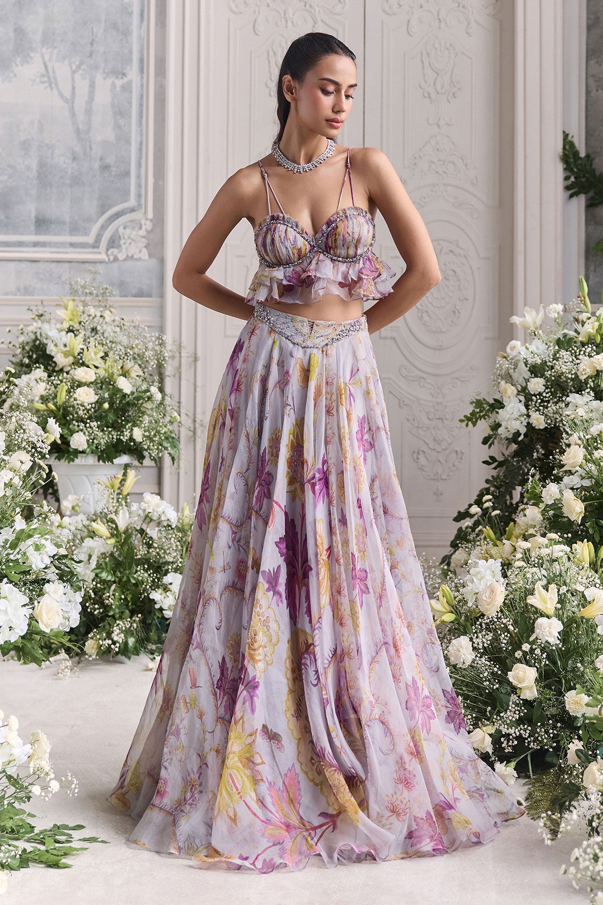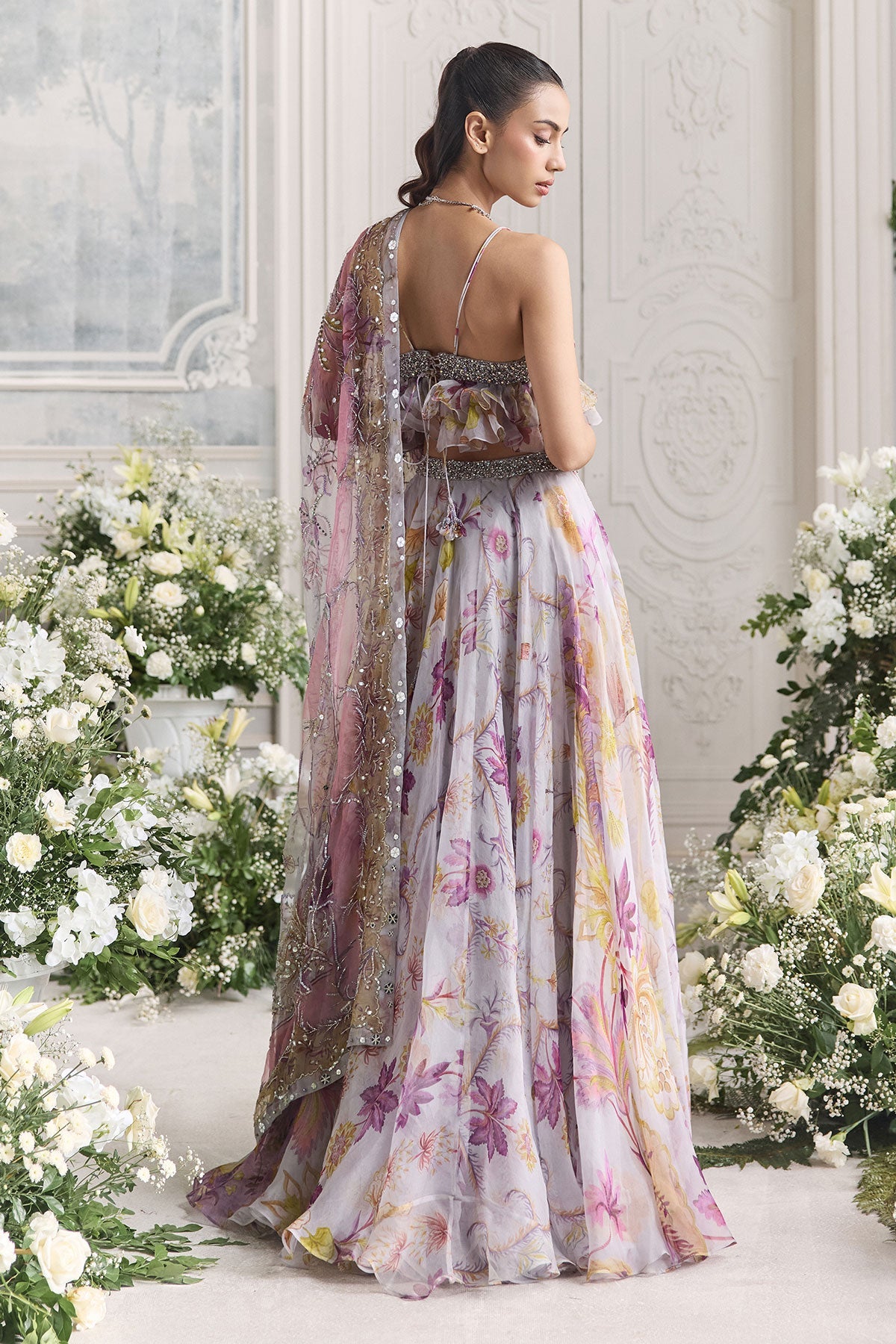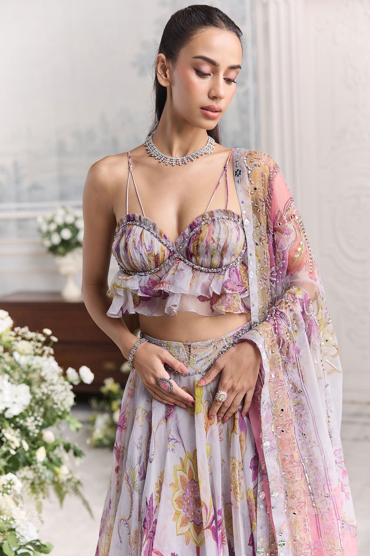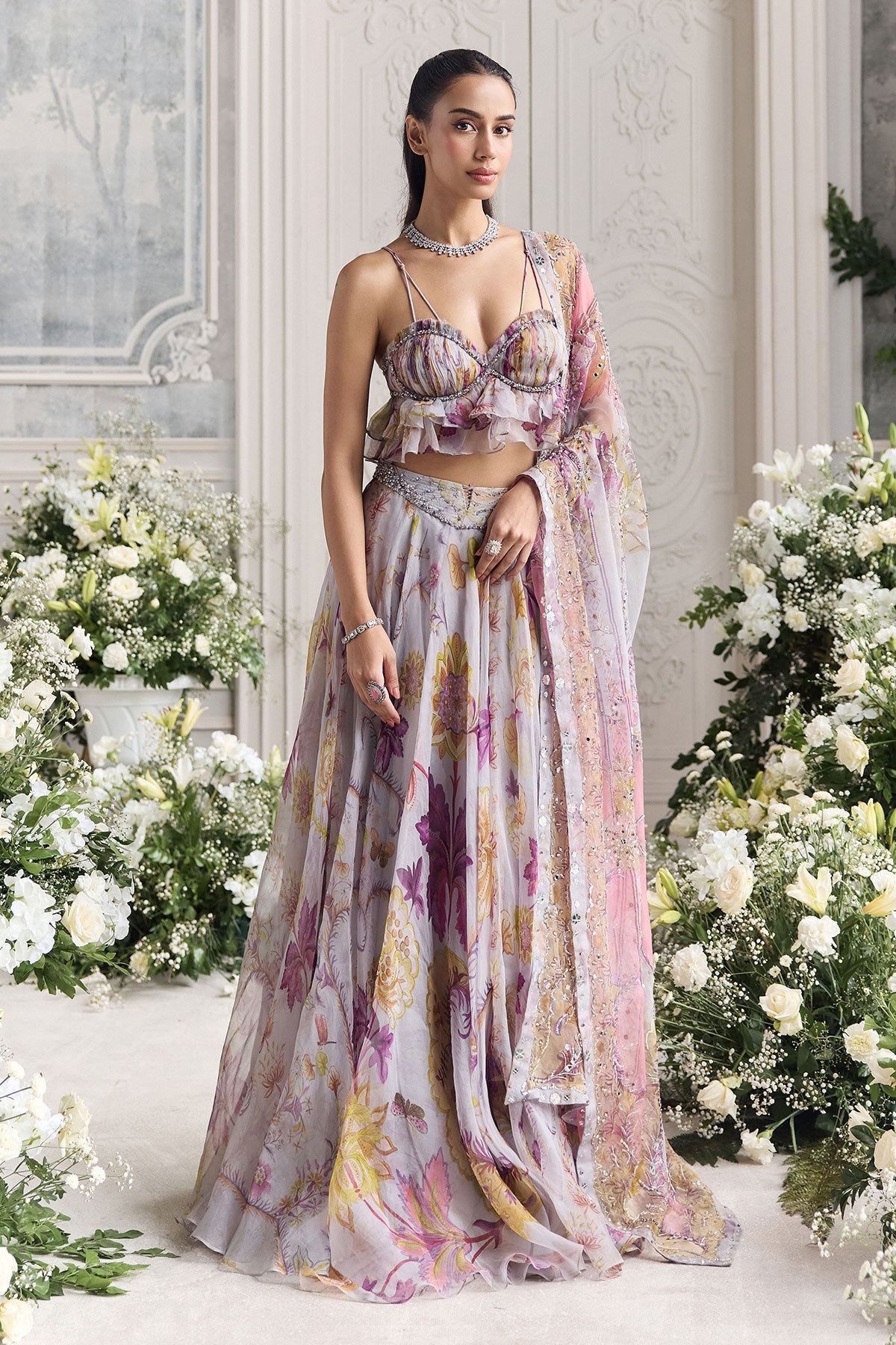 'Iman' is from Fanah collection by Mahima Mahajan. RUFFLED BUSTIER PEPLUM TOP PAIRED WITH HEAVY CHUNNI AND FLORAL LEHENGA
