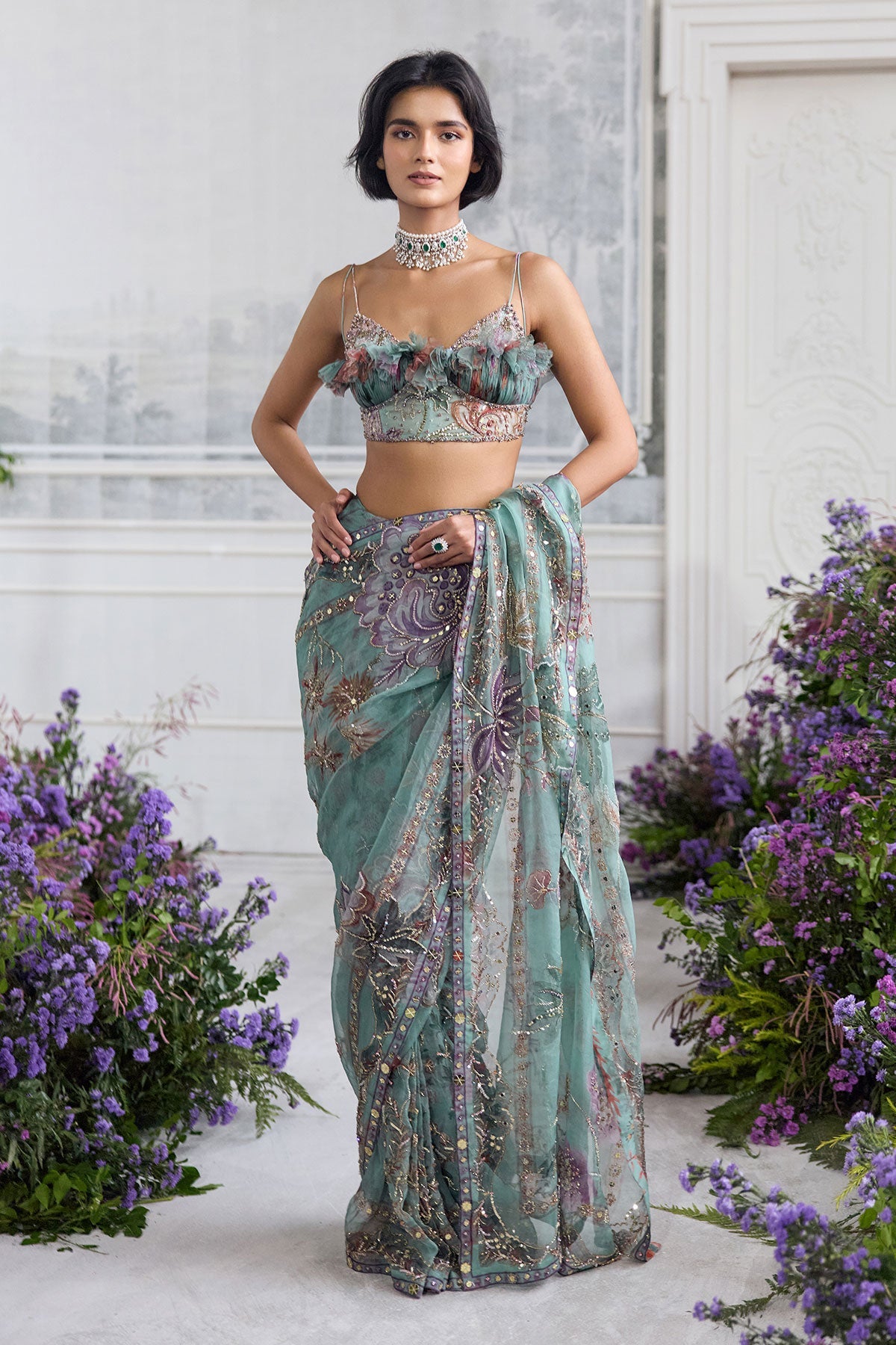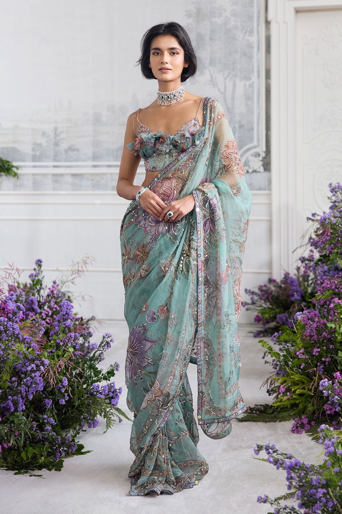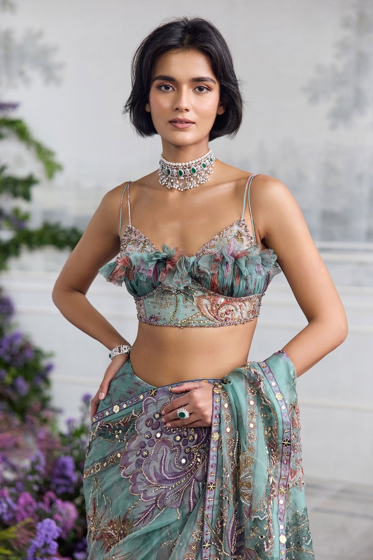'Ishika' is from Fanah collection by Mahima Mahajan. HAND EMBROIDERED RUFFLED BLOUSE PAIRED WITH EMBROIDERED PREDRAPED SAREE