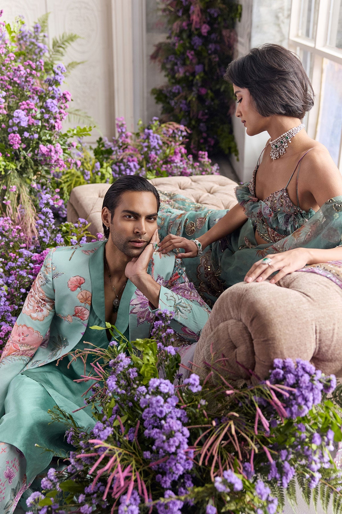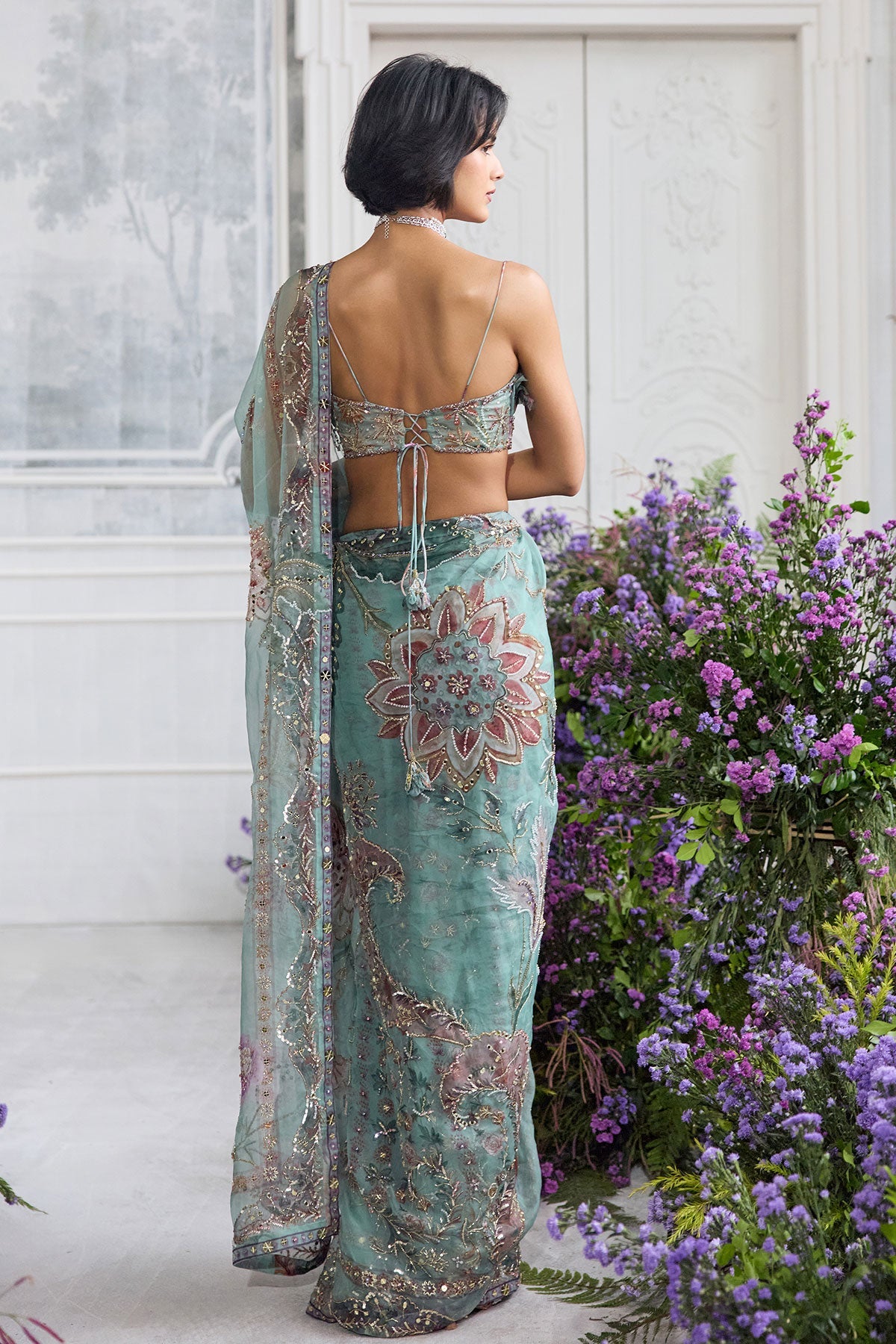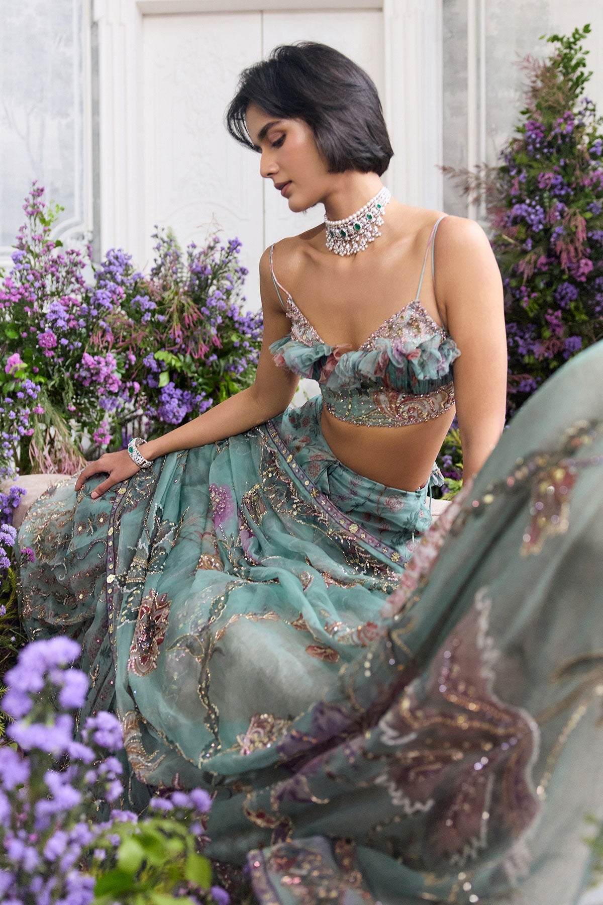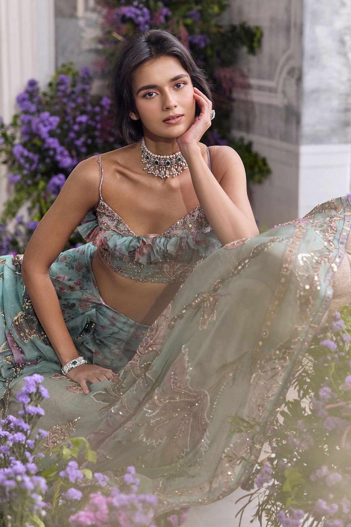 'Ishika' is from Fanah collection by Mahima Mahajan. HAND EMBROIDERED RUFFLED BLOUSE PAIRED WITH EMBROIDERED PREDRAPED SAREE