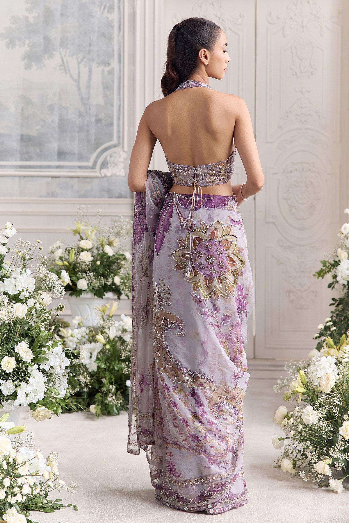 'Lina' is from Fanah collection by Mahima Mahajan. EMBROIDERED HALTER NECK BLOUSE PAIRED WITH EMBROIDERED PREDRAPED SAREE