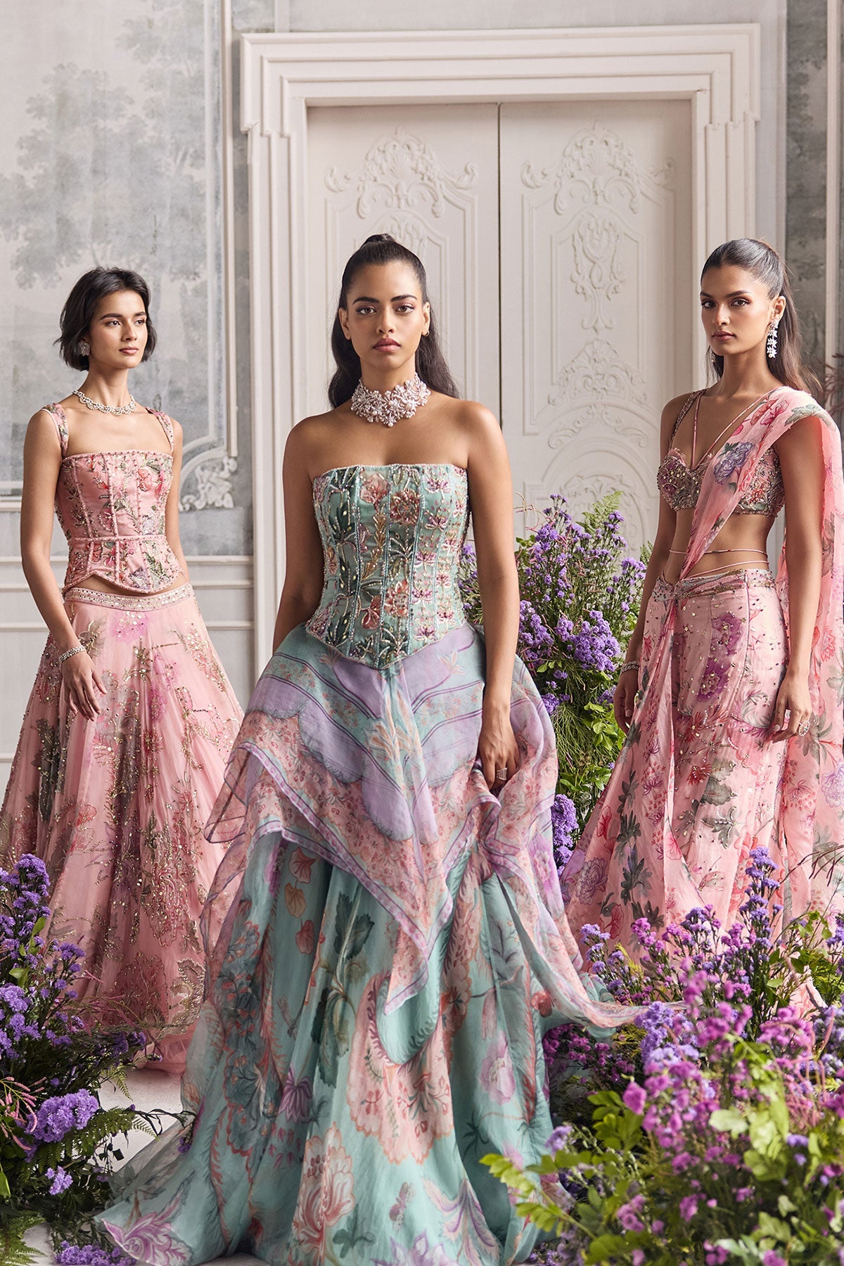 'Manushi Chhillar In Shakira' is from Fanah collection by Mahima Mahajan. HAND EMBROIDERED CORSET TOP PAIRED WITH FLORAL ASYMMETRICAL SKIRT