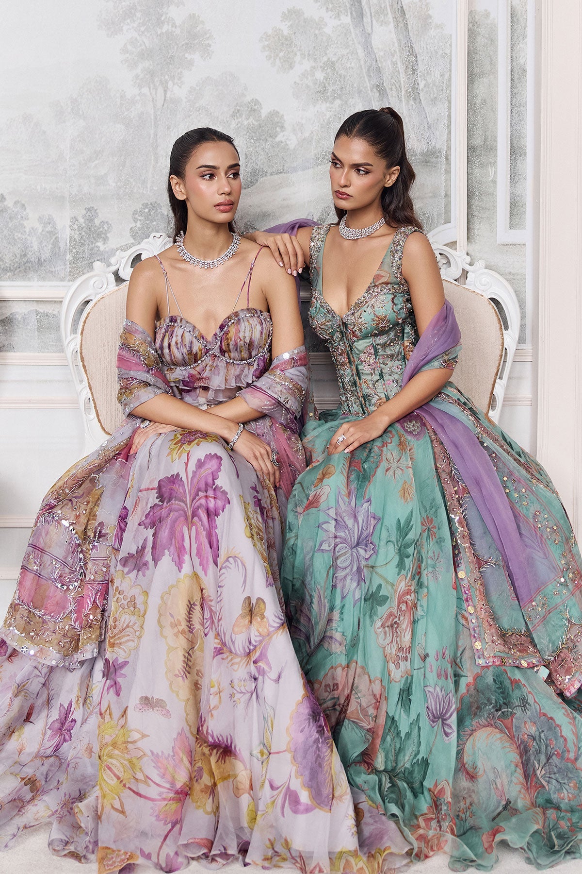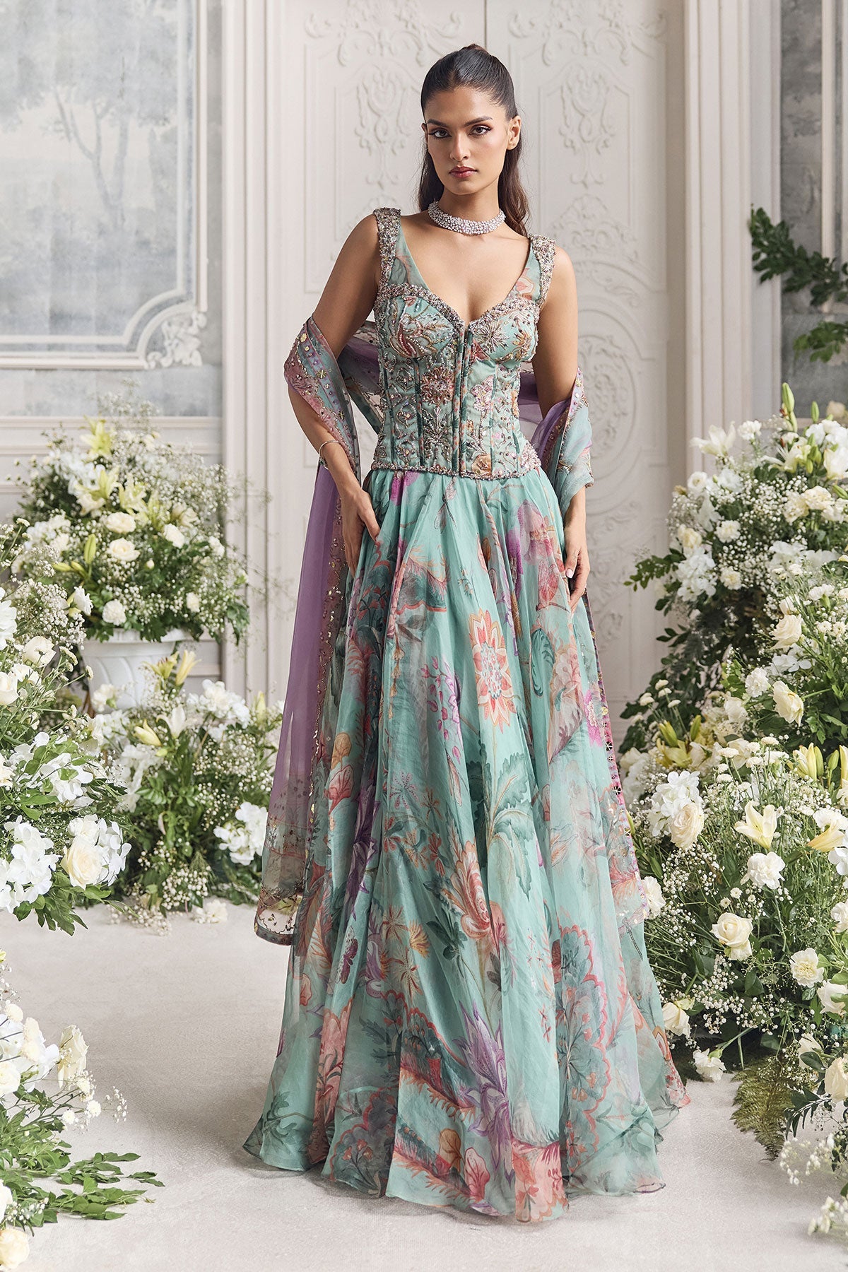 'Samira' is from Fanah collection by Mahima Mahajan. HAND EMBROIDERED CORSET ANARKALI PAIRED WITH EMBROIDERED DUPTTA