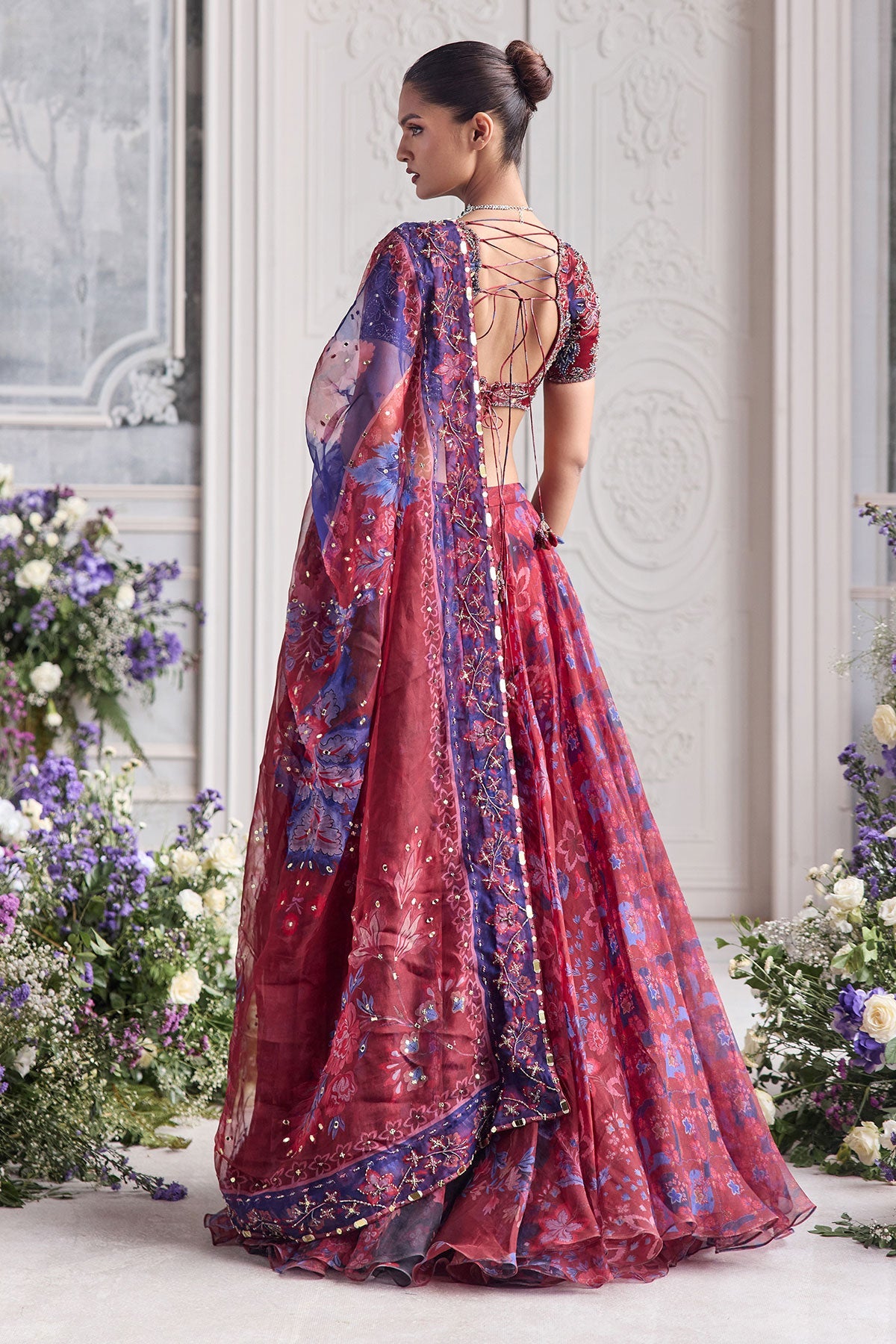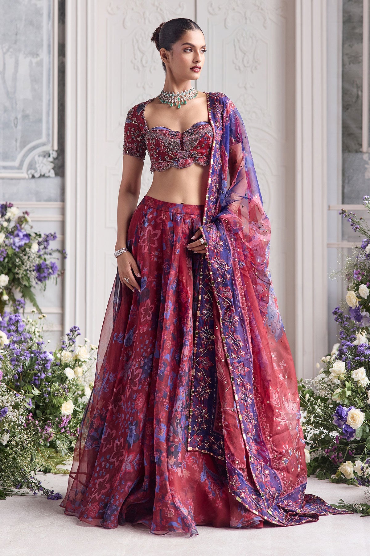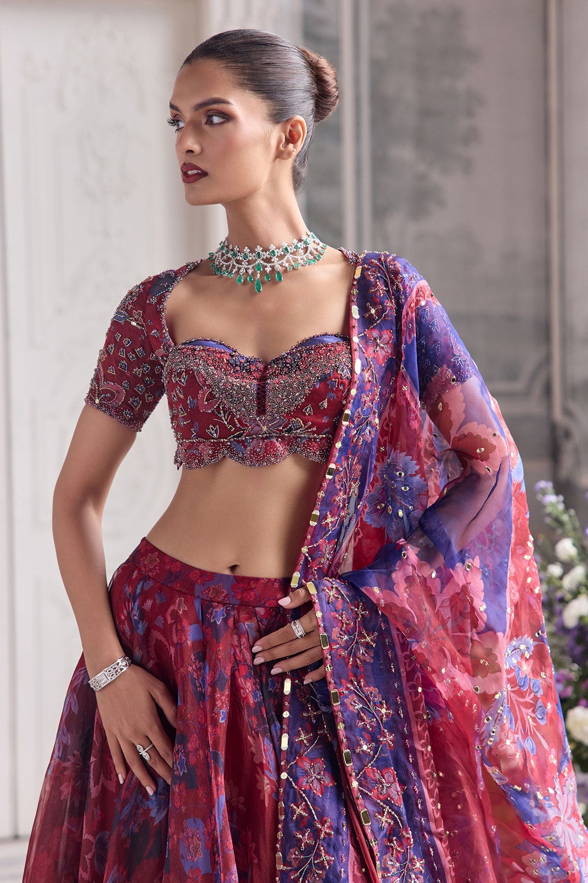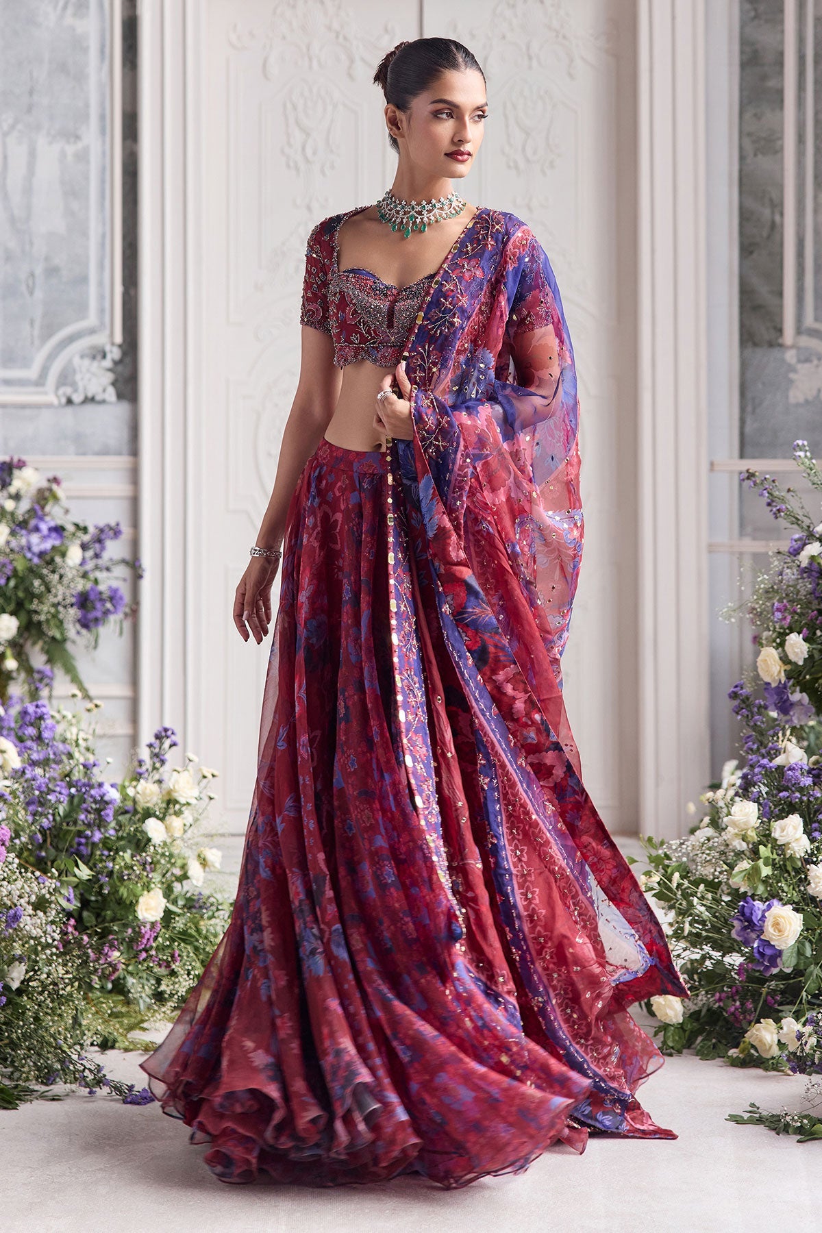 'Shasha' is from Fanah collection by Mahima Mahajan. EMBROIDERED SCALLOPED BLOUSE PAIRED WITH EMBROIDERED DUPATTA AND FLORAL LEHENGA