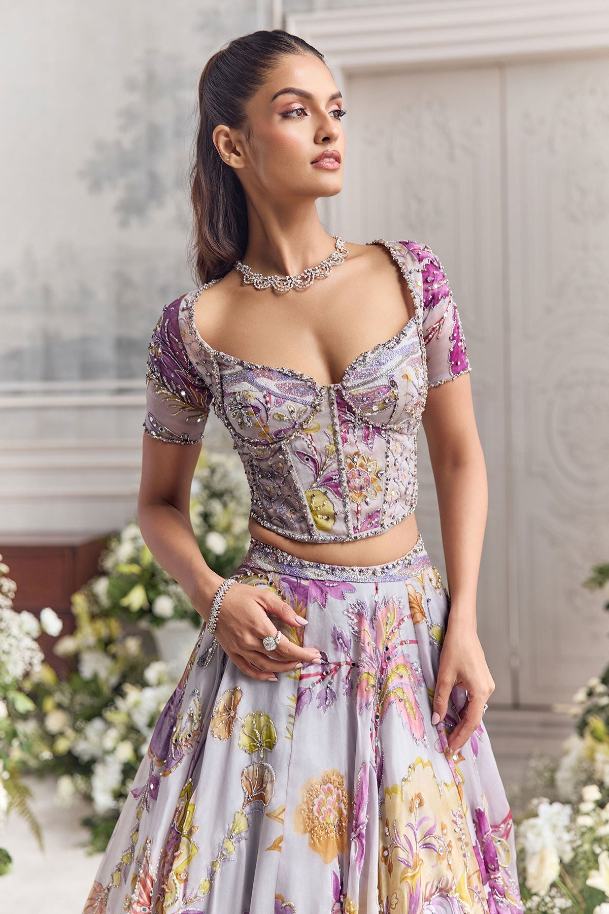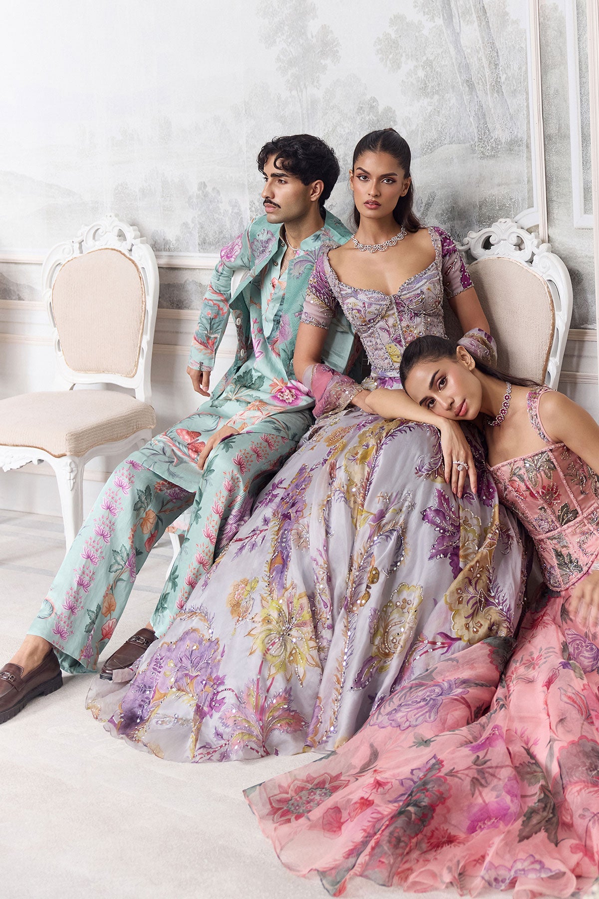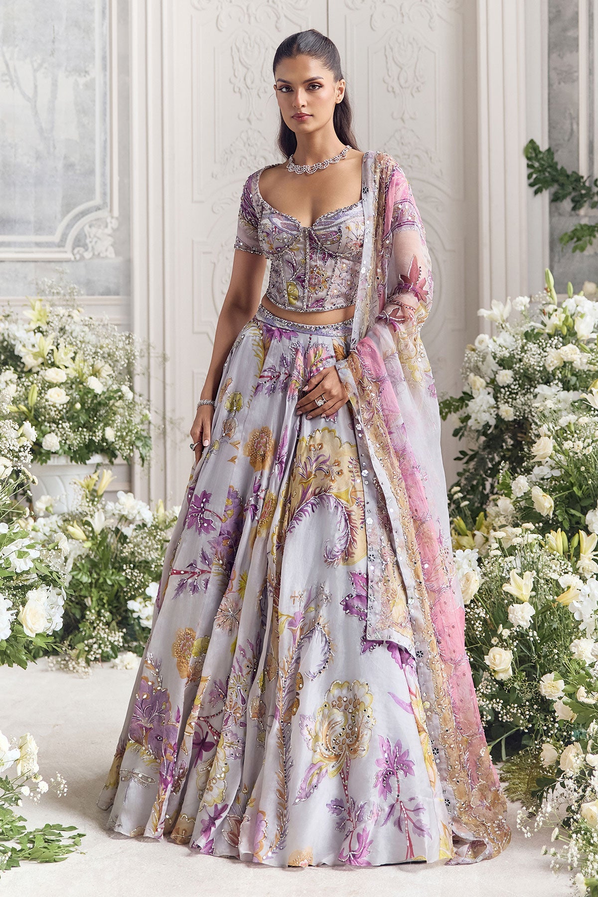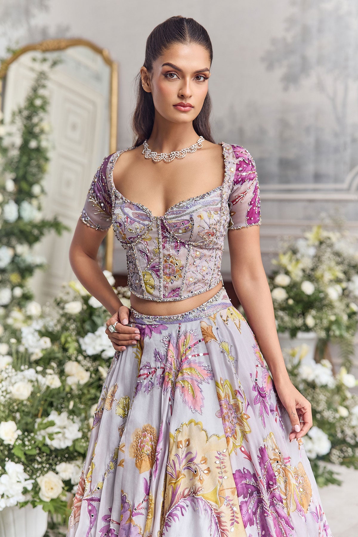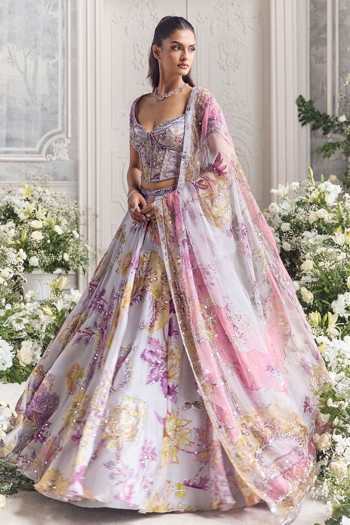'Wafiya' is from Fanah collection by Mahima Mahajan. SLEEVED CORSET BLOUSE PAIRED WITH EMBROIDERED DUPATTA AND LEHENGA
