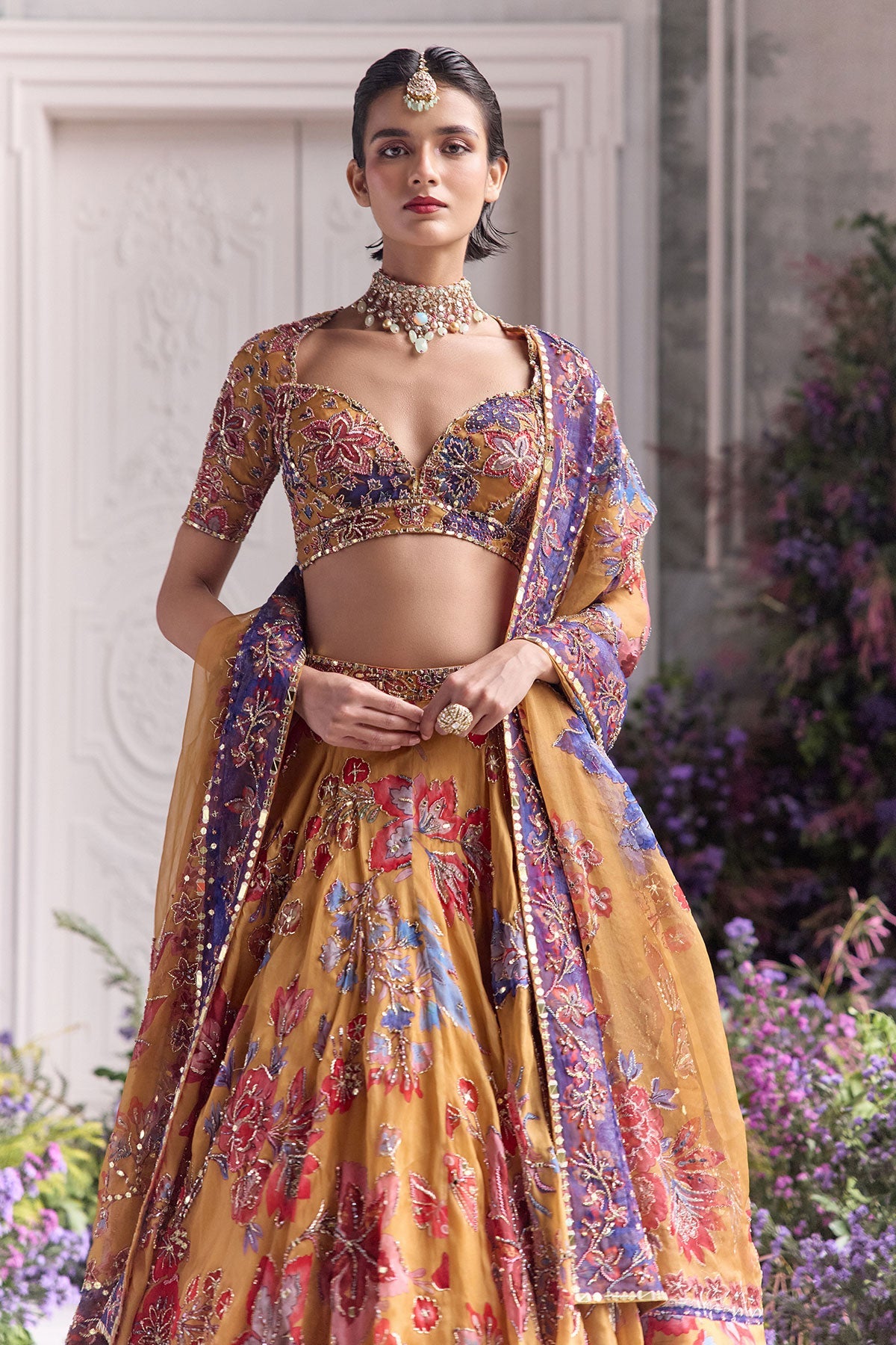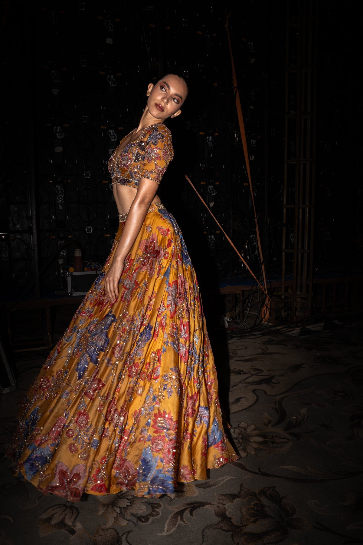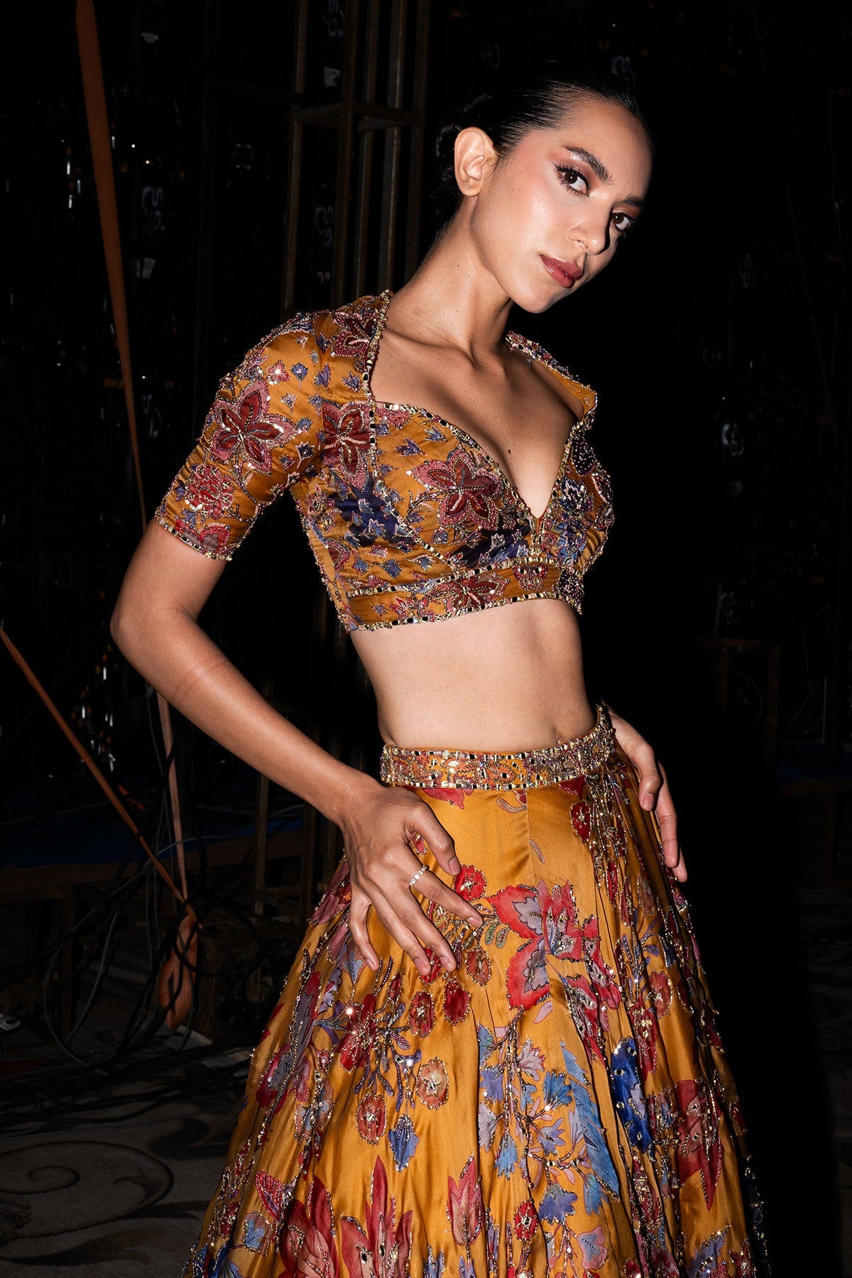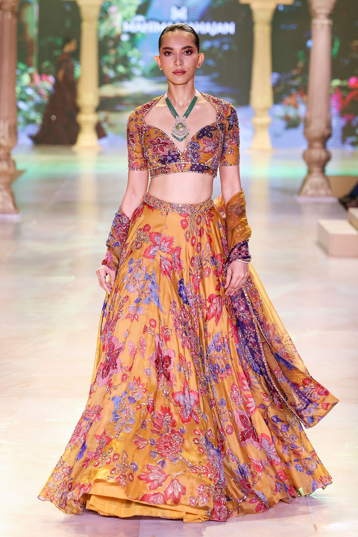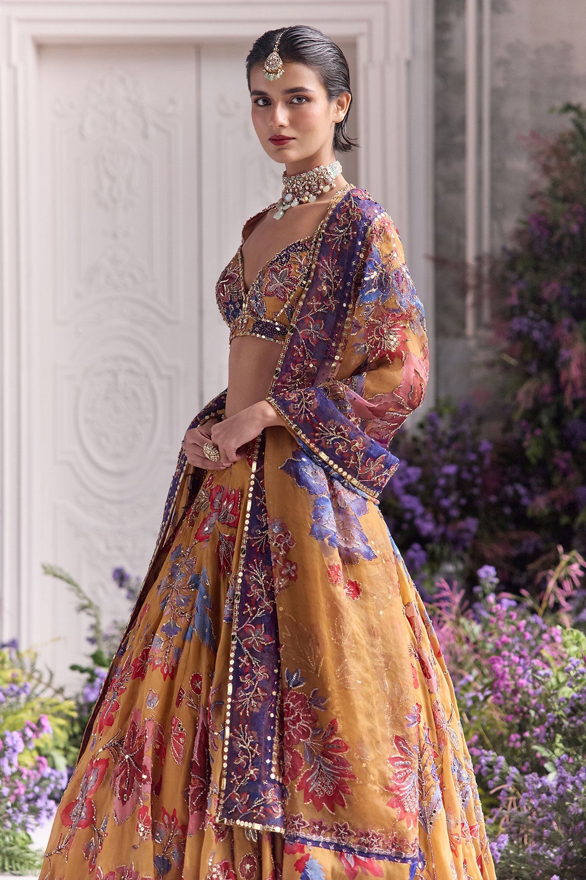 'Zena' is from Fanah collection by Mahima Mahajan. HAND EMBROIDERED CHOLI CUT BLOUSE PAIRED WITH HEAVY EMBROIDERED LEHENGA AND DUPATTA