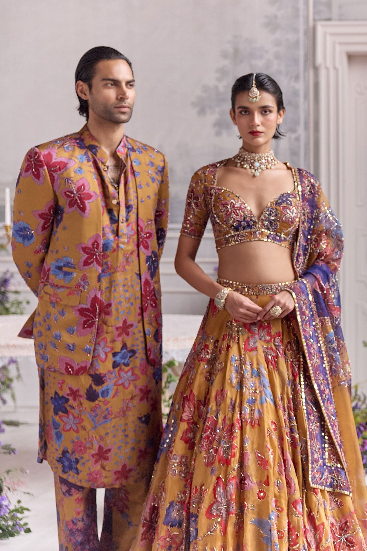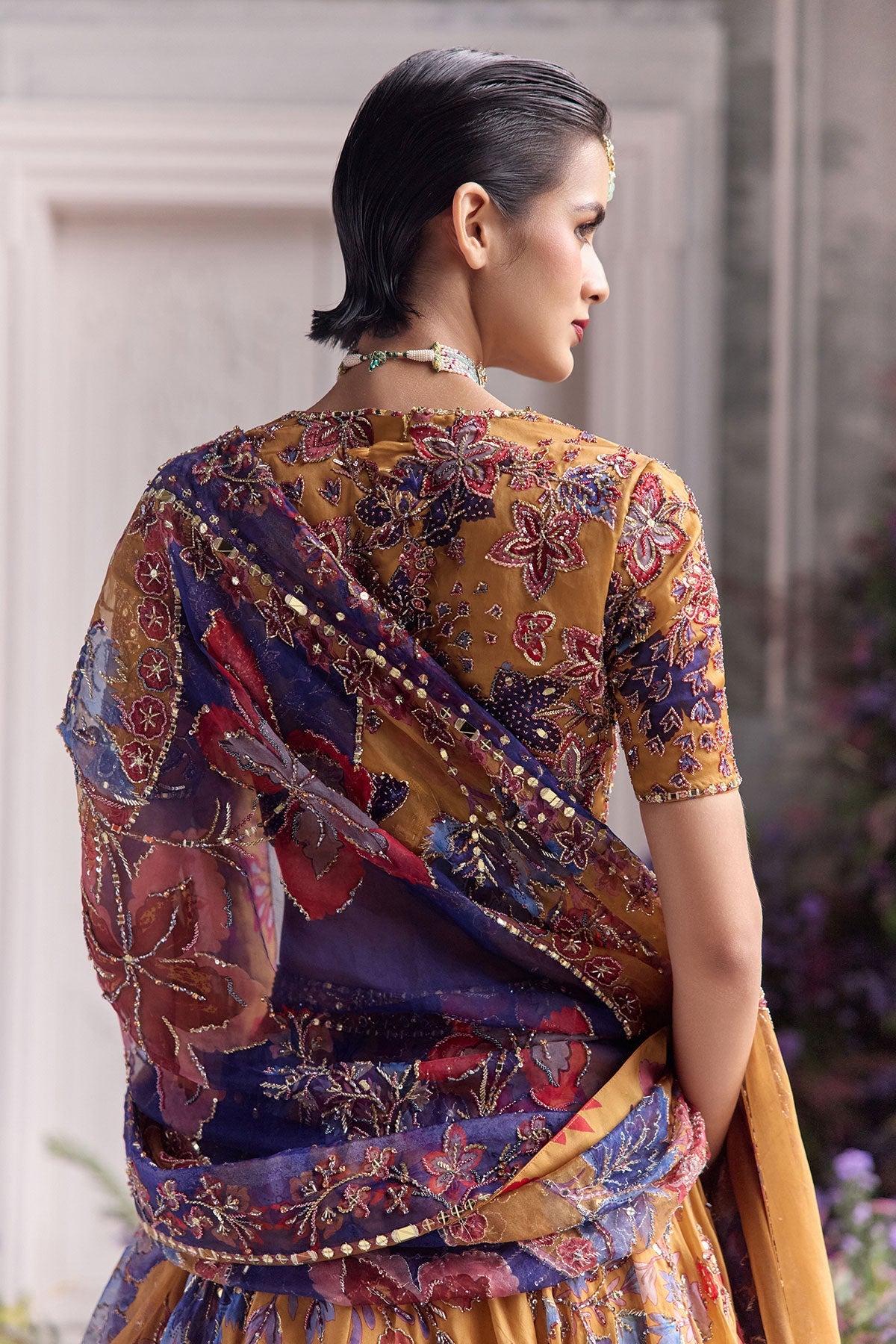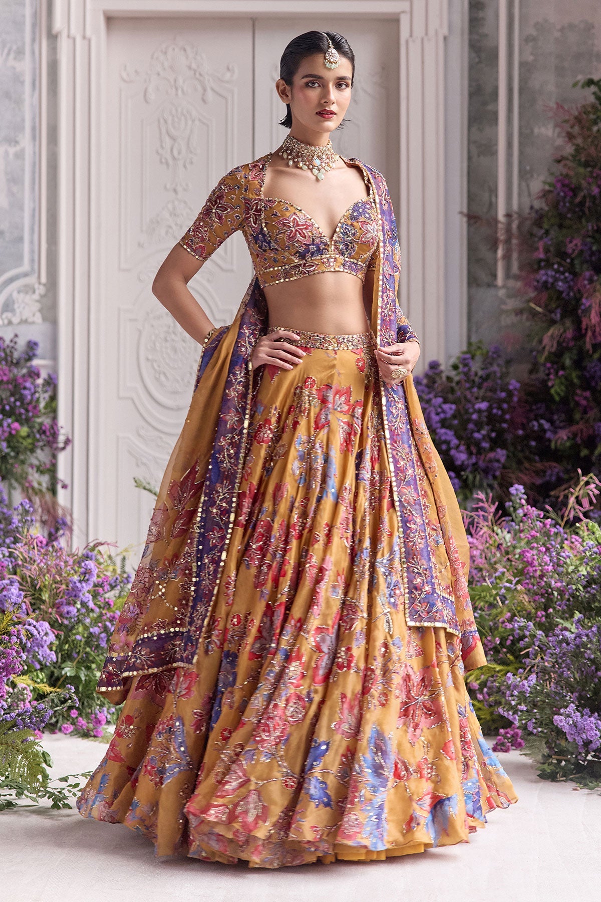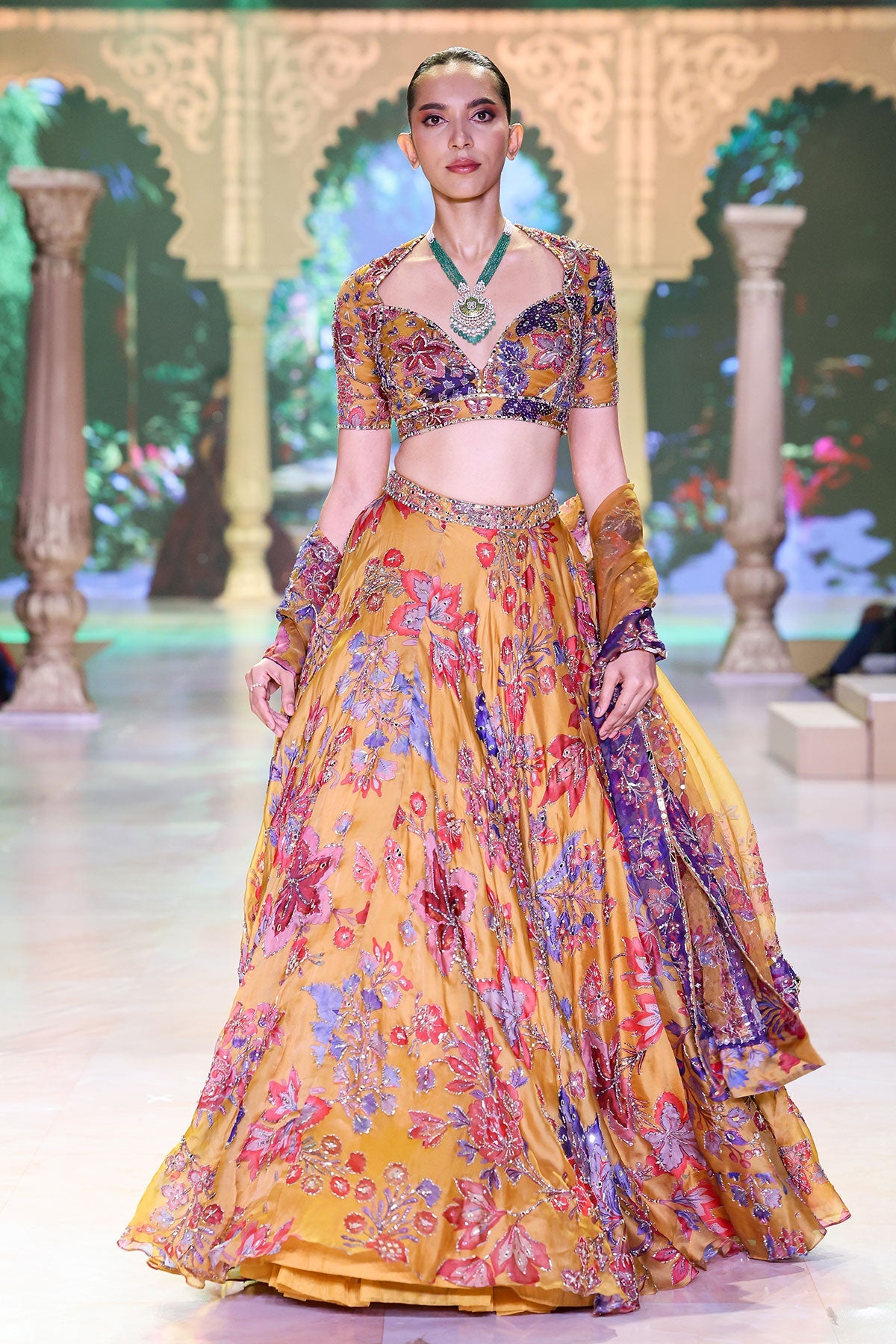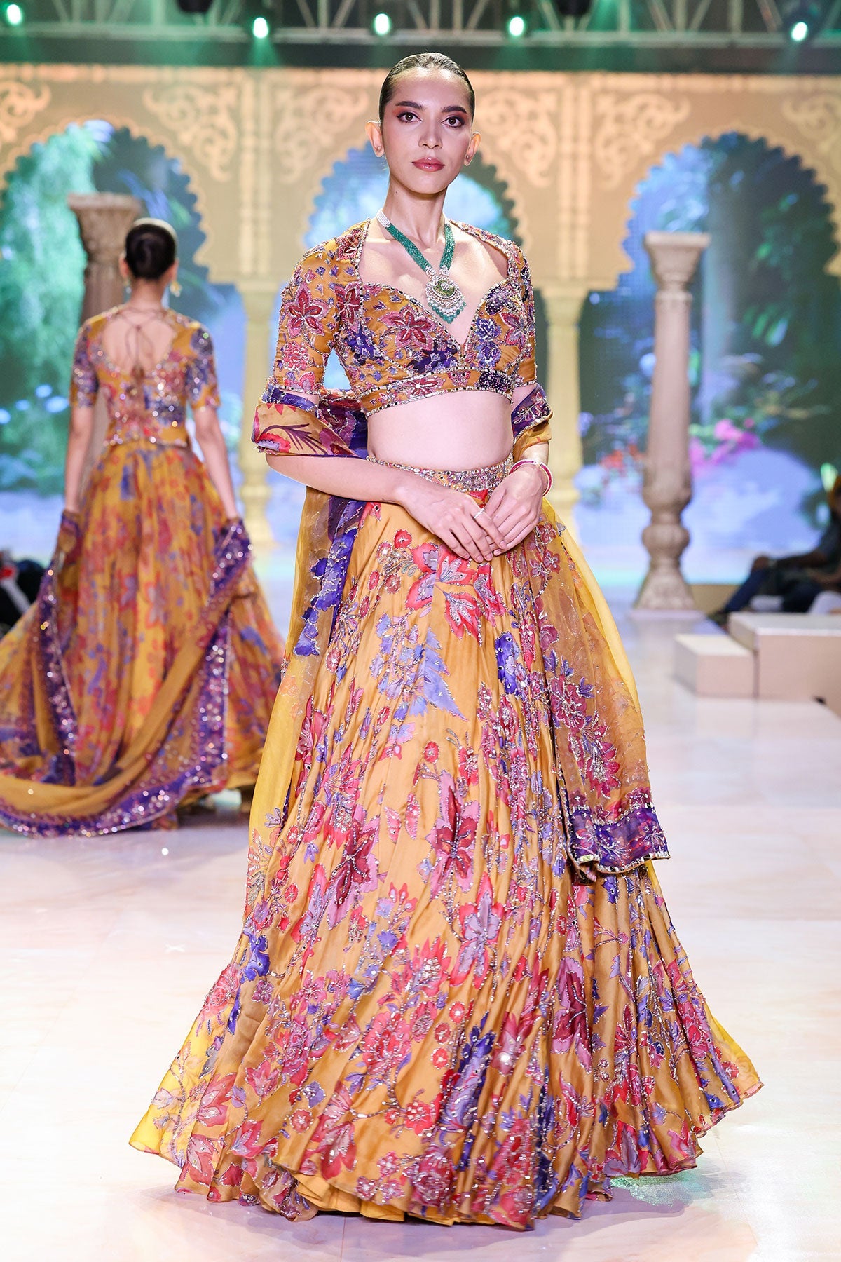 'Zena' is from Fanah collection by Mahima Mahajan. HAND EMBROIDERED CHOLI CUT BLOUSE PAIRED WITH HEAVY EMBROIDERED LEHENGA AND DUPATTA