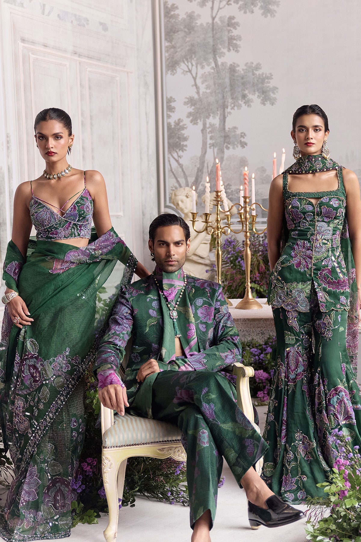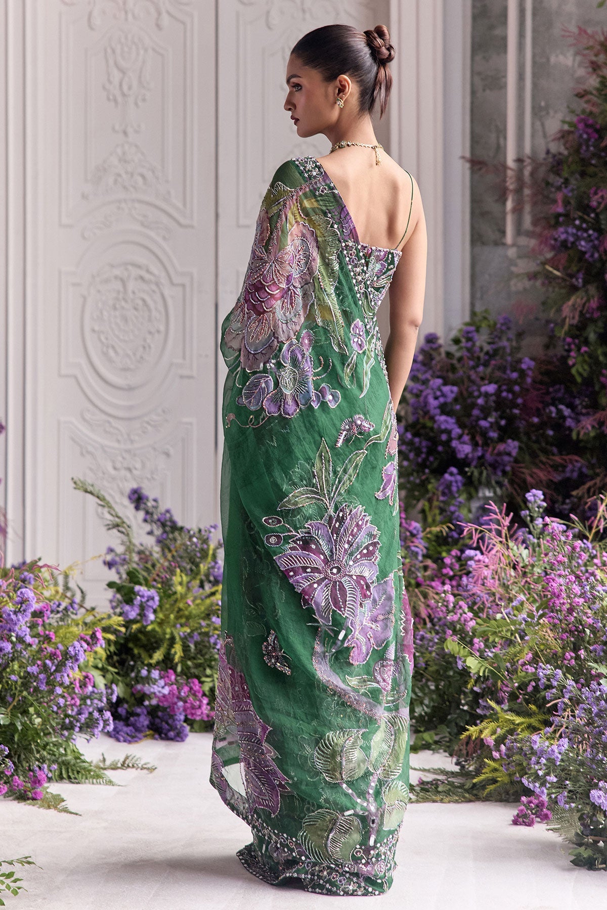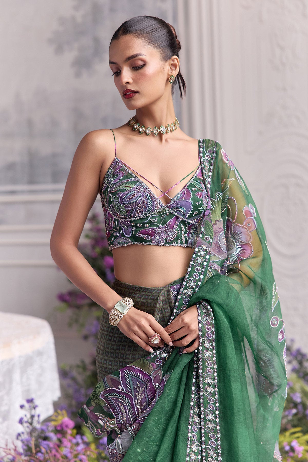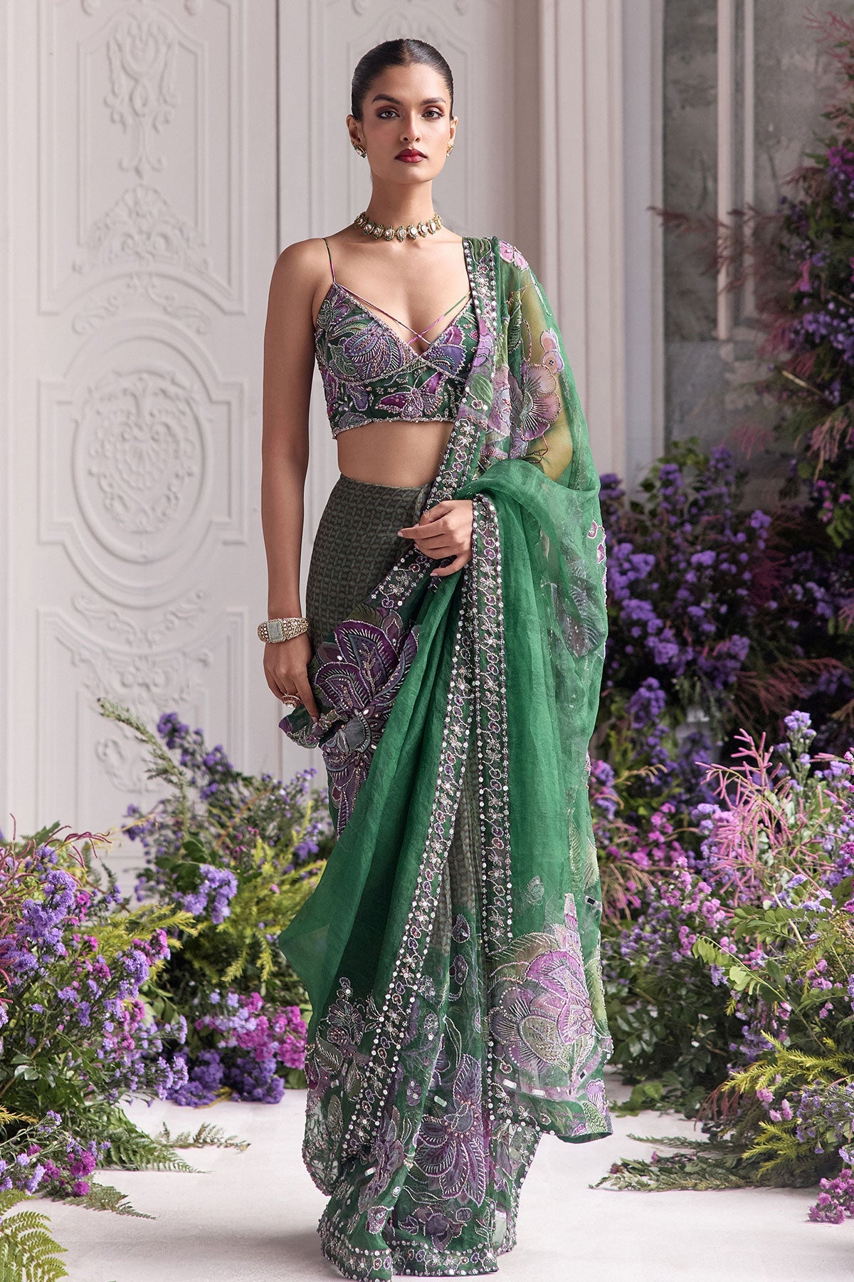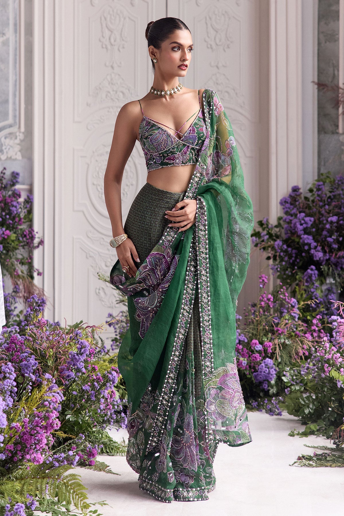 'Zumra' is from Fanah collection by Mahima Mahajan. HEAVY HAND EMBROIDERED PER-DRAPED SAREE WITH HAND EMBROIDERED STRAPY BLOUSE