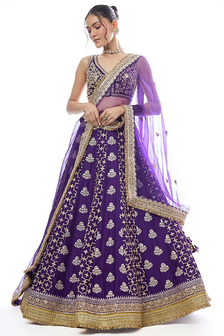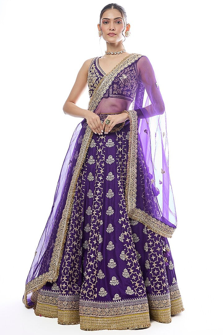 'Ayat Lehenga Set' is from Nizaam collection by Gopi Vaid. This exquisite lehenga set is a true bridal masterpiece, featuring a heavily embroidered blouse with intricate embellishments that highlight its plunging neckline. The voluminous lehenga is richly adorned with ornate motifs and a detailed embroidered hemline, exuding grandeur and elegance. A sheer matching dupatta with scattered motifs and an intricately bordered edge drapes gracefully.