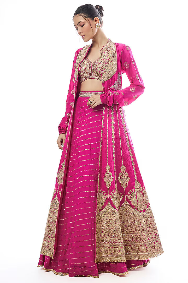 The ensemble features a flared lehenga with diagonal striped patterns and intricately embroidered panels creating a rich and regal appeal. It is paired with a heavily embellished blouse showcasing delicate embroidery and a matching long jacket-style overlay that adds grandeur to the look.