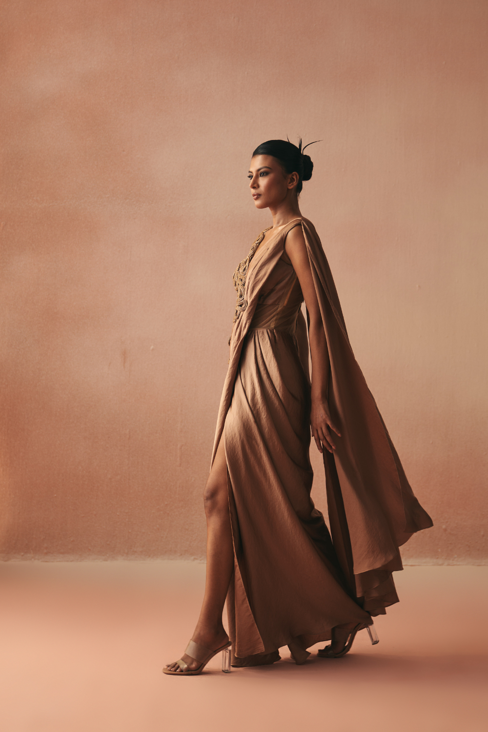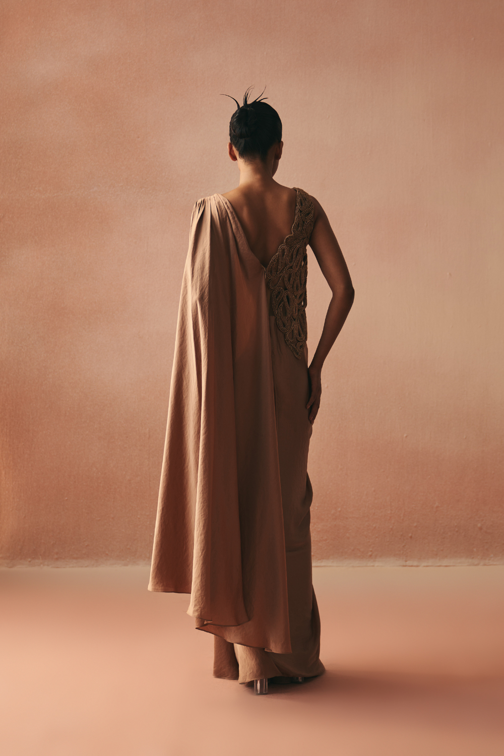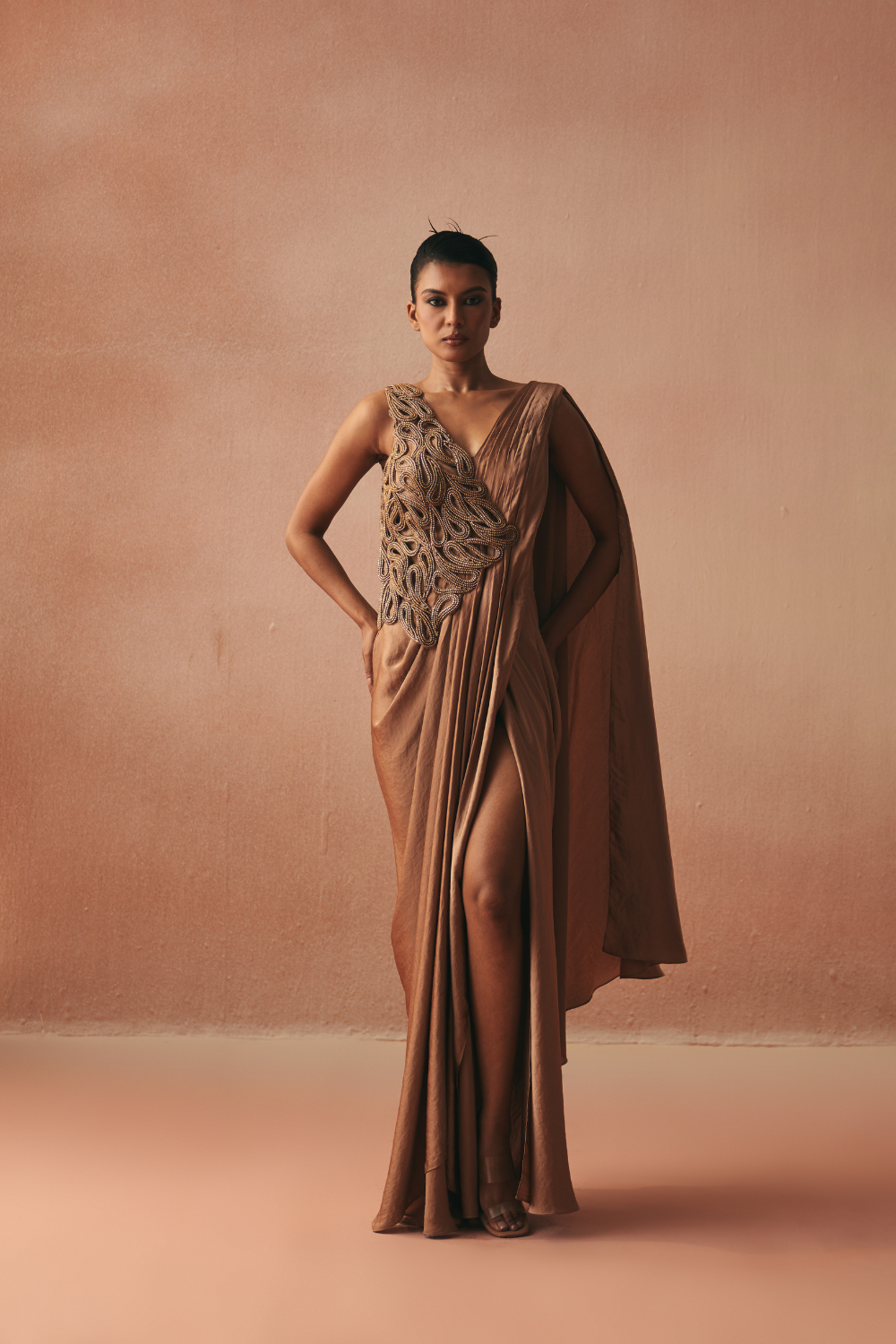 'Cinta' is from Gown collection by Kamaali Couture. Classic Kamaali look of a beautifully draped Sari gown with a pleated pallu detail and one side jacket style 3D cording embroidery .