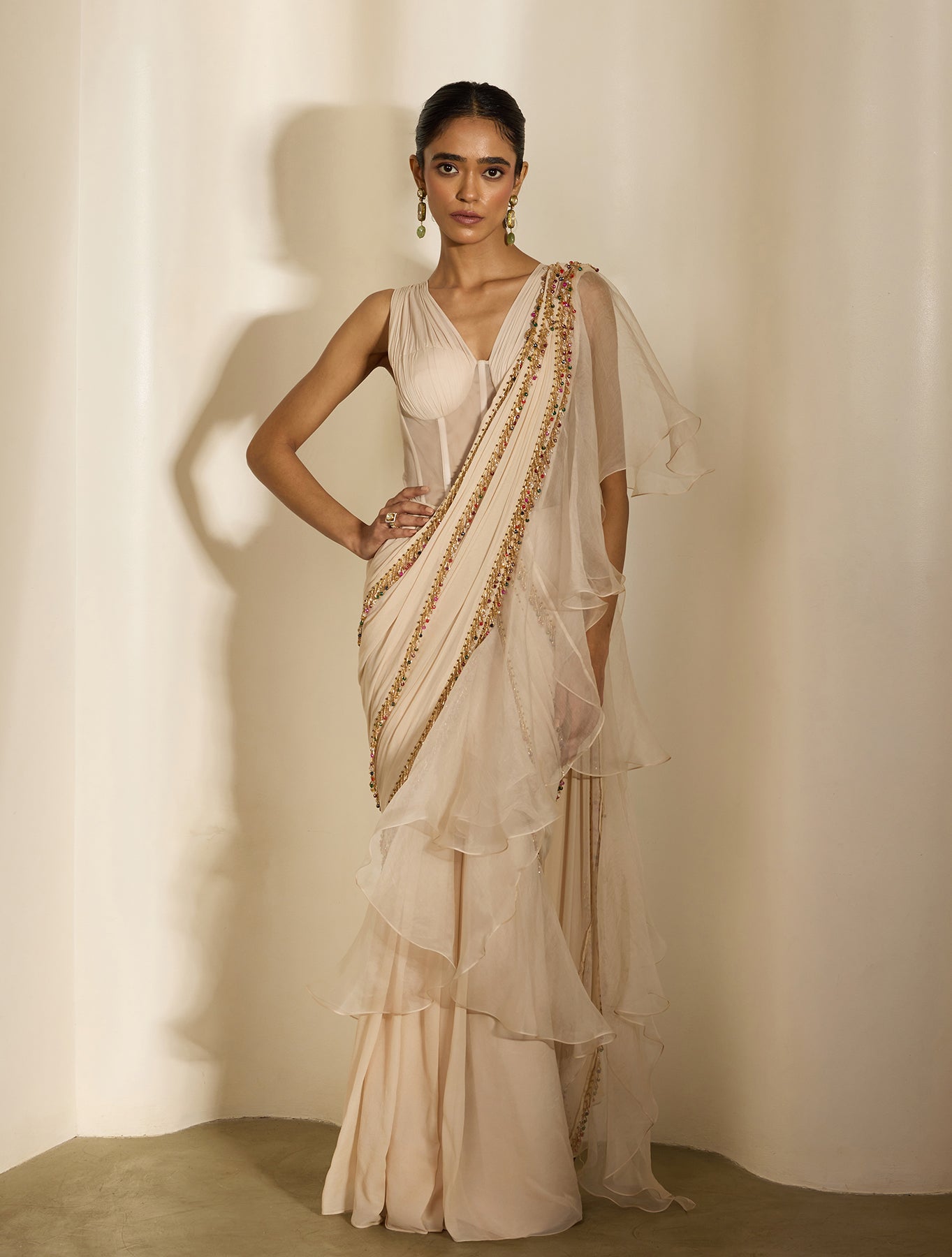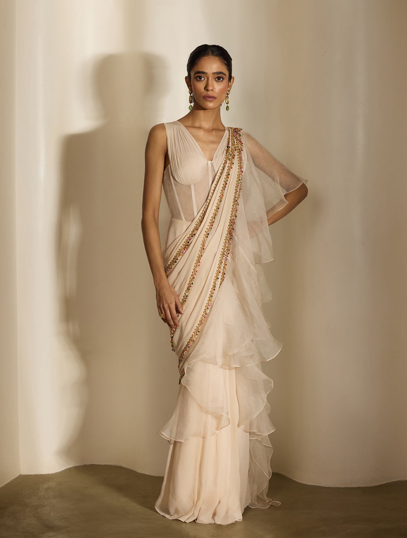 'Clara' is from Nirvana collection by Shloka Khialani. Ecru sari gown featuring a corset netted sheer waist bodice & draped georgette top. With an attached dual fabric pallu featuring gold & mix colored tassel embroidery.