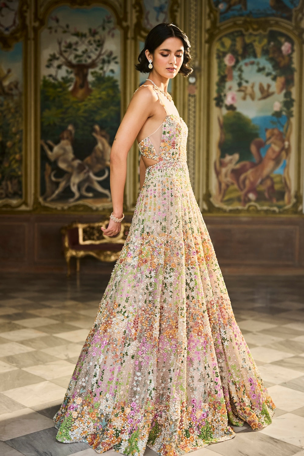 'Nude Multi-Coloured Floral Gown' is from A Theatrical Evening collection by Seema Gujral. This gown features multi-coloured thread embroidery in a floral pattern on a nude base. It is further highlighted with tonal sequins, beads and pearls. The bodice has a plunging neckline and a low back.