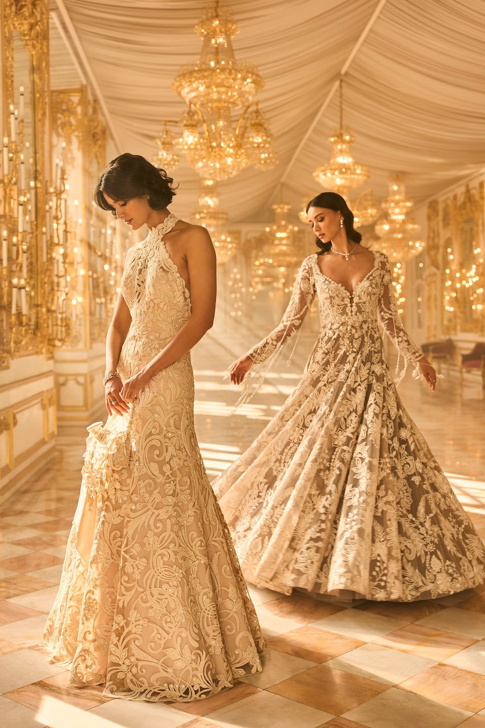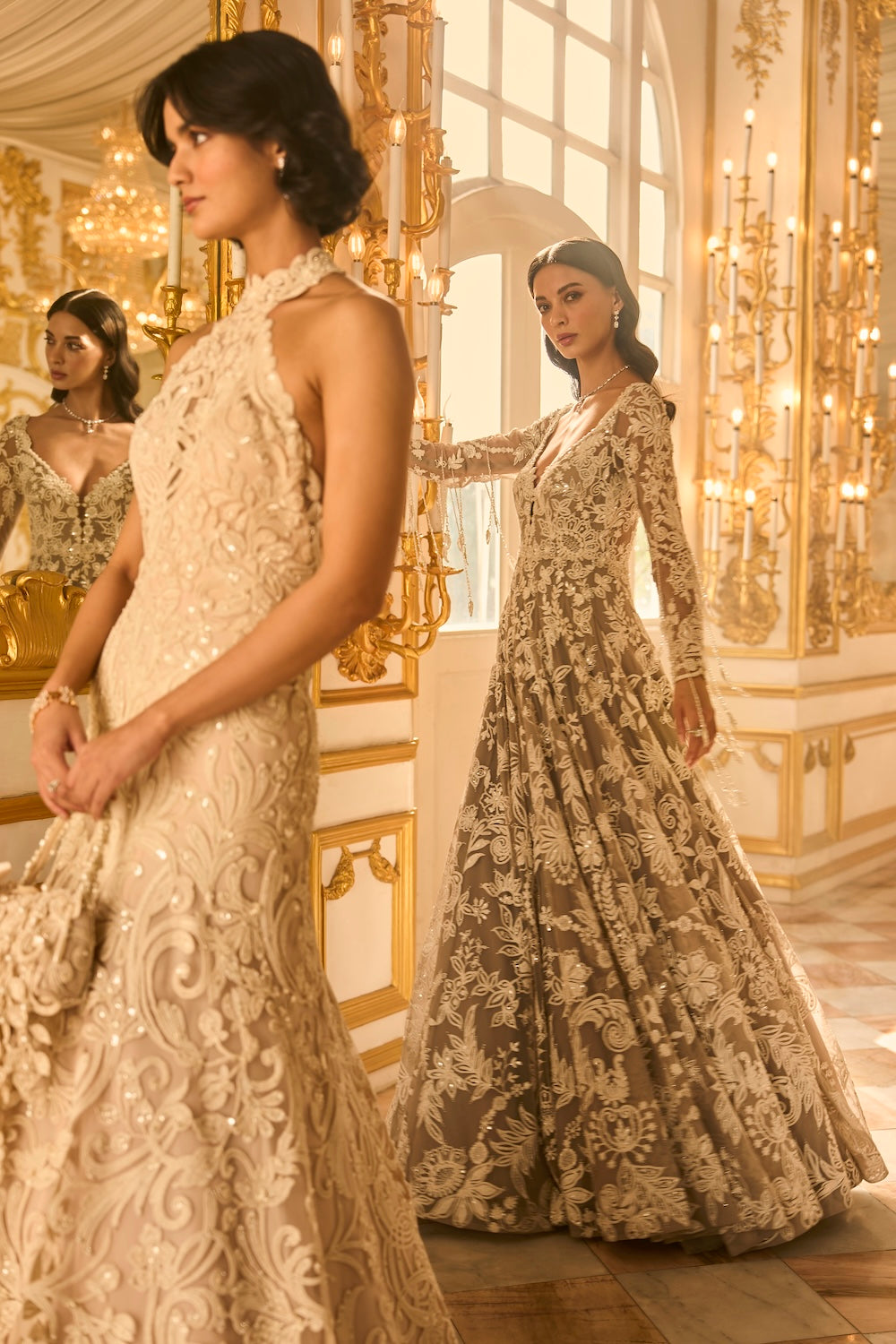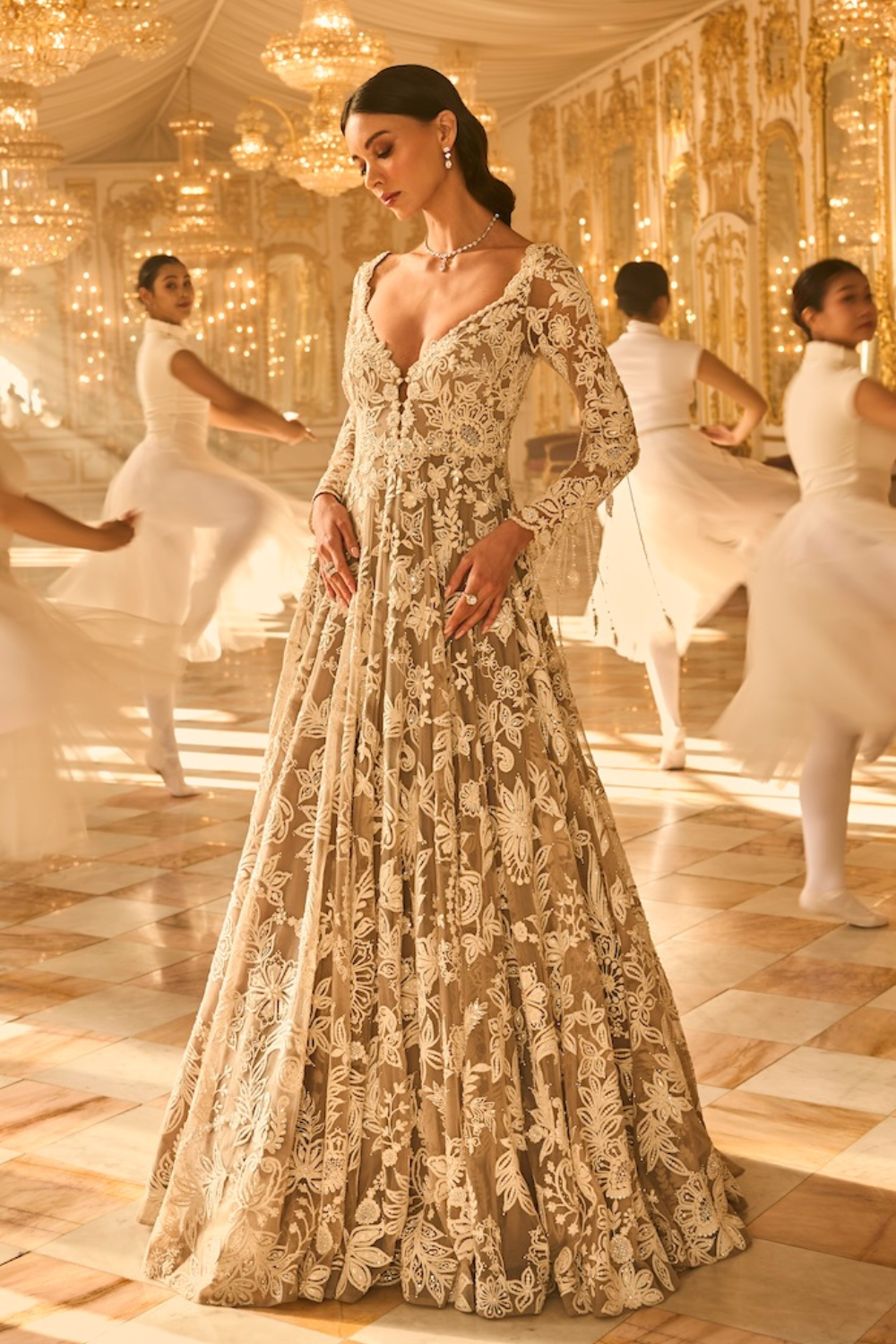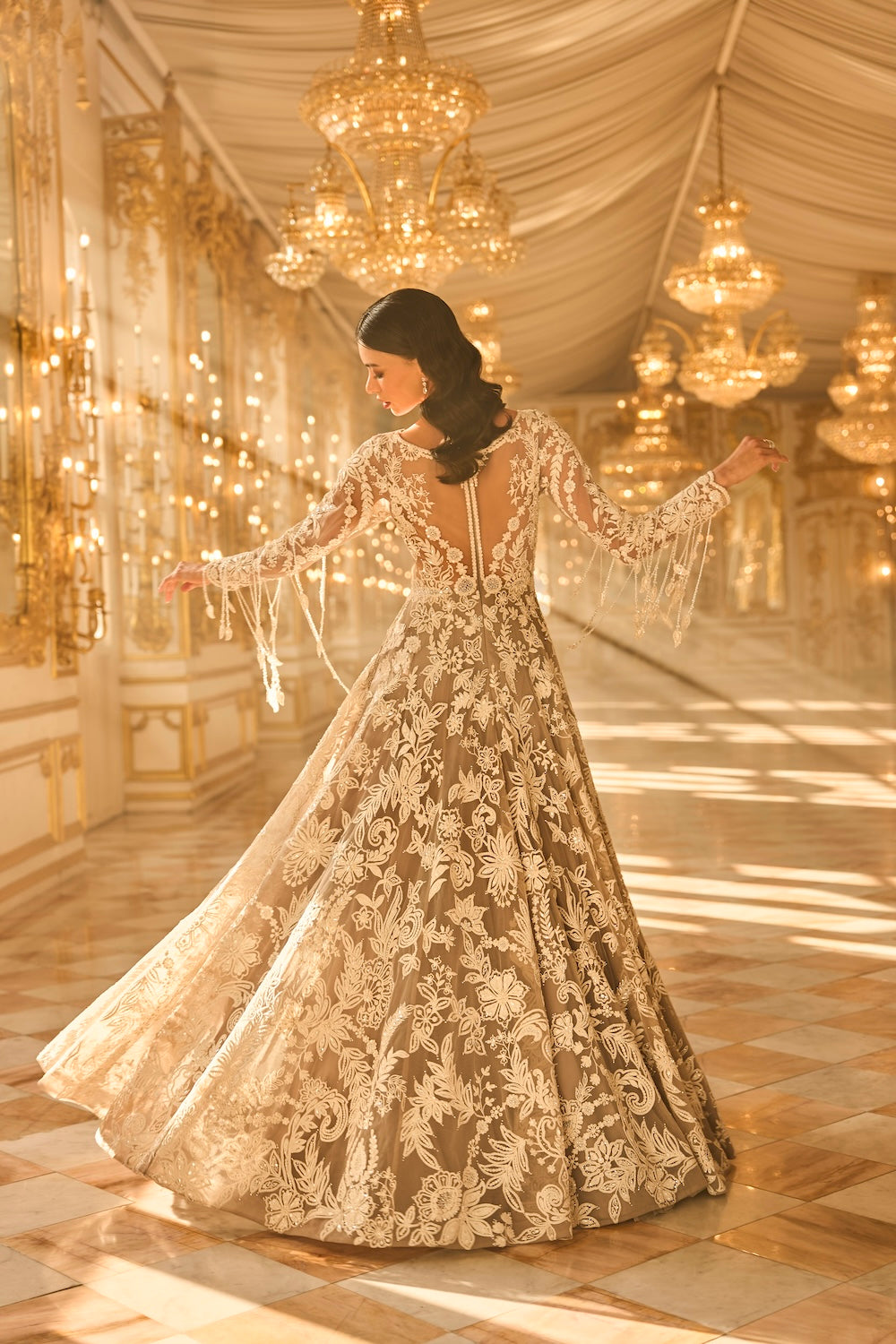 'Slate Grey Floral Gown' is from A Theatrical Evening collection by Seema Gujral. This slate grey gown features ivory thread, sequin and pearl embroidery in a floral pattern. The full sleeves bodice has a plunging neckline along with scalloped detailing. The outfit shows exaggerated tassels on the sleeves.