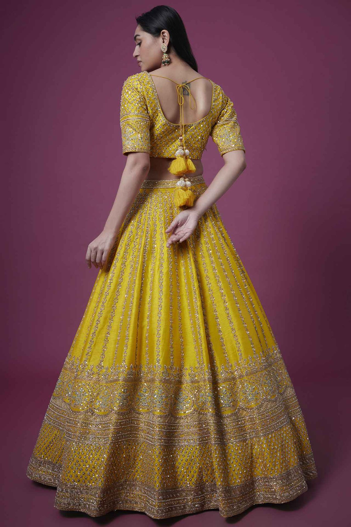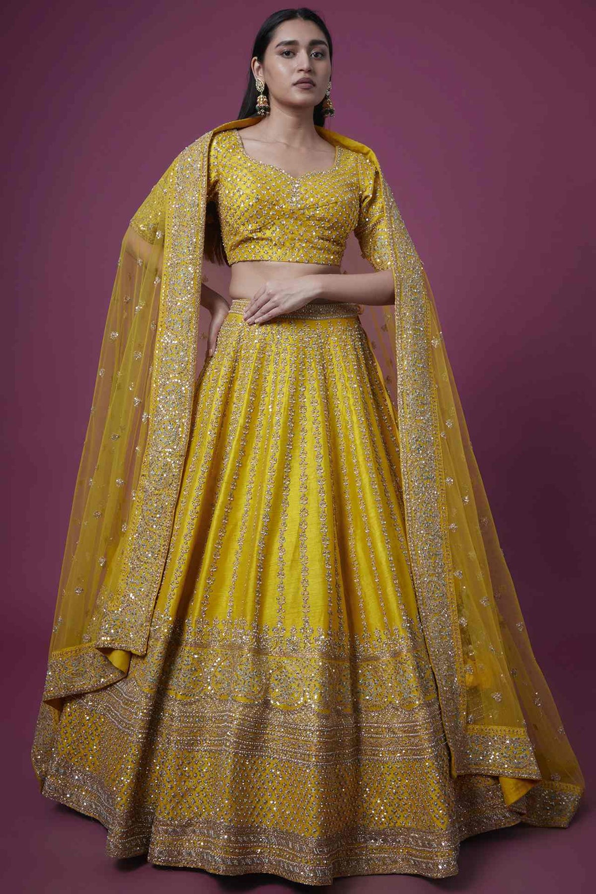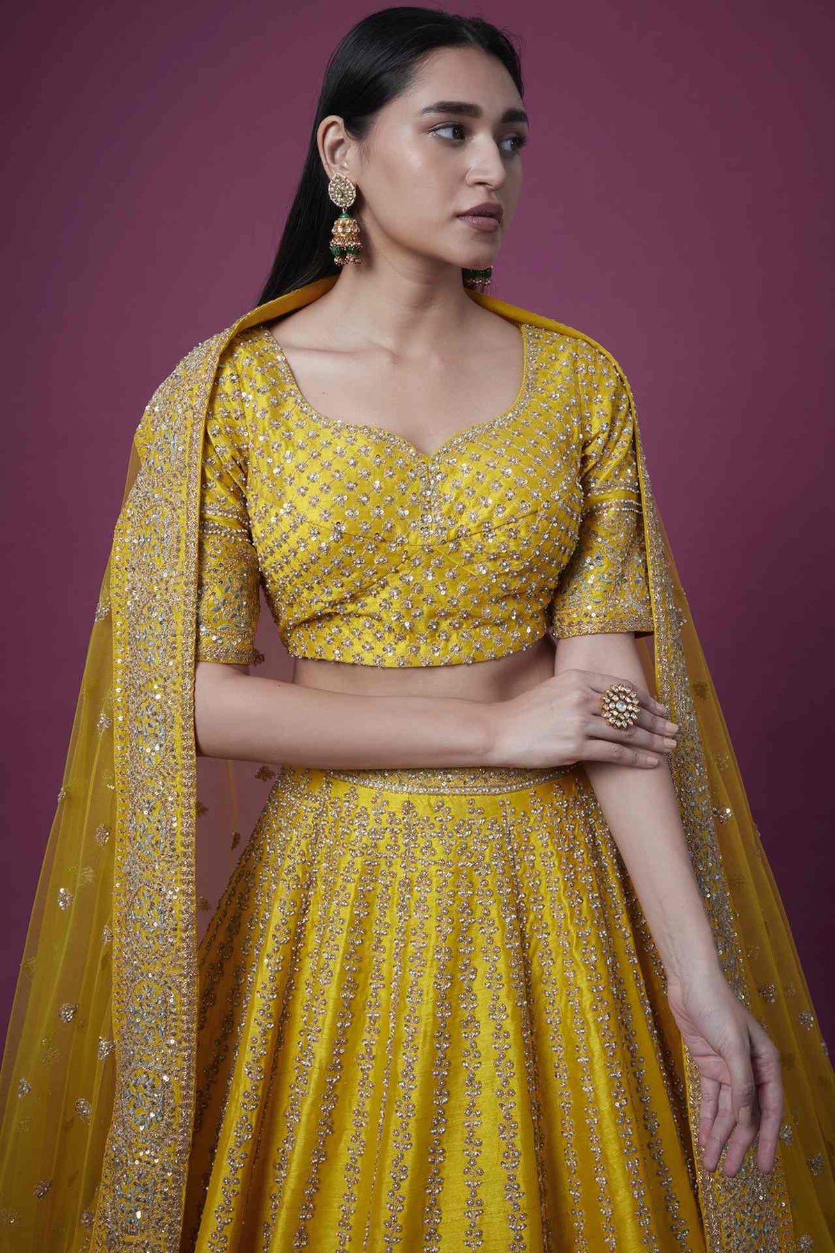 'Yellow Embroidered Aster Lehenga Set' is from Atheral collection by Kalighata. Featuring A Yellow Lehenga In Raw Silk Base With Zardosi Embroidery. It Is Paired With Matching Embroidered Blouse And A Dupatta.