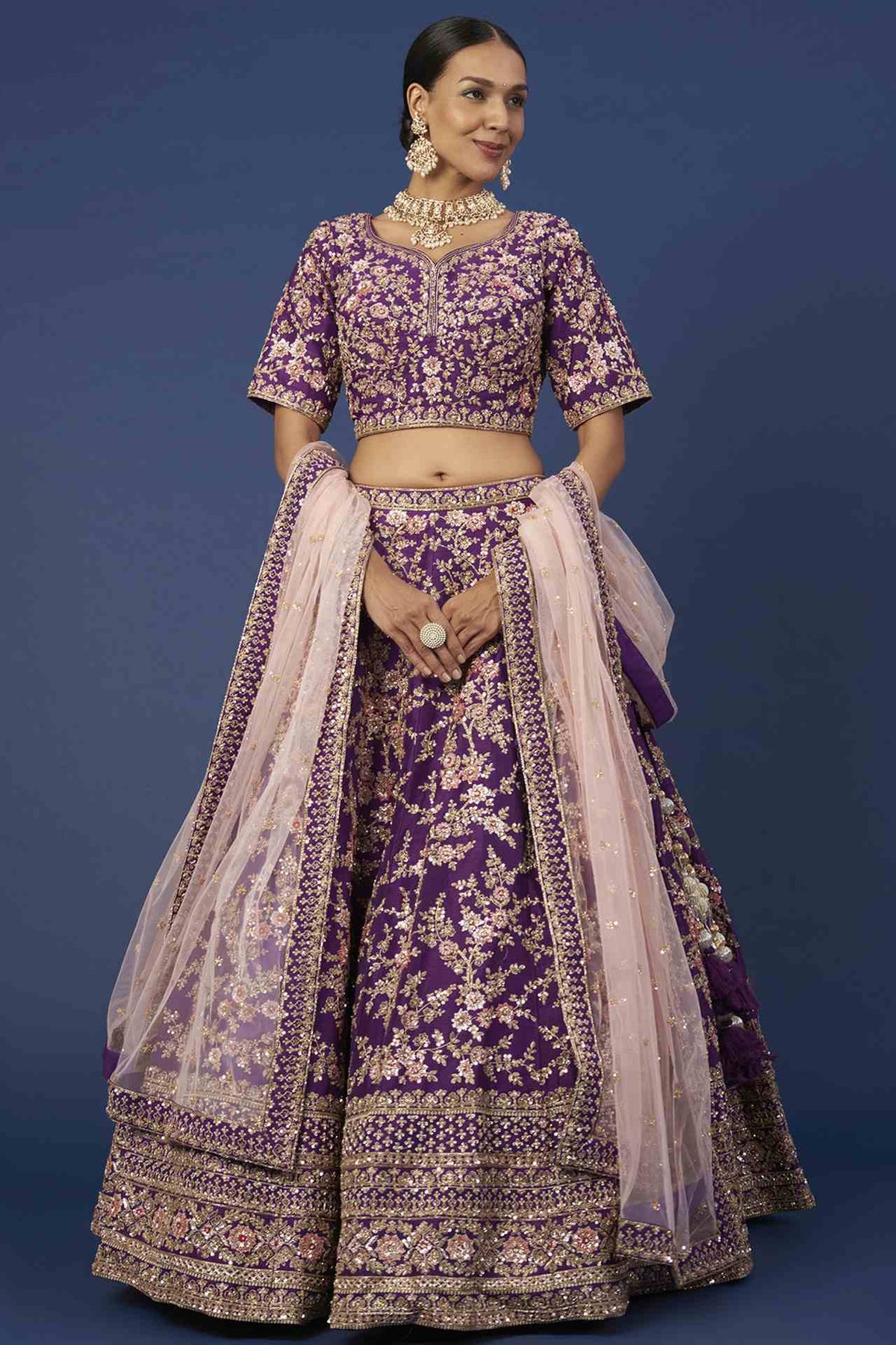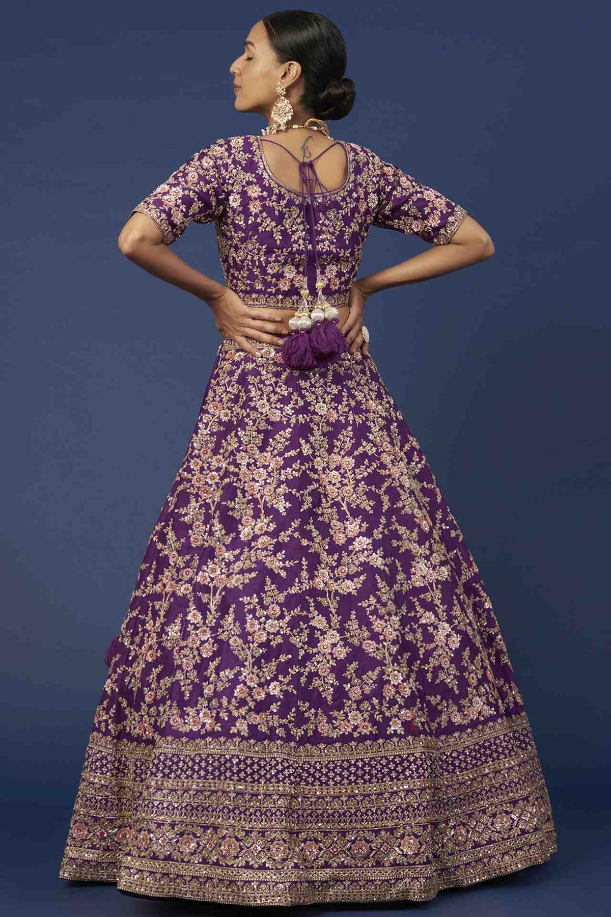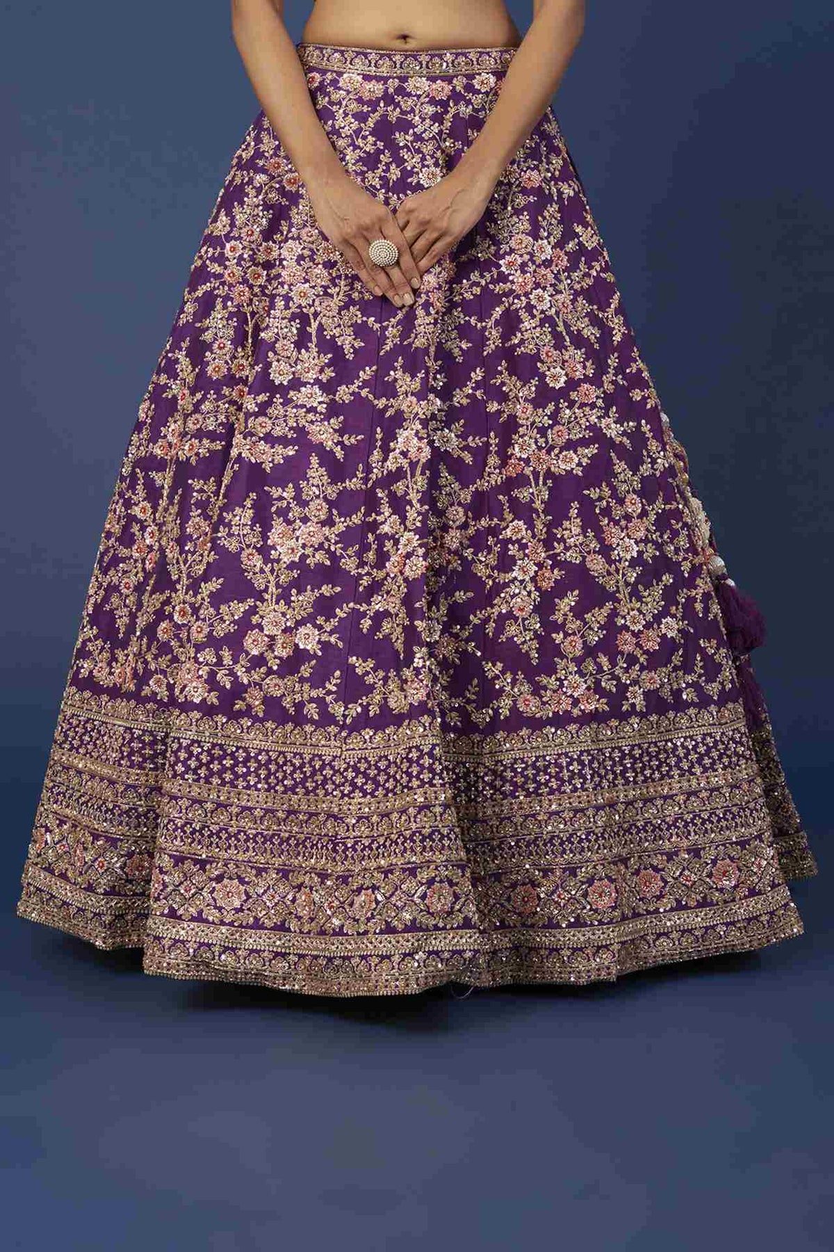 'Purple Embellished Paheli Lehenga Set' is from Atheral collection by Kalighata. Featuring A Purple Lehenga In Raw Silk Base With Zardosi Embellishments And A Cancan. It Is Paired With A Matching Embroidered Blouse And A Dupatta.