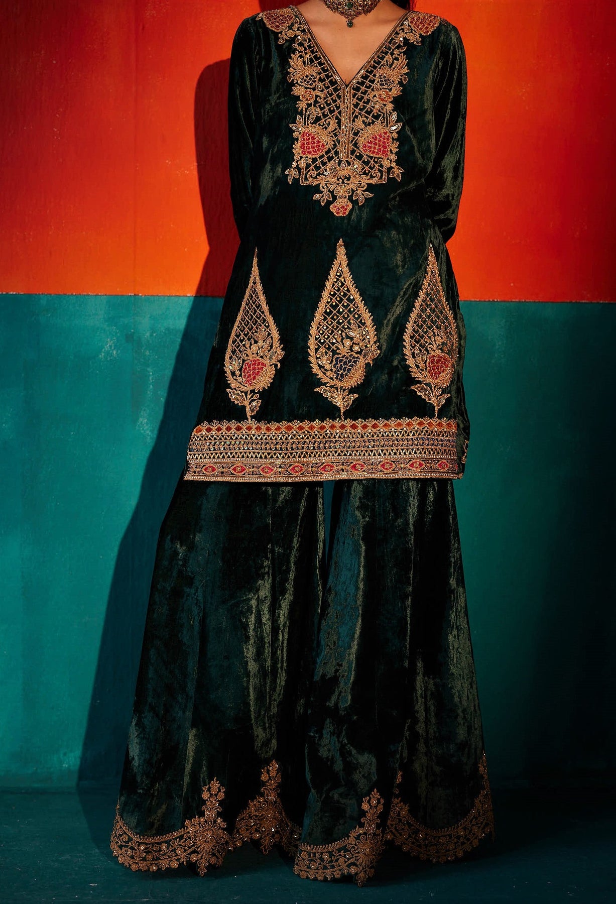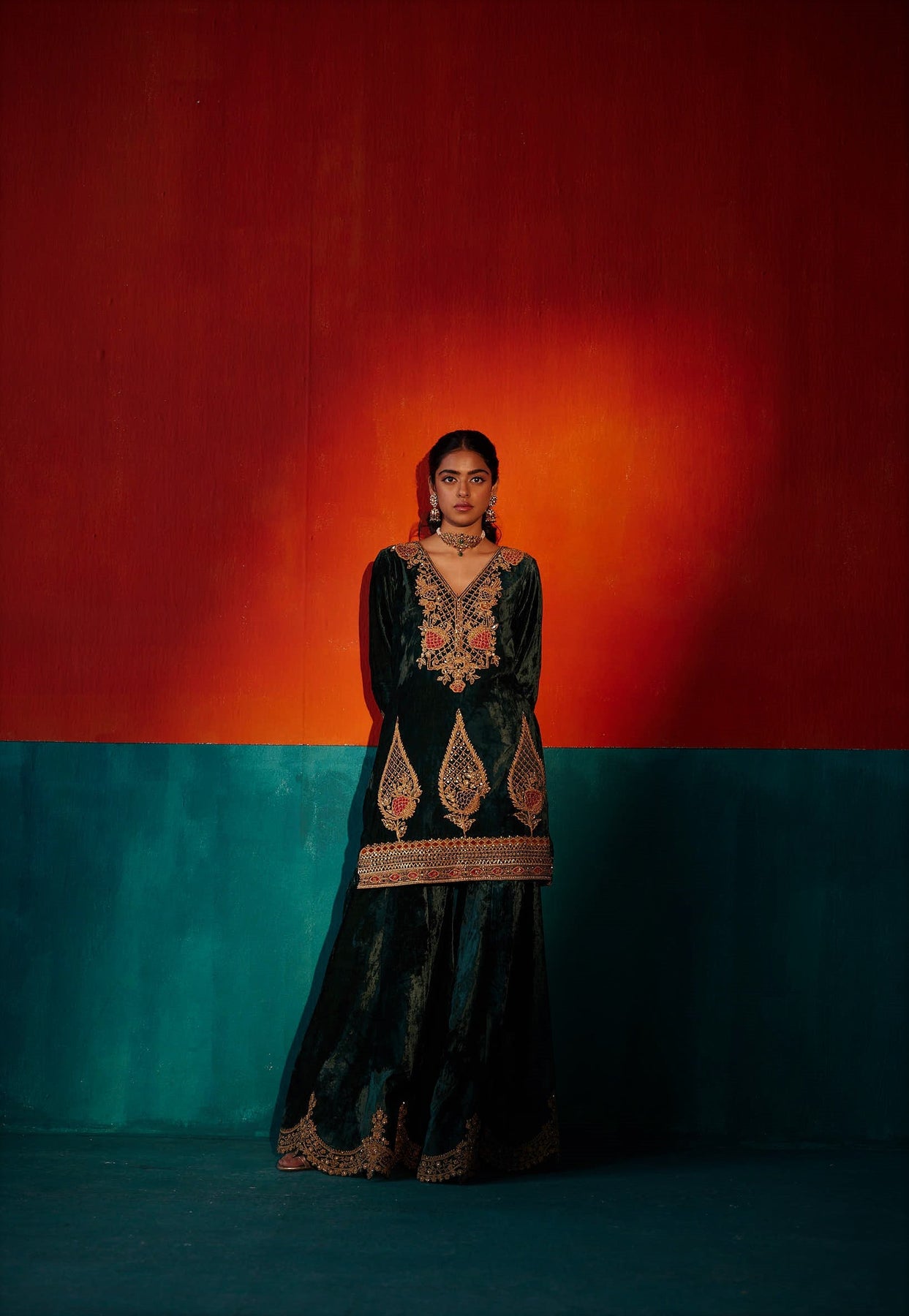 Castleton Green kurta set with floral embroidery highlighted with various embellishments. Paired with pants. Fitted at bust and waist. Pure silk velvet & organza dupatta. Dry clean only.