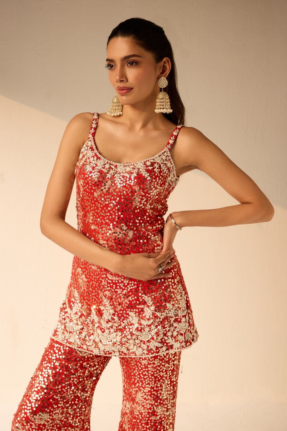 'Red Printed Sequin Co-Ord Kurta Set' is from Inara collection by Sanya Gulati. Featuring a stunning red printed sequins co-ord which has an intricately hand embroidered strappy kurta paired with flared pants, it is uplifted with sequin detailing and elegant pearl embroidery.