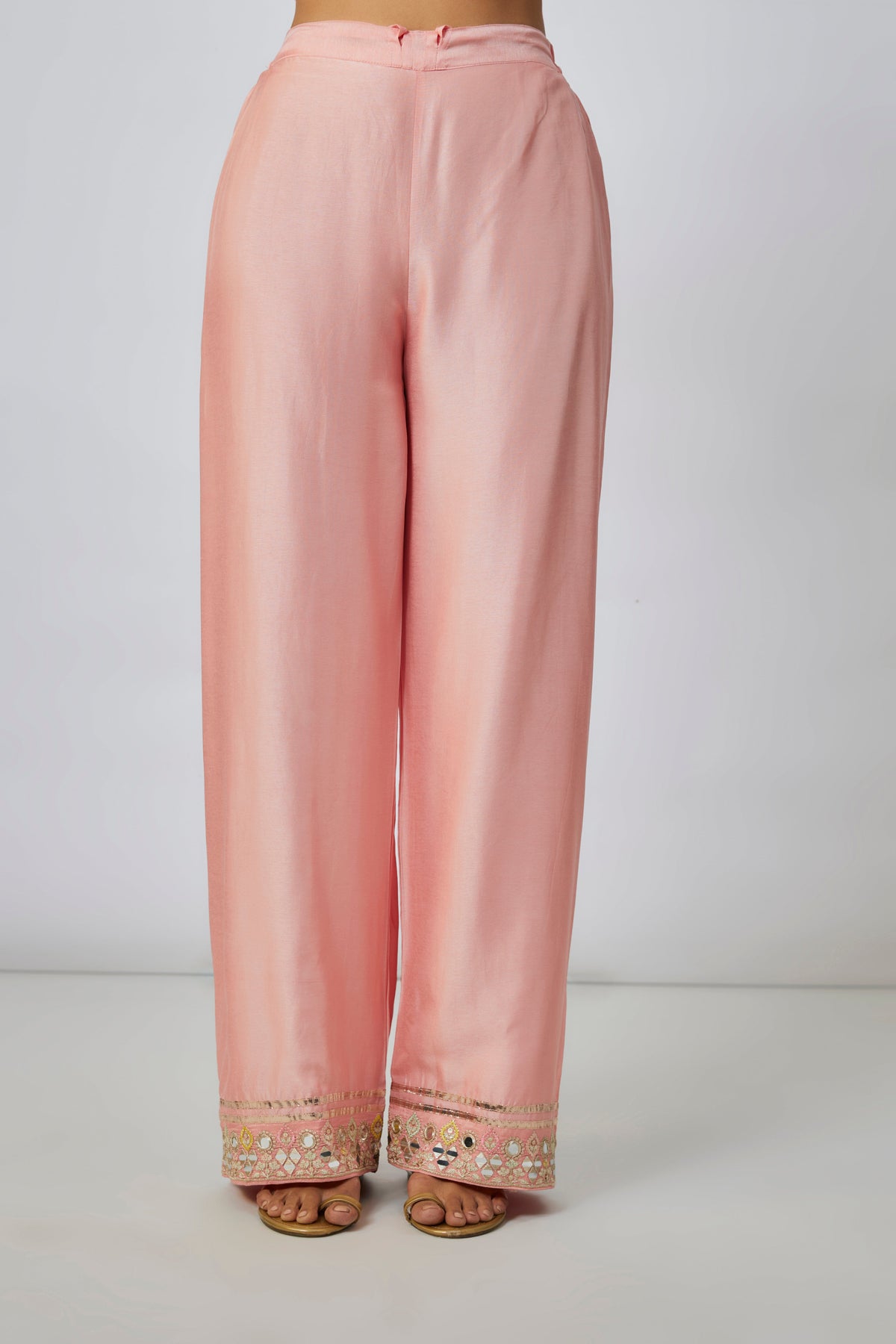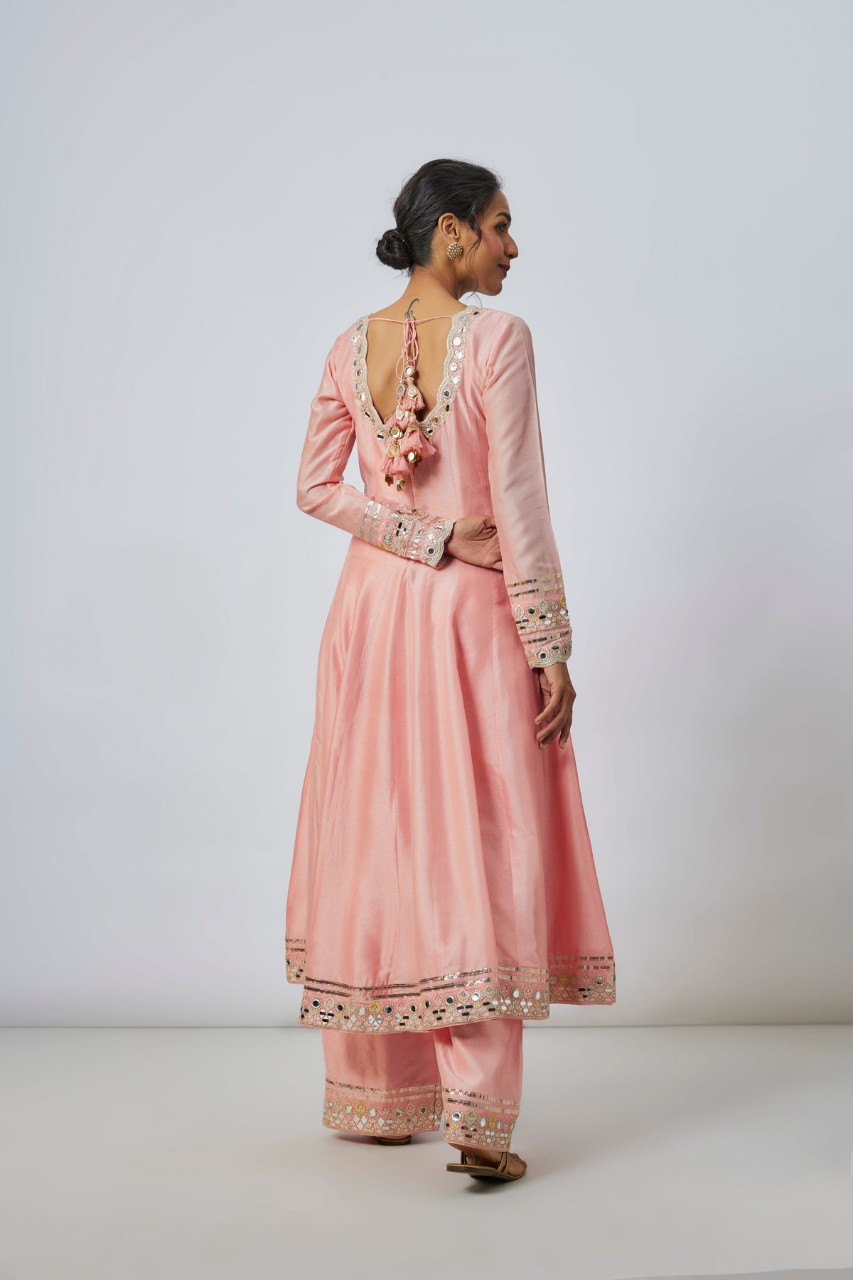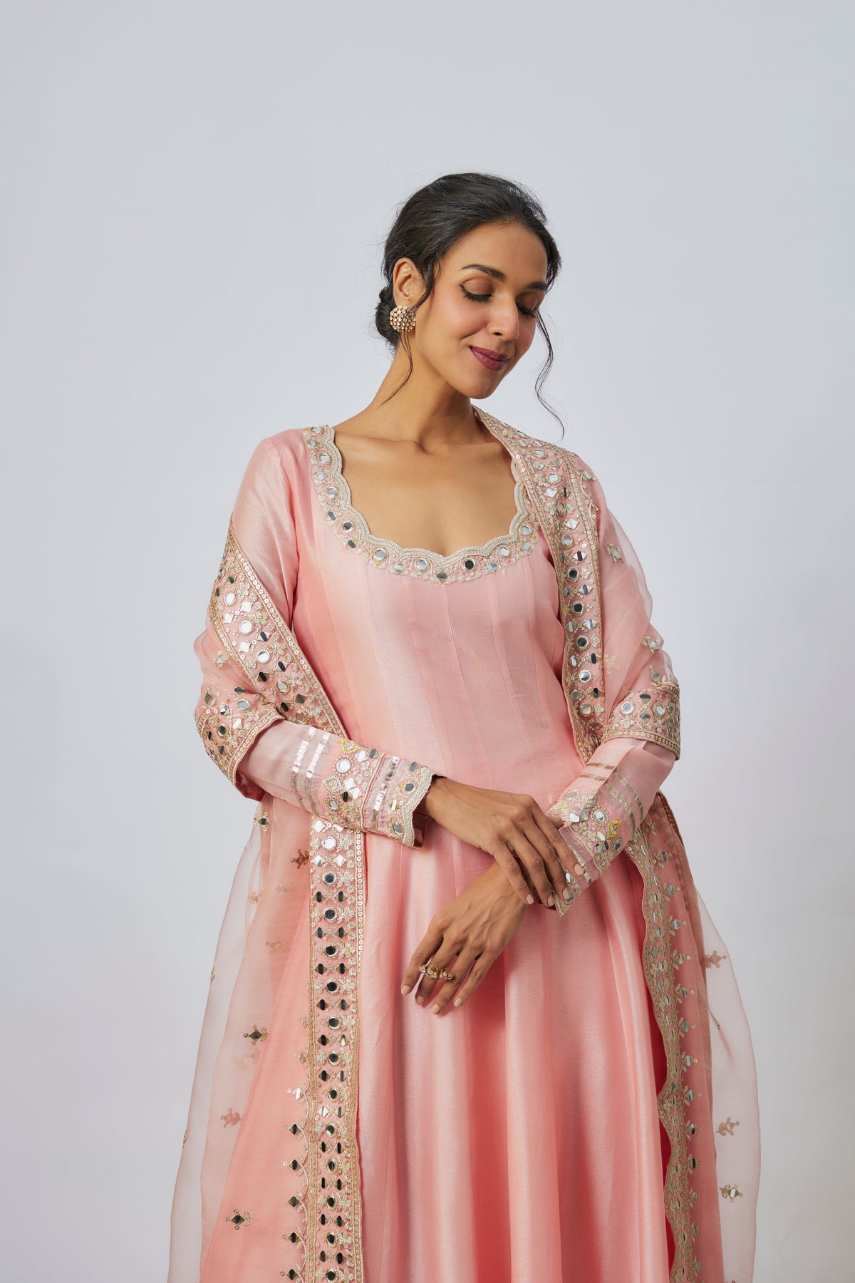 'Shraddha Ag Set' is from Jhilmil collection by Gopi Vaid. This blush pink kurta set features long A-line kurta with scalloped neckline and mirror work on hemline nand cuffs. Paired with straight-fit pants decorated with mirror work on the hem. Completing the look is a dupatta embroidered with border and scattered mirror motifs.