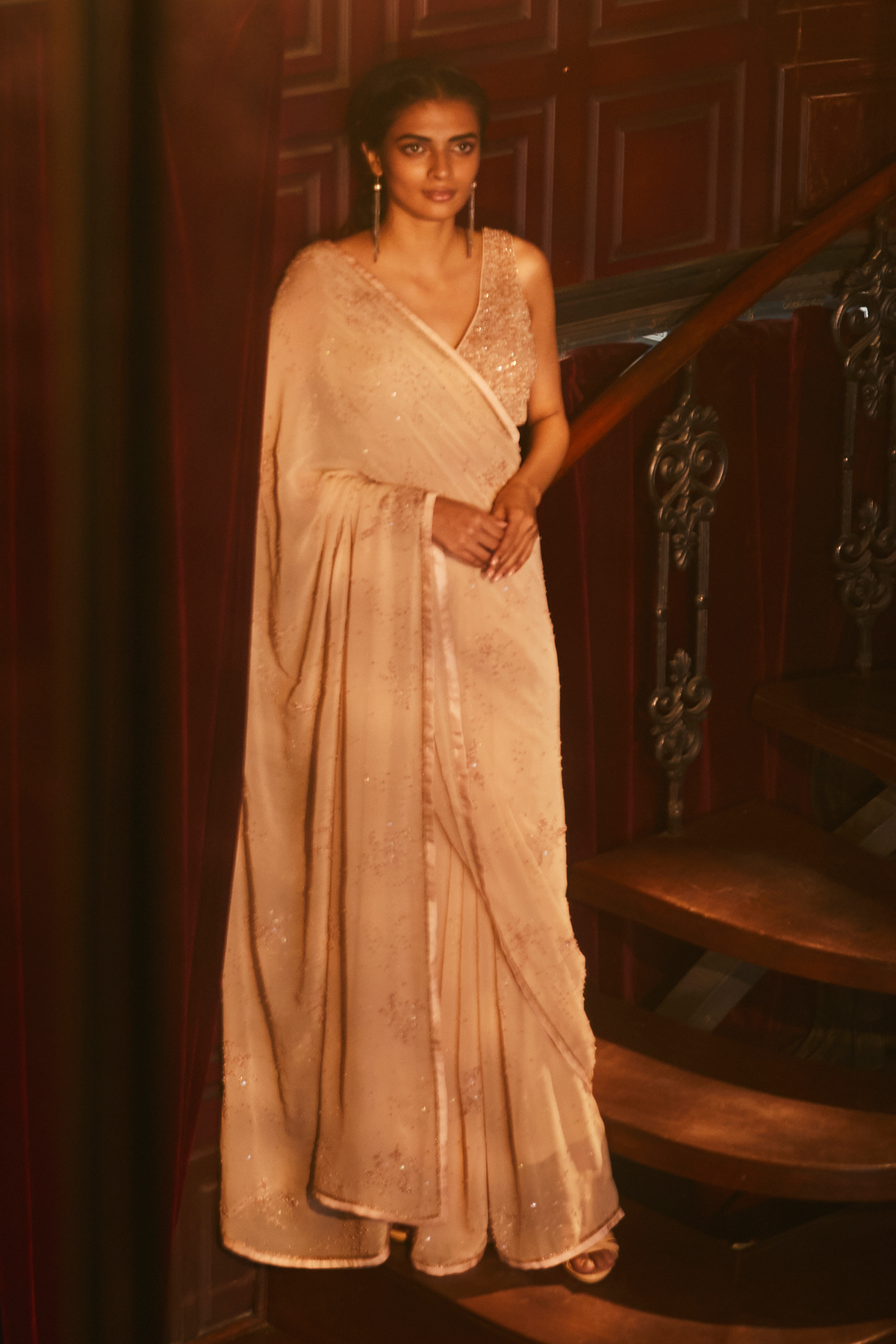 'Mood' is from La Vie line collection by Shasha Gaba. Hand embellished saree with sequins and tonal seed bead paired with a stitched sleeveless fully hand embroidered padded blouse with back opening