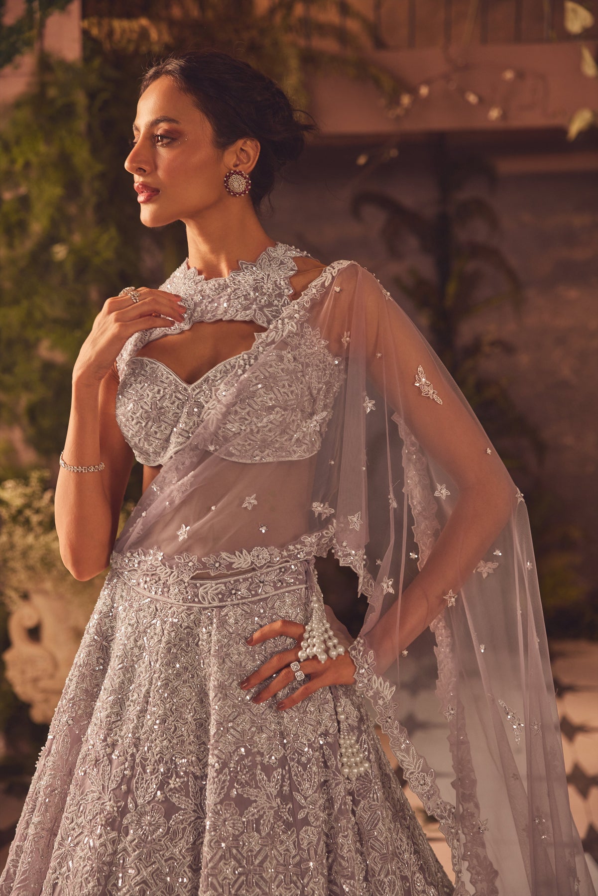 'Arienna' is from Lehenga collection by Roqa. Featuring Arienna lehenga set with delicate pearl and old world silver embroidery. The breathtaking lavender ensemble is based on net. The lehenga skirt features an exclusive flare and refined craftsmanship. Paired with a sheer net dupatta sprinkled with fine embroidery and scalloped borders, this look is a timeless ode to elegance and refined detailing—perfect for a modern bride or bridesmaid seeking understated glamour.