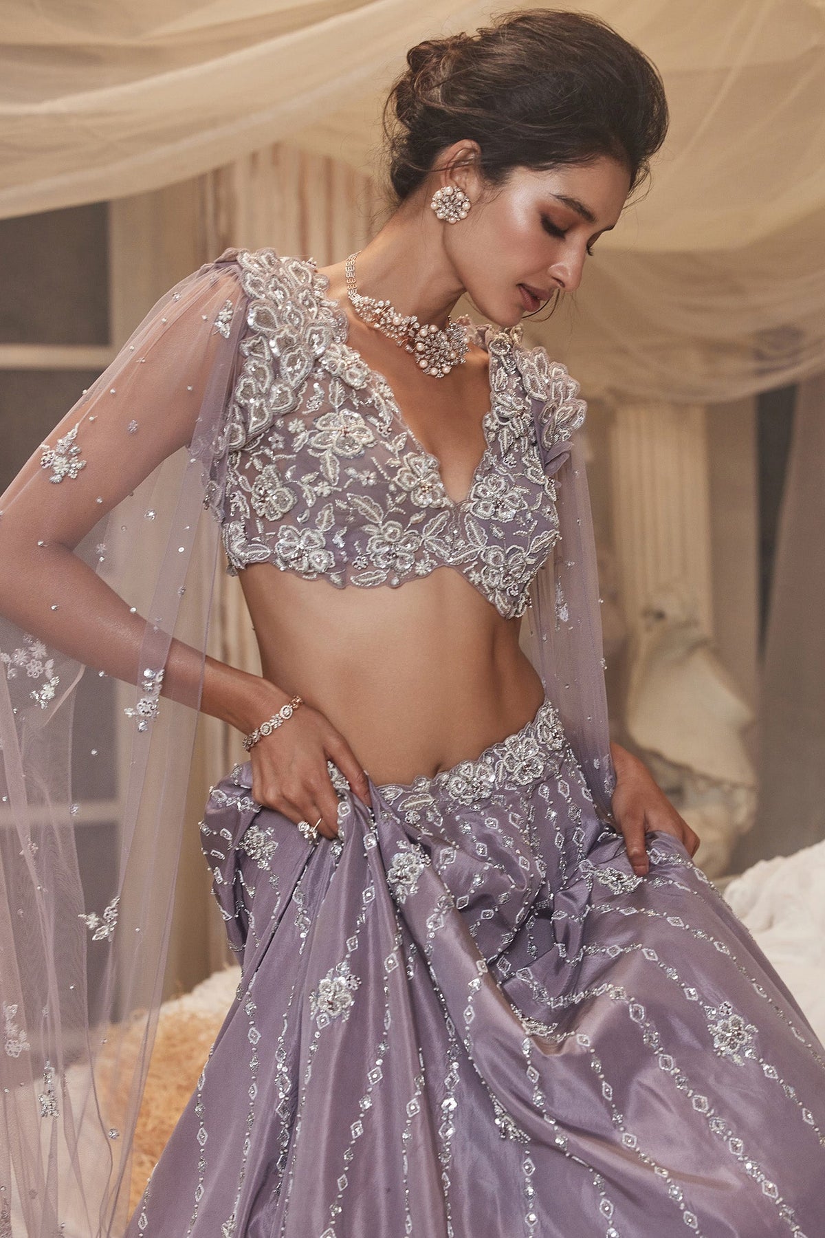 'Canis' is from Lehenga collection by Roqa. Presenting Canis, a soft lilac-coloured lehenga with cape sleeves showcases the utter dedication of the craftsmen. The blouse is based on silk with 3D silver embroidery paired with long cape sleeves based on net. The blouse has a plunging neck with dori detailing at back. The lehenga has great flair with embroidered belt and is based on pure raw silk.