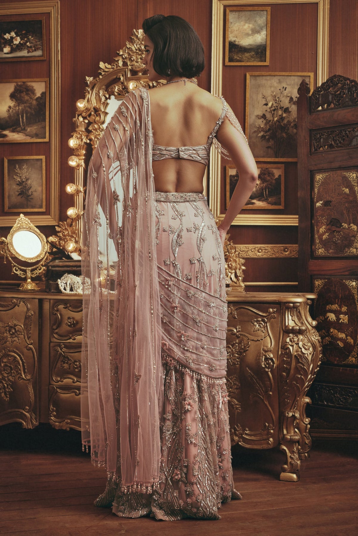 'Cordelia' is from Lehenga collection by Roqa. An elegant blush-toned lehenga set adorned with intricate hand embroidery and shimmering beadwork. The structured, embellished blouse is paired with a flowing skirt featuring delicate floral motifs, creating a graceful silhouette. A sheer, sequined dupatta drapes effortlessly over one shoulder, adding softness and movement.