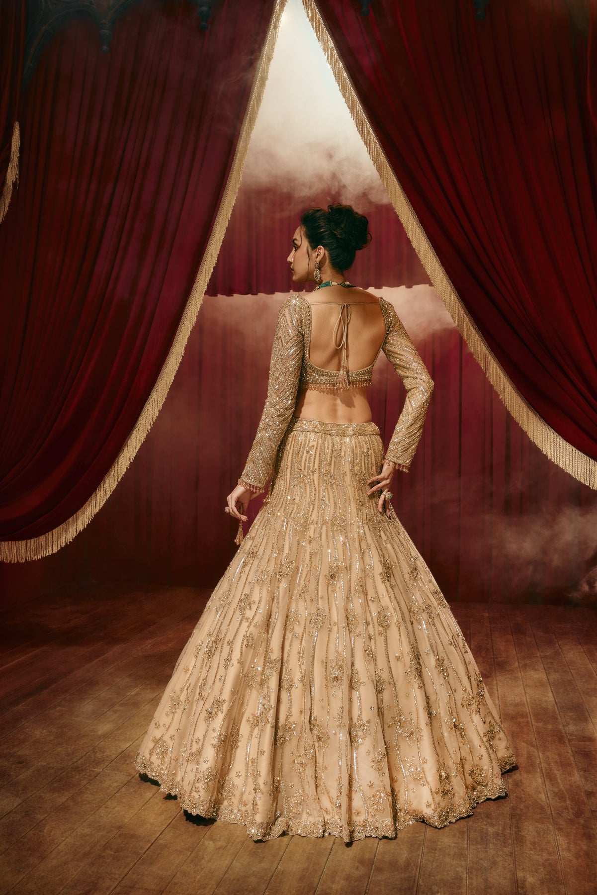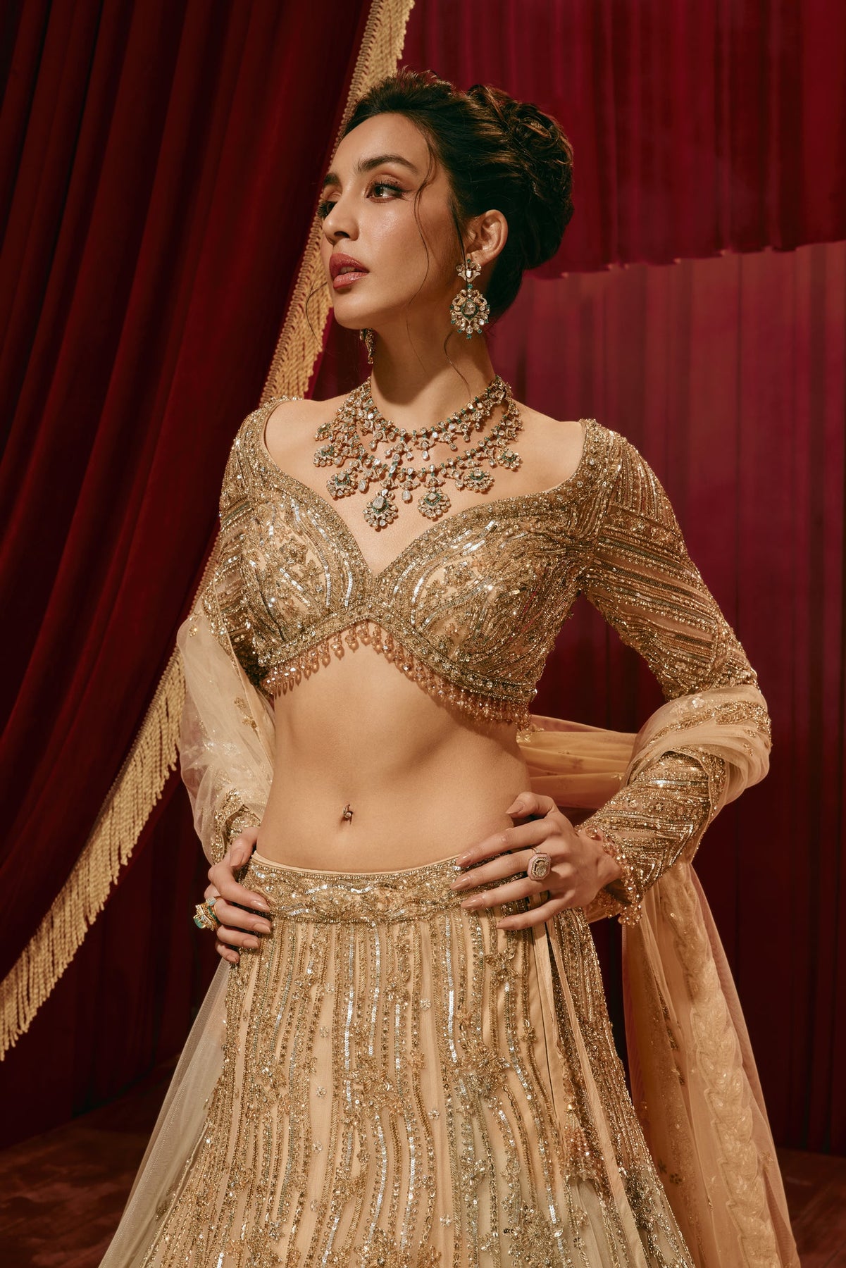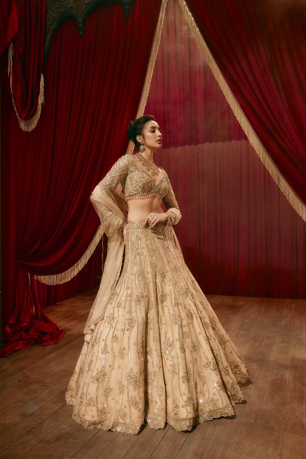 'Ivy' is from Lehenga collection by Roqa. A stunning champagne-gold lehenga set adorned with intricate embroidery and shimmering sequin detailing. The fitted blouse features elegant craftsmanship and a flattering silhouette, paired with a delicate dupatta and a voluminous skirt that moves gracefully with every step.