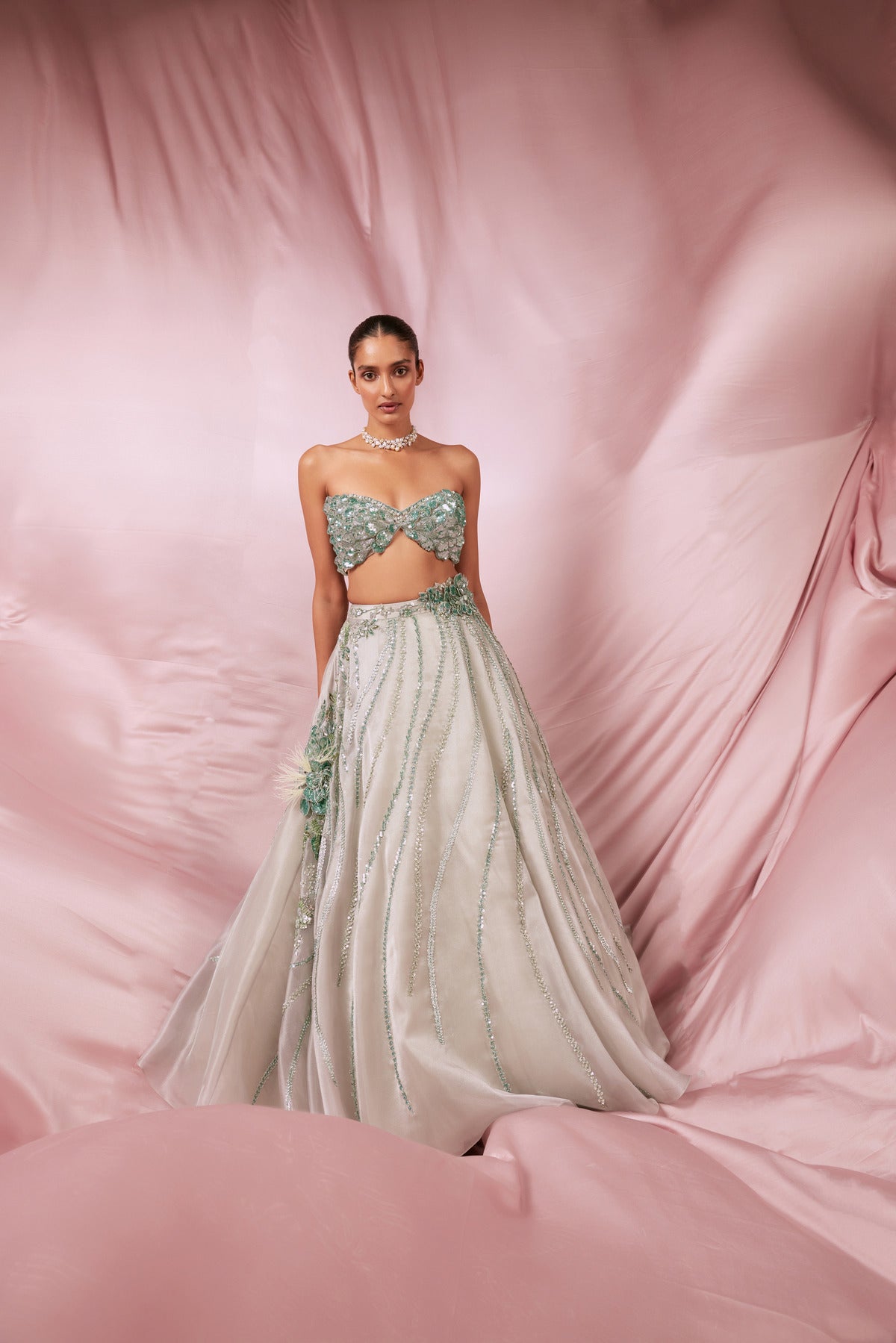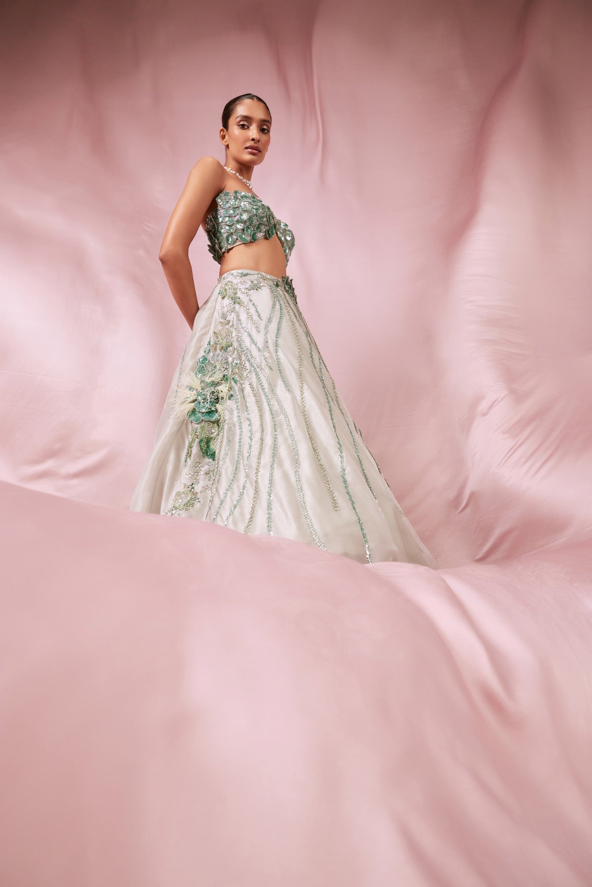 'Jardin Lehenga Set' is from Lehenga collection by Roqa. Modern technique blends with timeless sophistication in this 3-D embroidered lehenga set. It is paired with an organza cape with a trail at the back.
