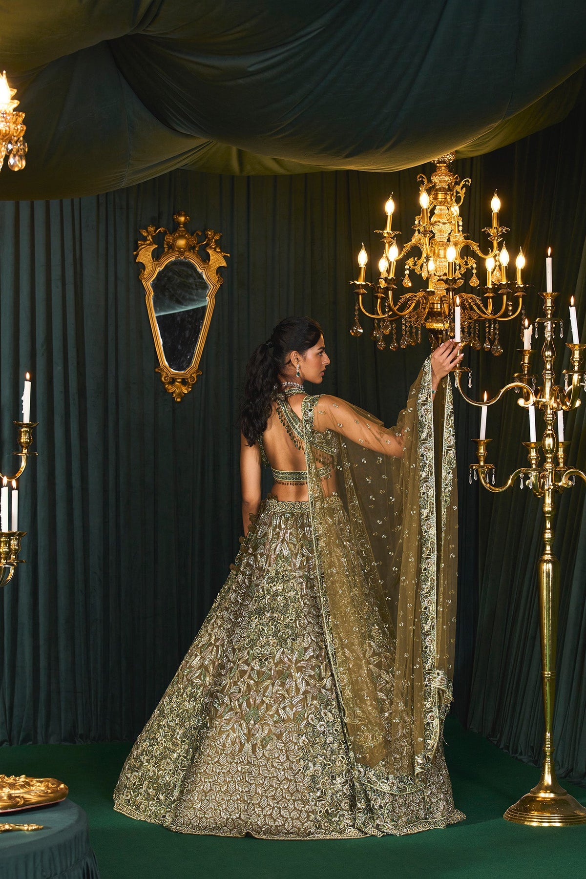 'Rubaab' is from Lehenga collection by Roqa. Merging earthy tones with metallic brilliance. This olive masterpiece is a statement of a peer of craft, this net Lehenga showcases silver floral sequins, cut-dana, and moti hand work highlighting art inspired by vintage charm. Comes with a mesmerising blouse and a net monotone dupatta. Perfect for those who seek a harmonious blend of understated elegance and modern allure.