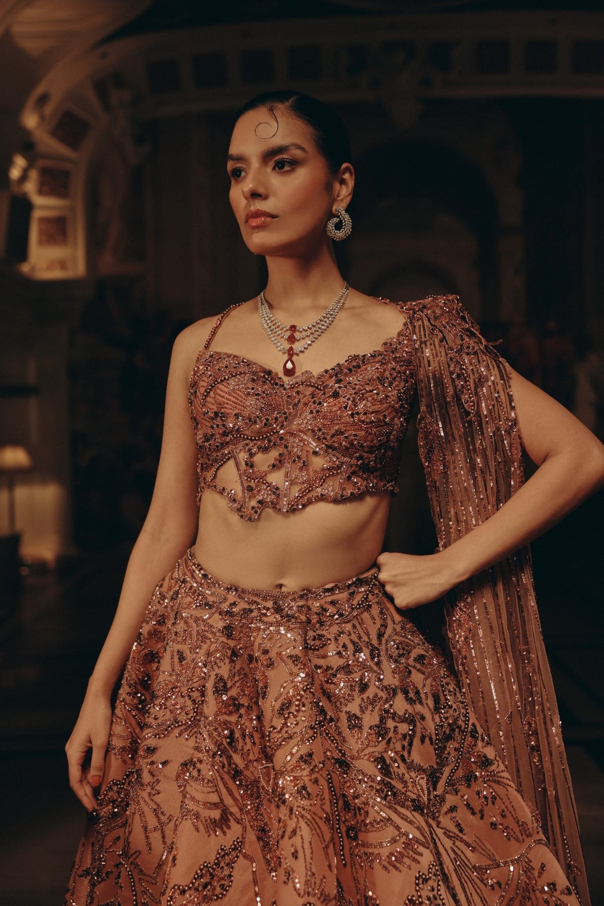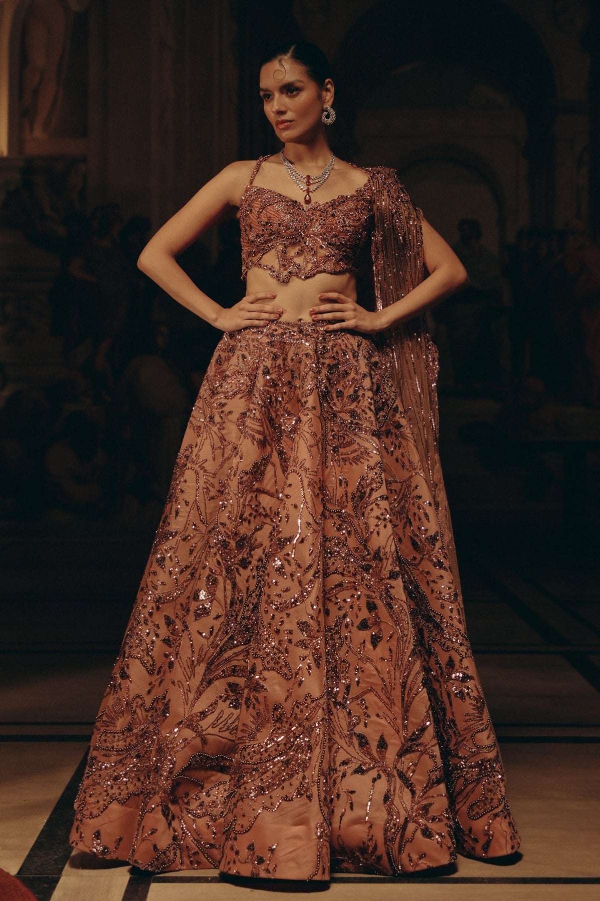 'Aurora Blossom Top & Skirt' is from Notte collection by Adaara Couture. A symphony of romance and radiance, this rose-gold captures the poetry of modern couture. The blouse is delicately structured with shimmering embellishments, while the voluminous skirt blooms with intricate sequin and bead embroidery, creating a play of light and shadow in every movement. The sheer dupatta, cascading with sequin accents, adds a graceful finish