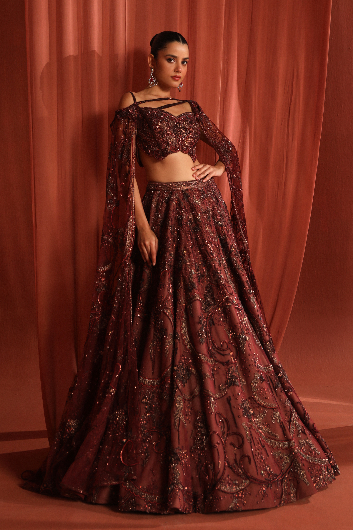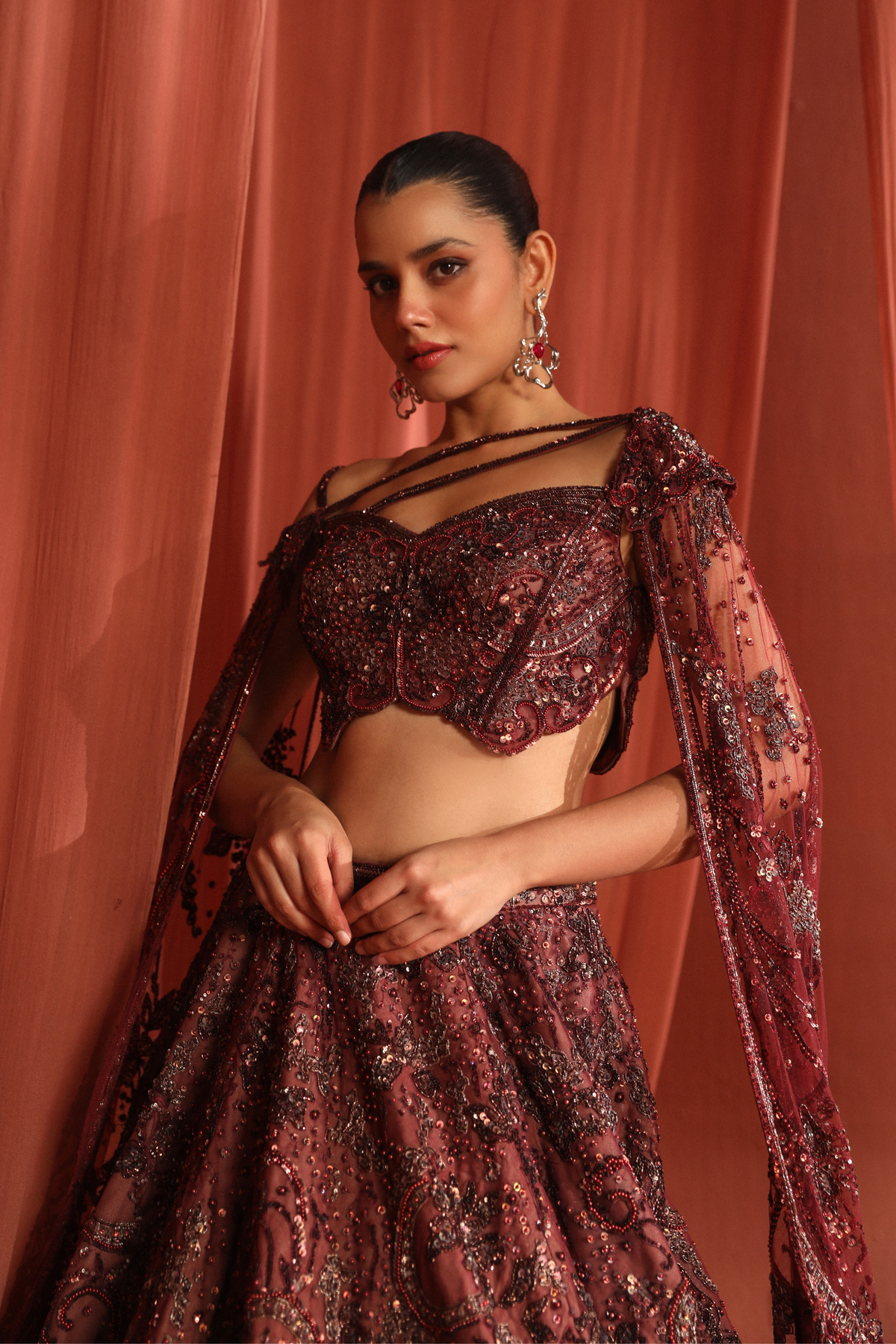 'Butterfly Dream Lehenga' is from Sail with me collection by Adaara Couture. This raspberry lehenga features modern artwork with butterflies, circles, and scattered embroidery, enhanced with crystals, pearls, sequins, and stones. The asymmetrical pallus, one draped over the shoulder and the other on the bicep, create a unique, eye-catching silhouette. A perfect blend of contemporary design and luxurious detail for a bold, elegant look.