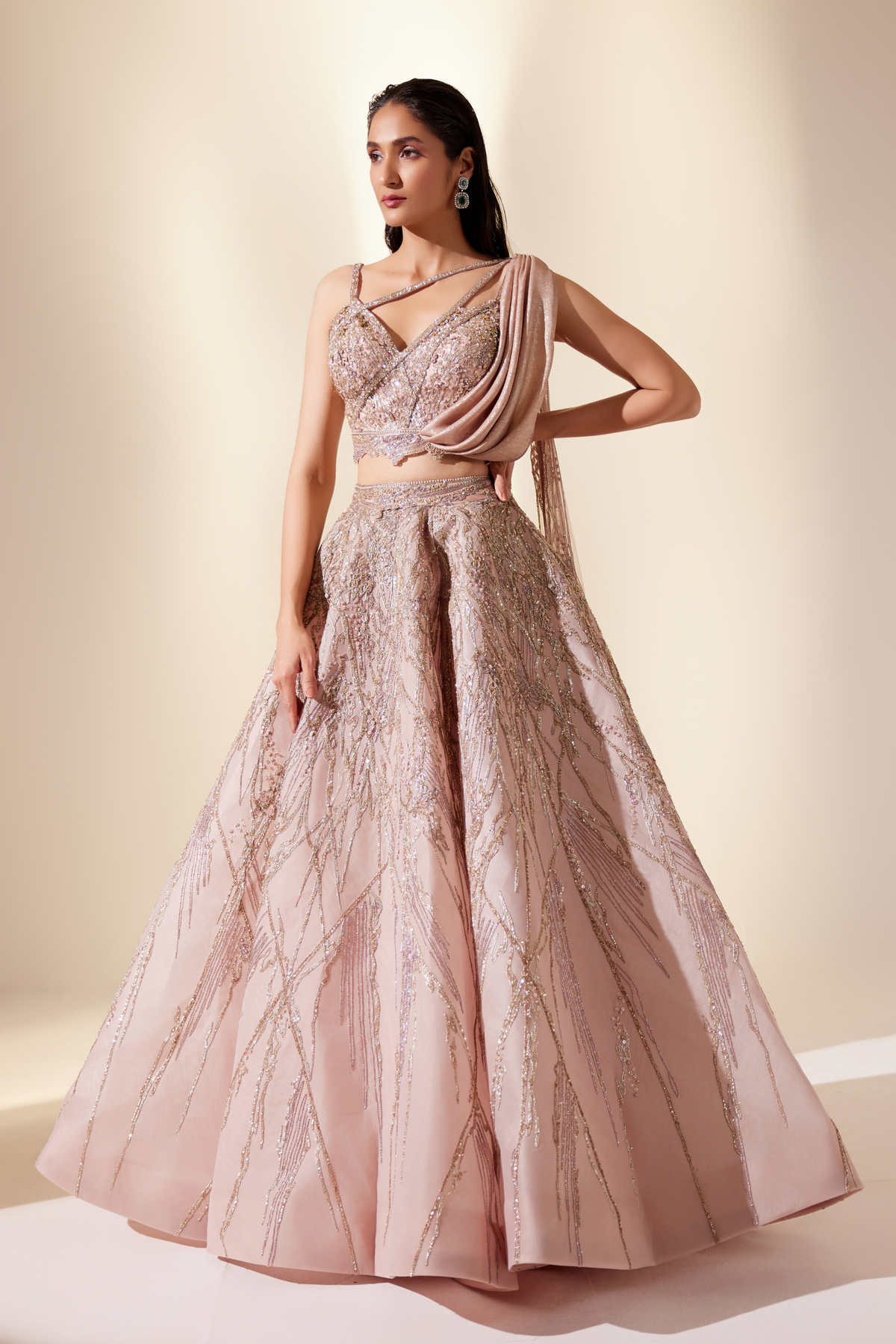 'Radiant Coral Lehenga Set' is from Stardust collection by Adaara Couture. the flowing lehenga , paired with a matching embellished blouse and attached duppatta featuring delicate work