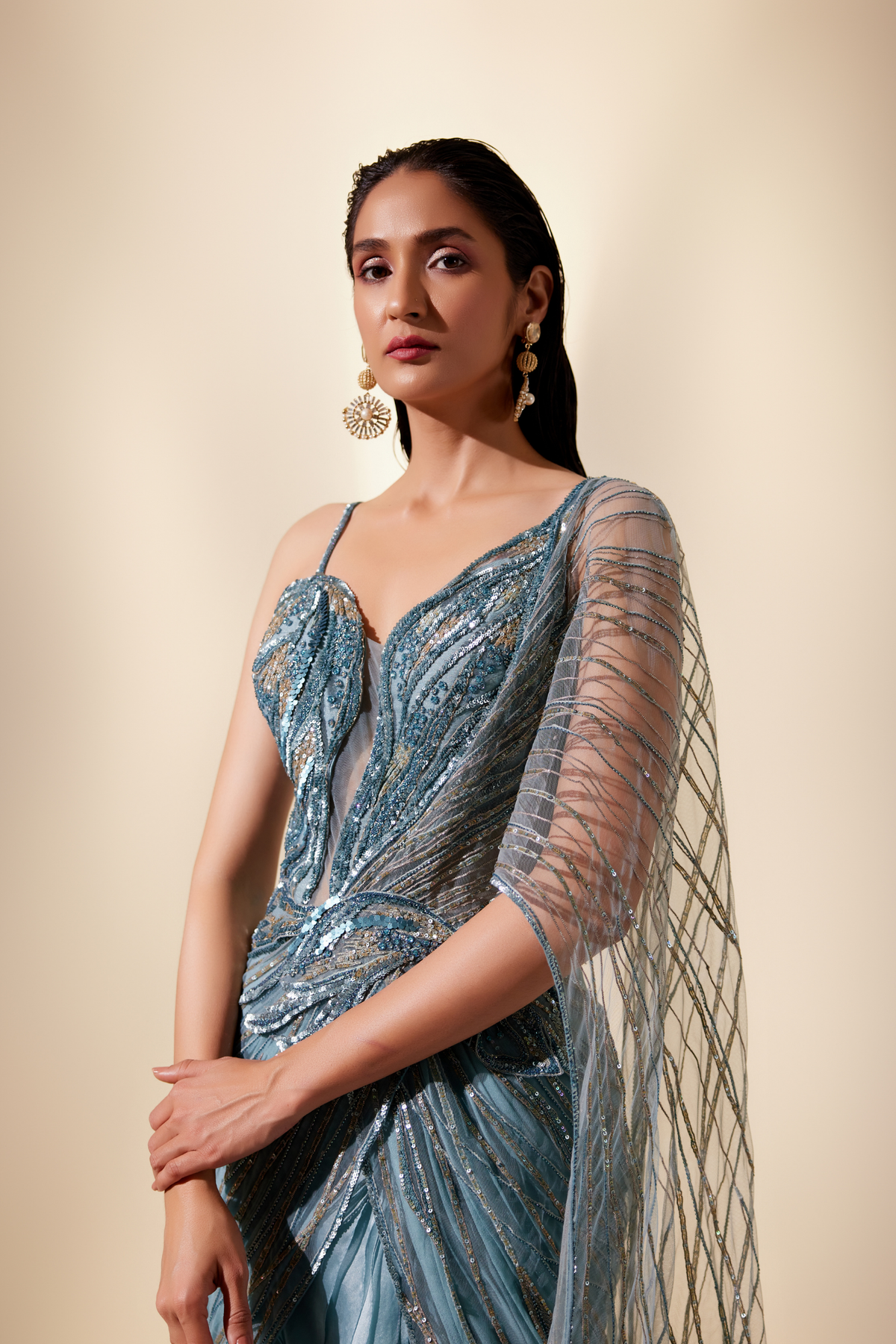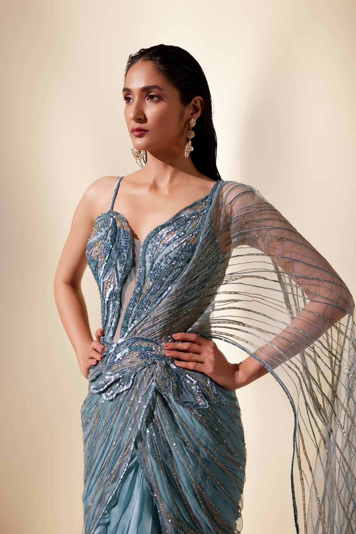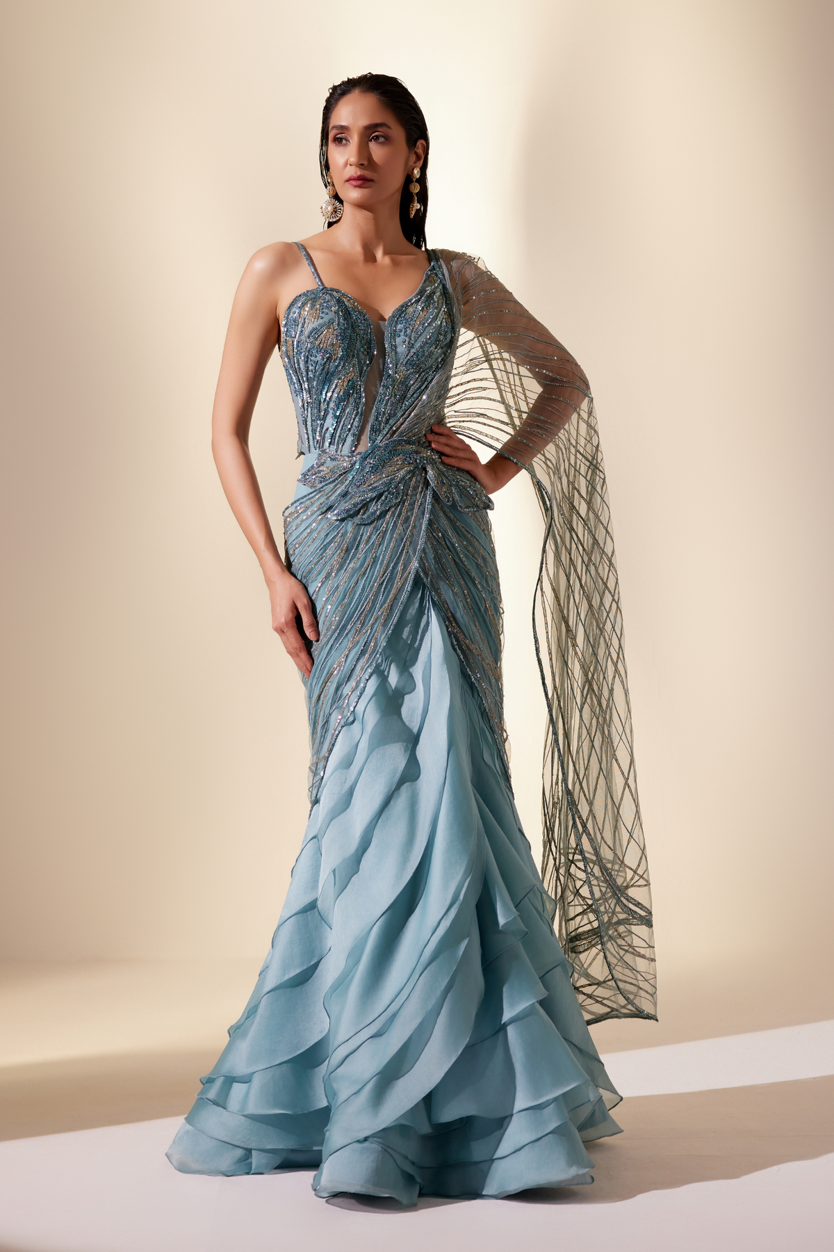 'Twilight Teal Stream Saree' is from Stardust collection by Adaara Couture. Twilight stream saree with delicately layered skirt features a mesmerising teal hue reminiscent of distant galaxies.