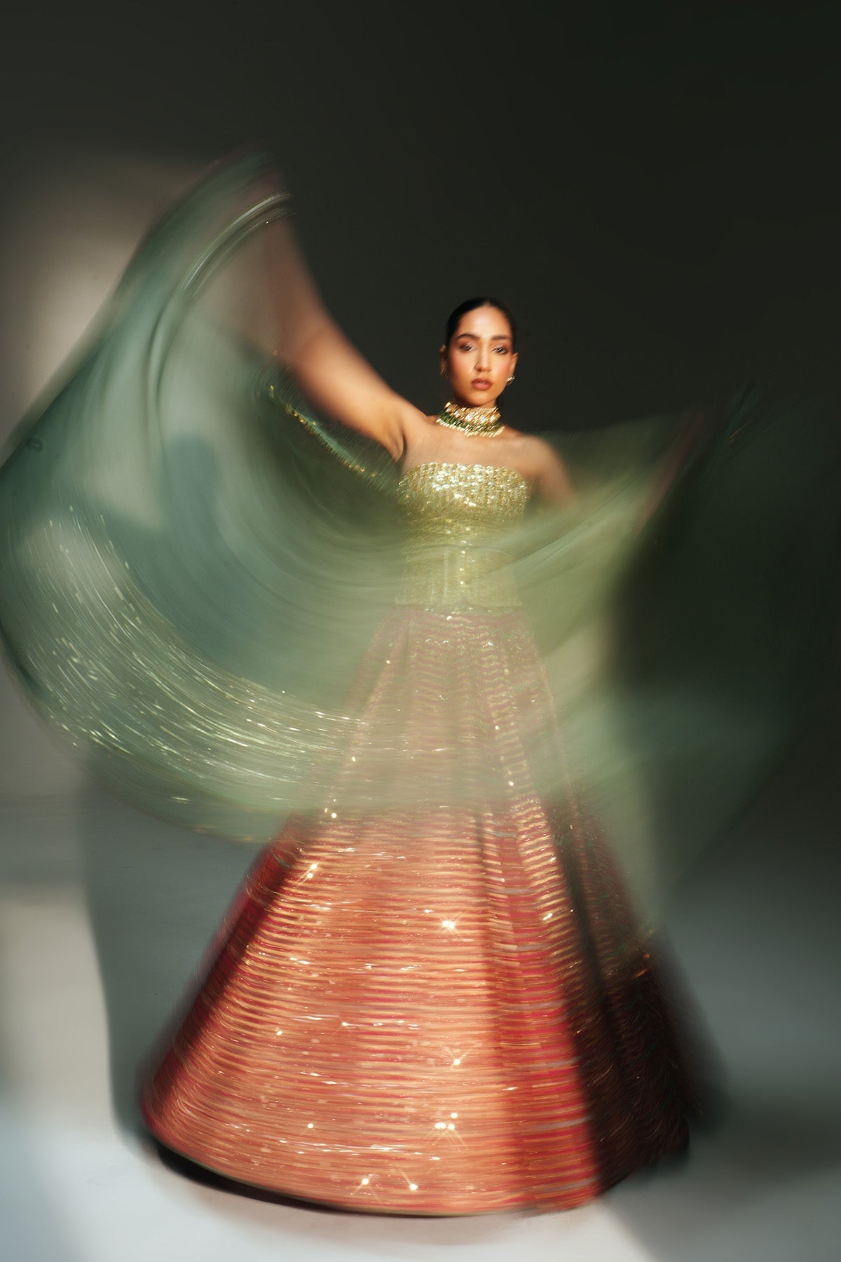 'Garima' is from Mehfil collection by Mahima Mahajan. HAND EMBROIDERED RANI PINK LEHENGA PAIRED WITH GOLDEN CORSET AND CONTRAST PISTA GREEN DUPATTA