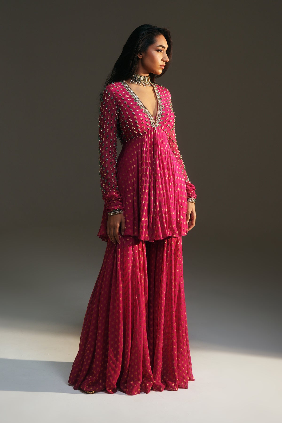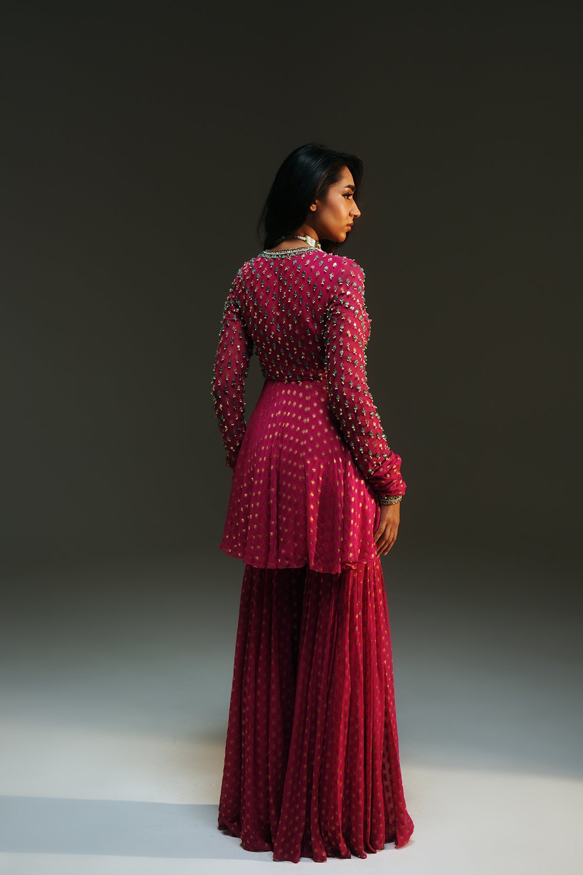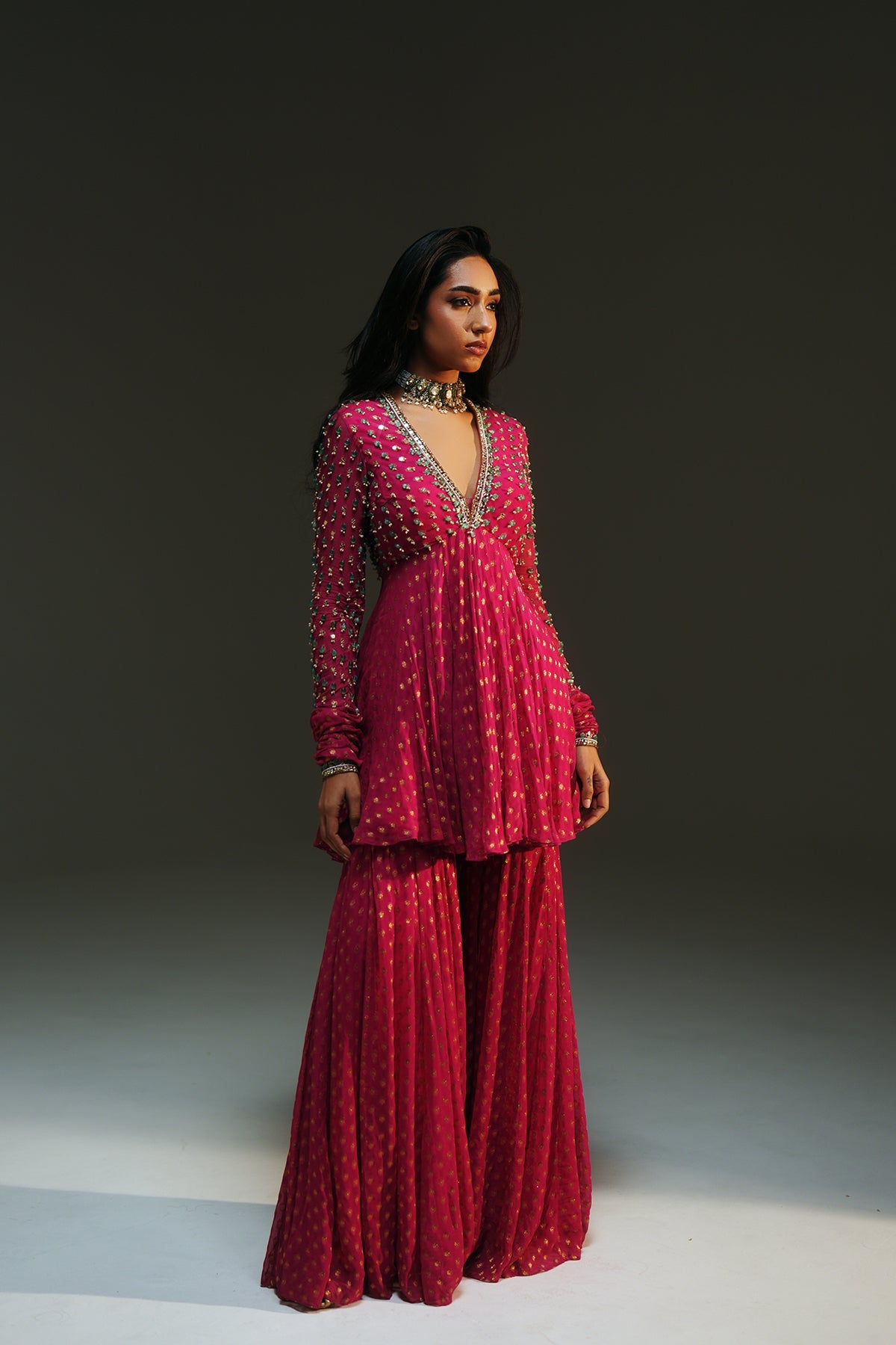 HAND EMBROIDERED RANI PINK SHORT KURTA AND SHARARA