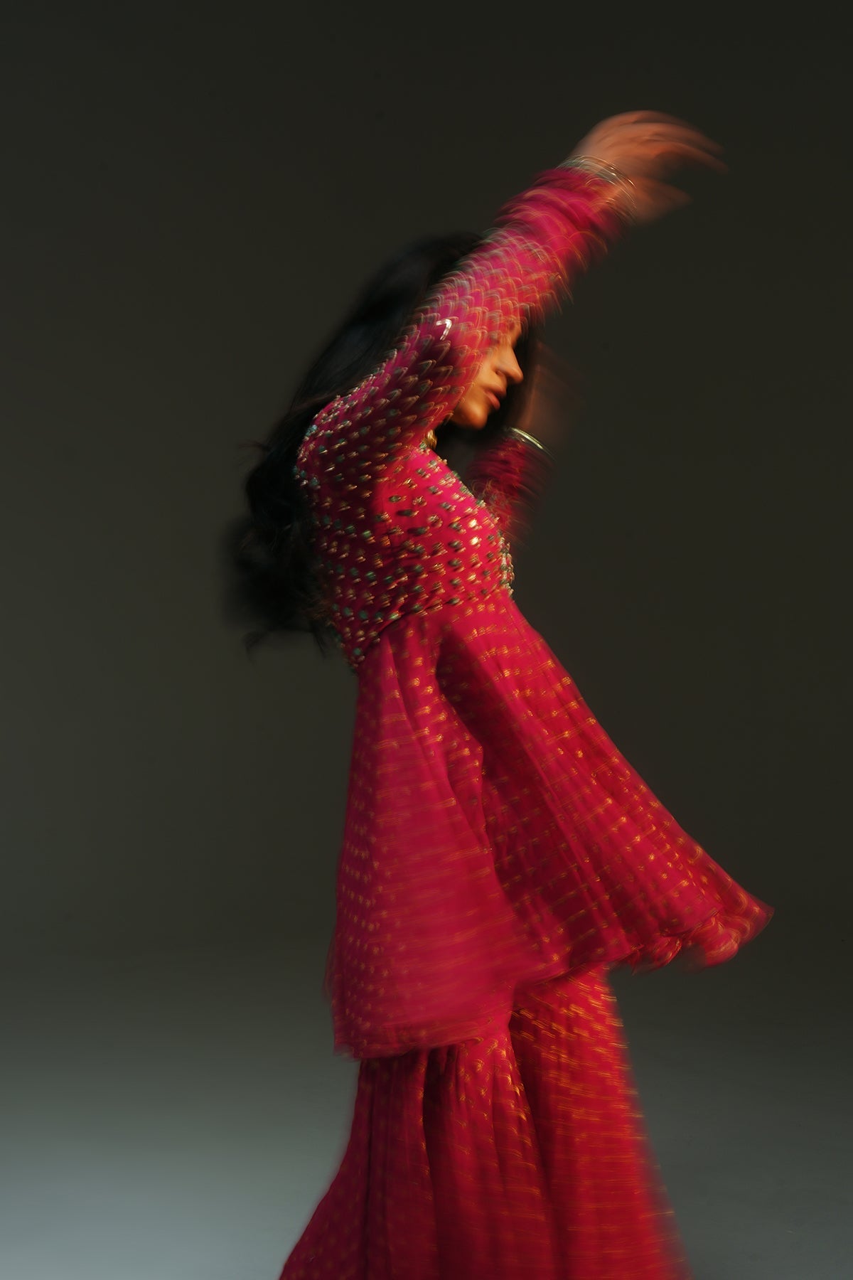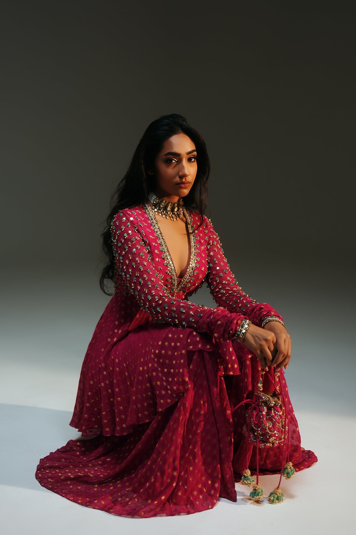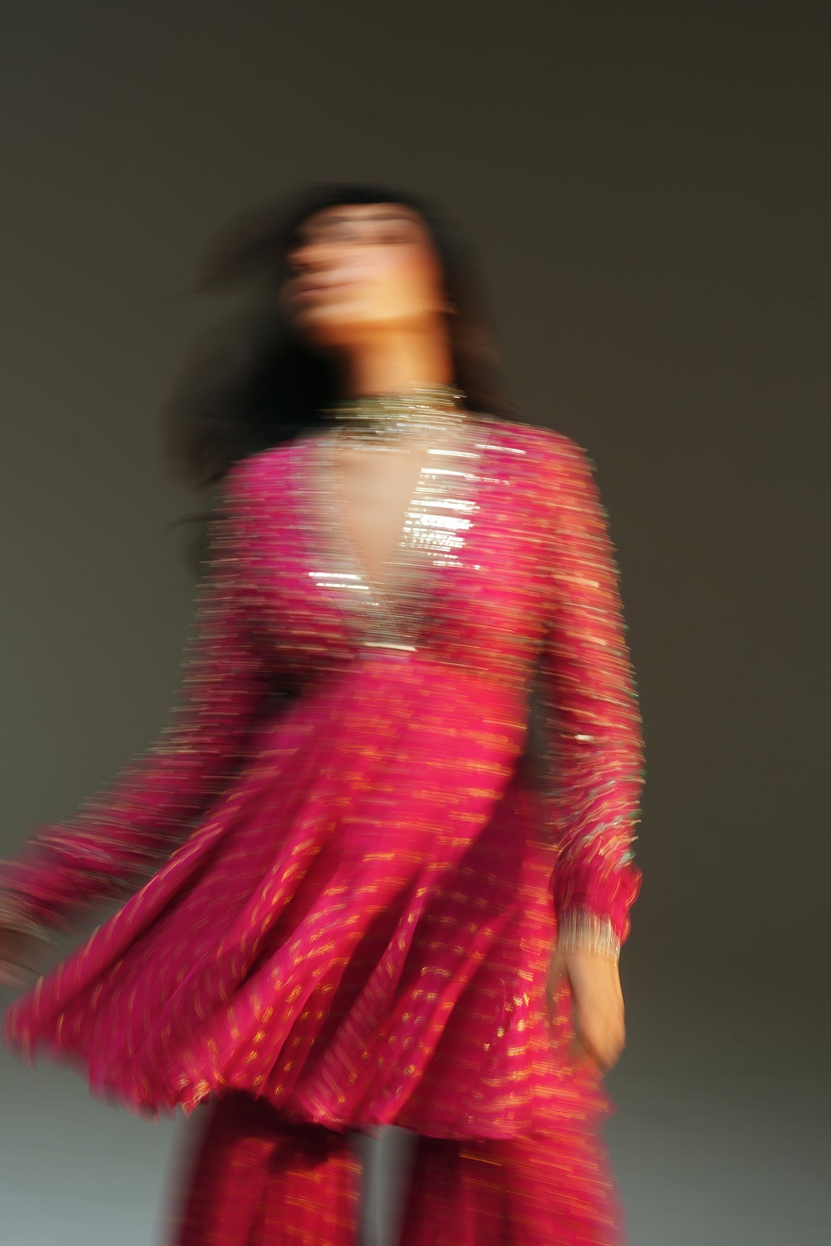 HAND EMBROIDERED RANI PINK SHORT KURTA AND SHARARA