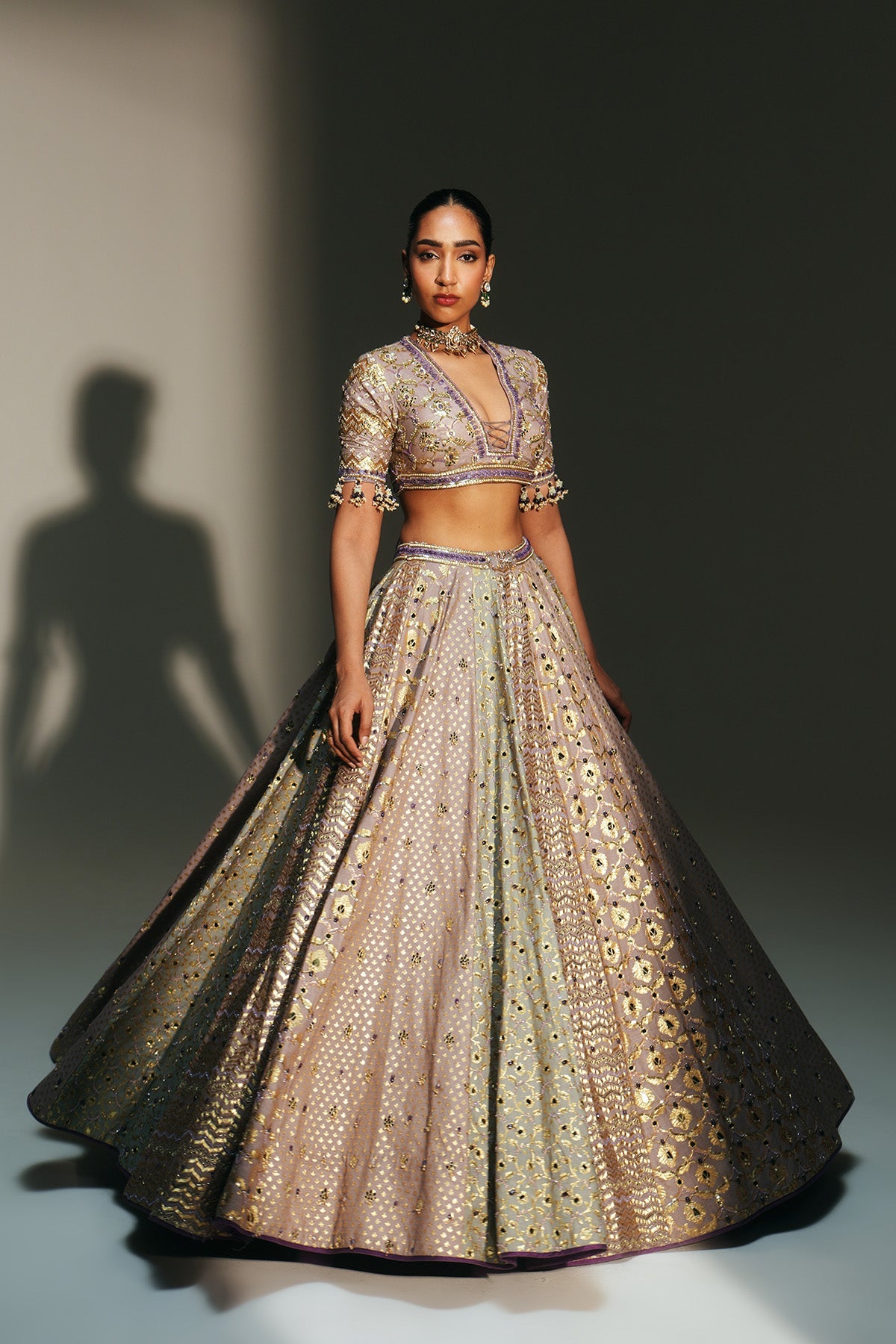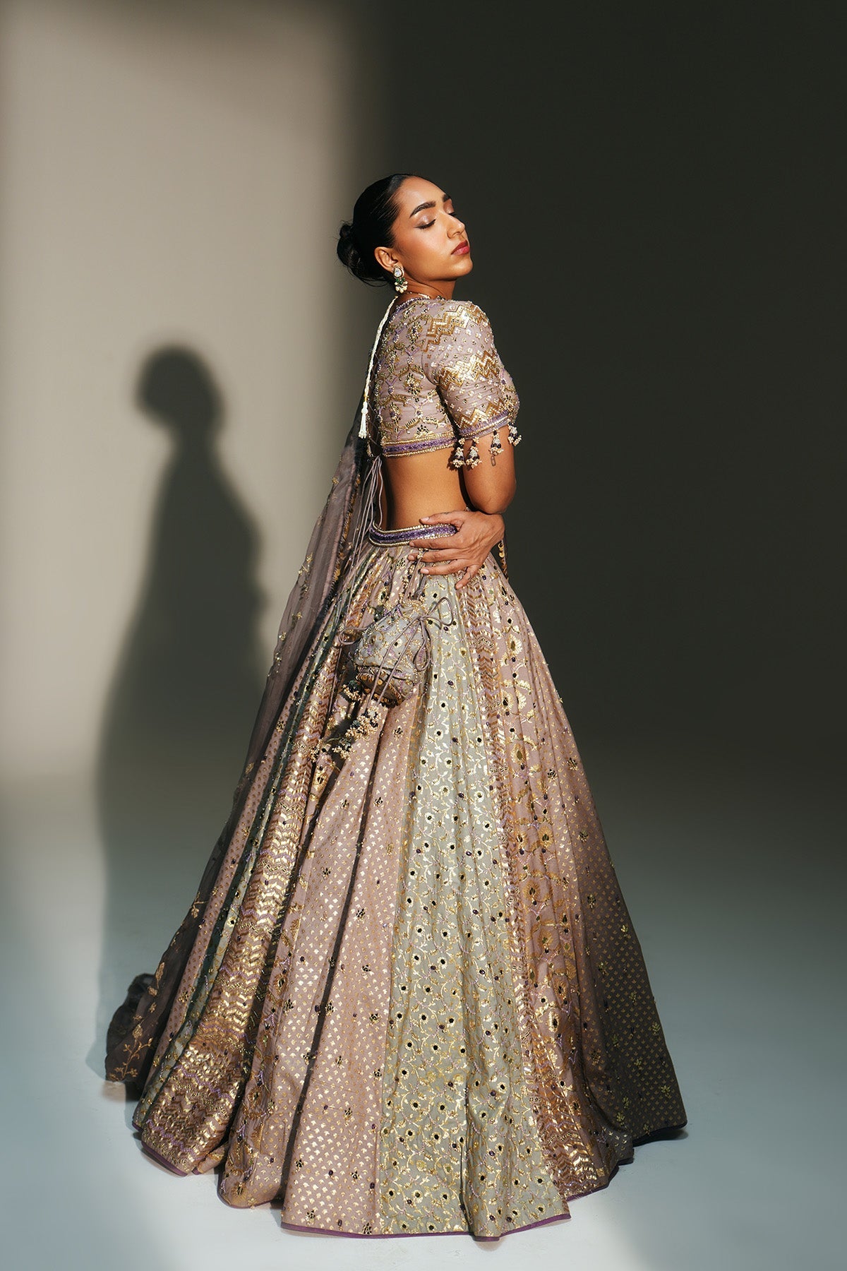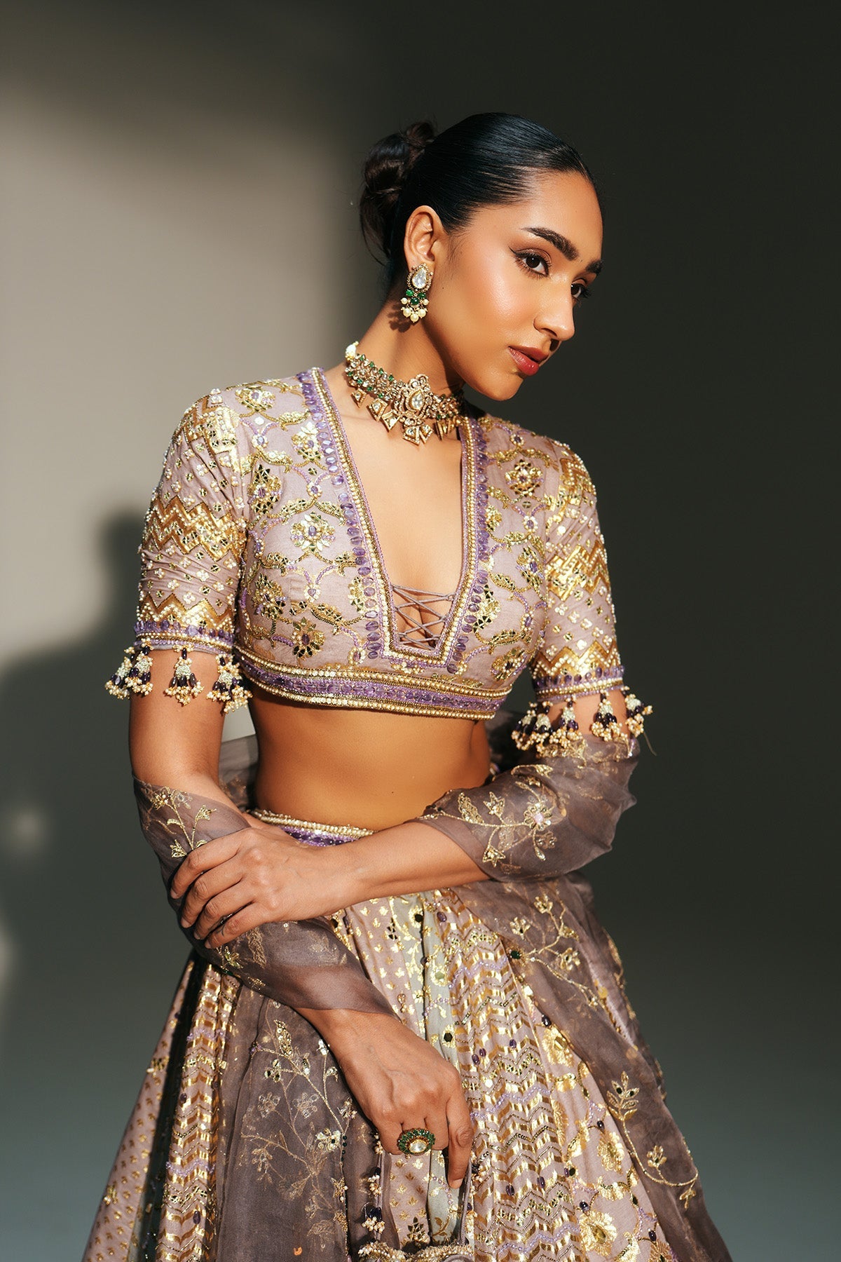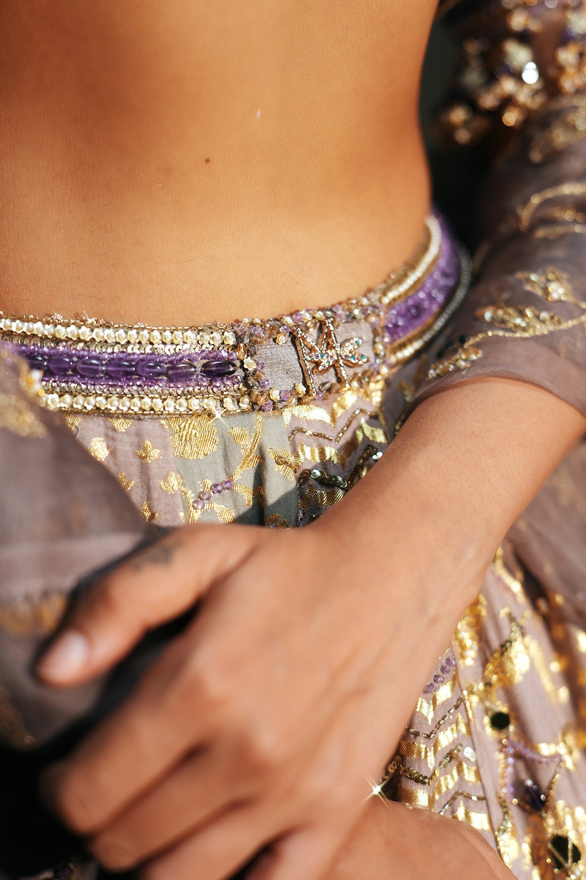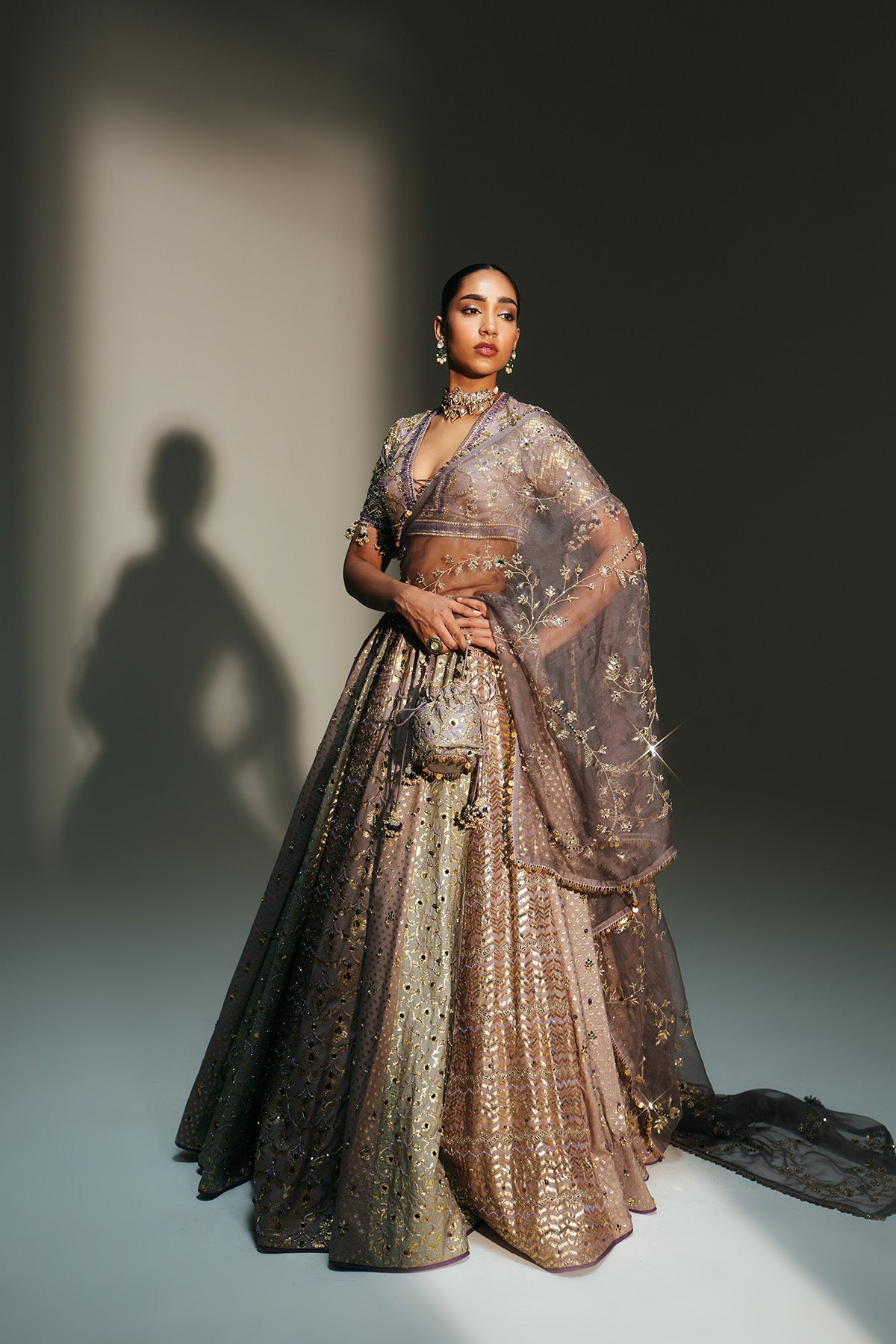 'Noorah' is from Mehfil collection by Mahima Mahajan. HAND EMBROIDERED LEHENGA FEATURING DRAGON FLY LOGO ON WAIST BELT PAIRED WITH MATCHING EMBROIDERE D BLOUSE AND DUPATTA