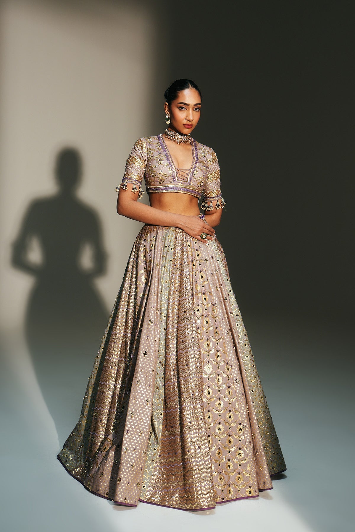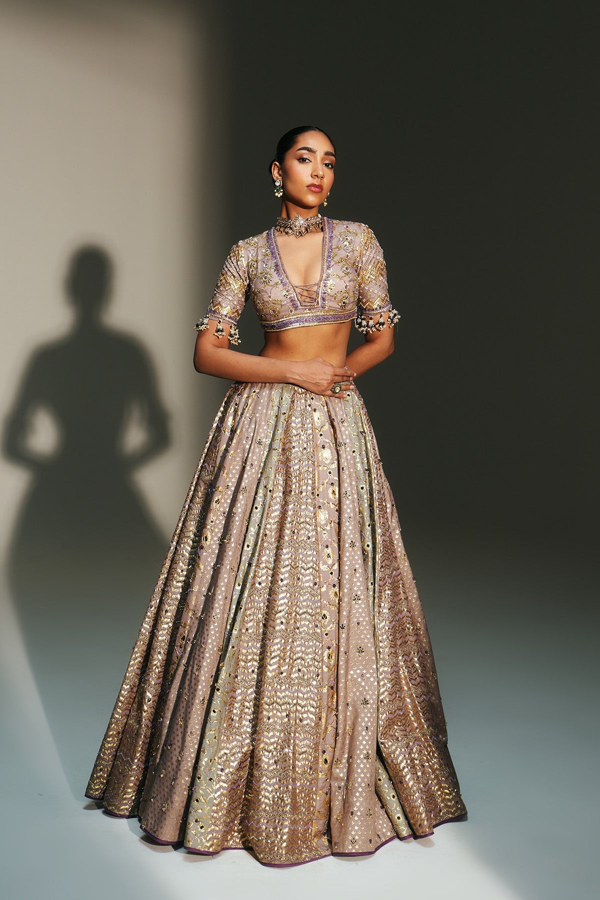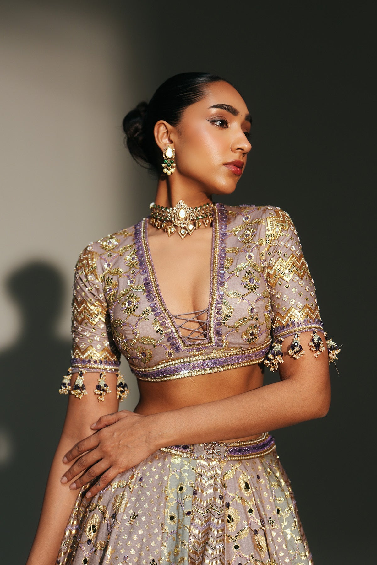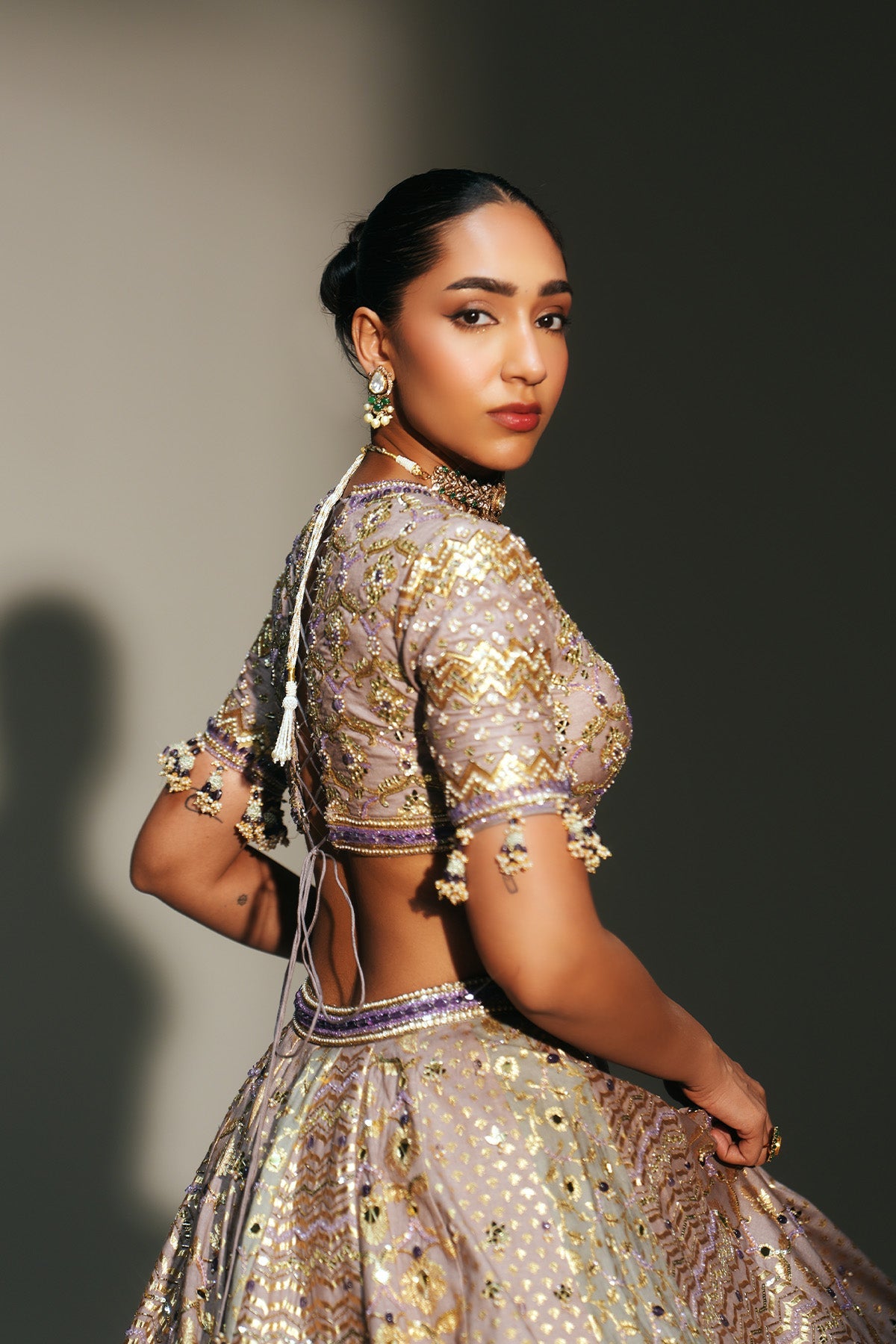 'Noorah' is from Mehfil collection by Mahima Mahajan. HAND EMBROIDERED LEHENGA FEATURING DRAGON FLY LOGO ON WAIST BELT PAIRED WITH MATCHING EMBROIDERE D BLOUSE AND DUPATTA