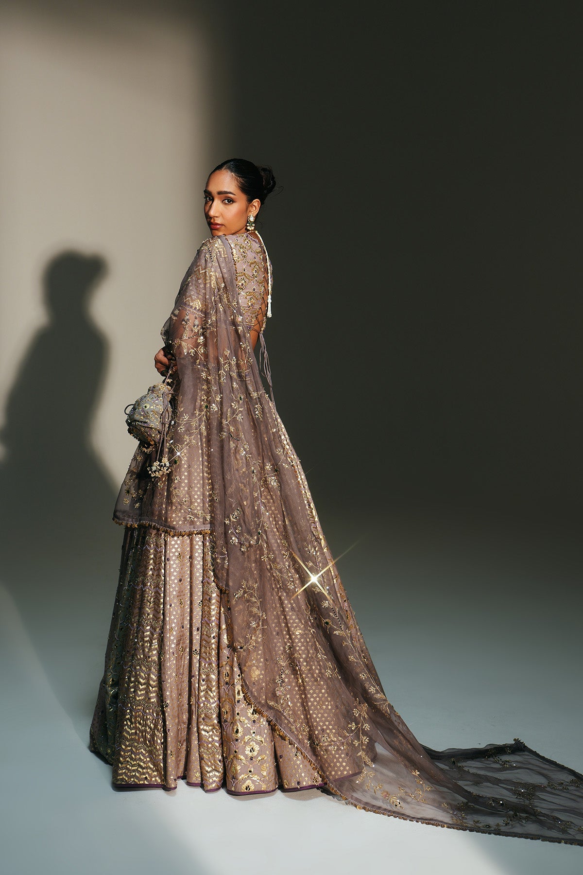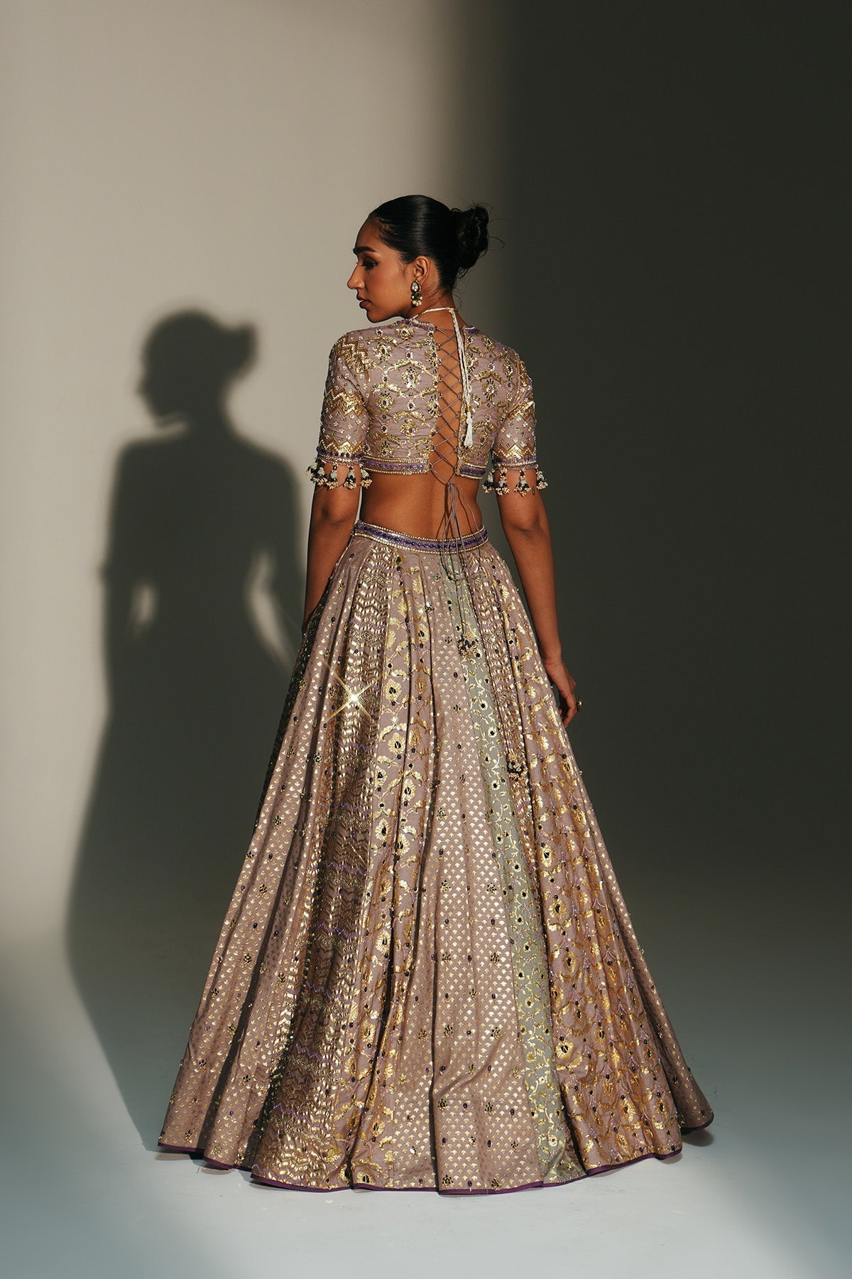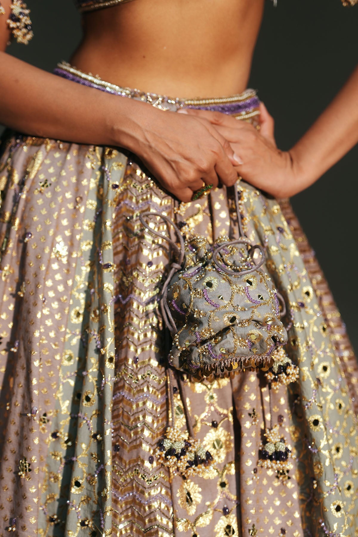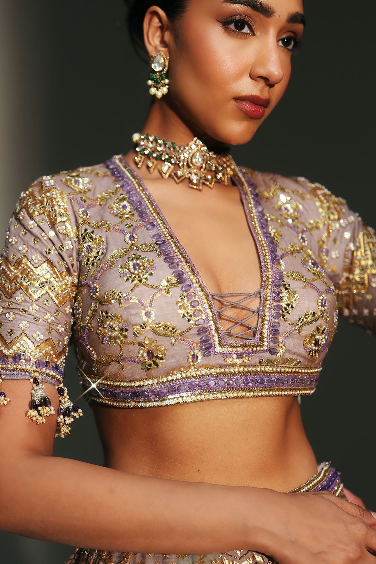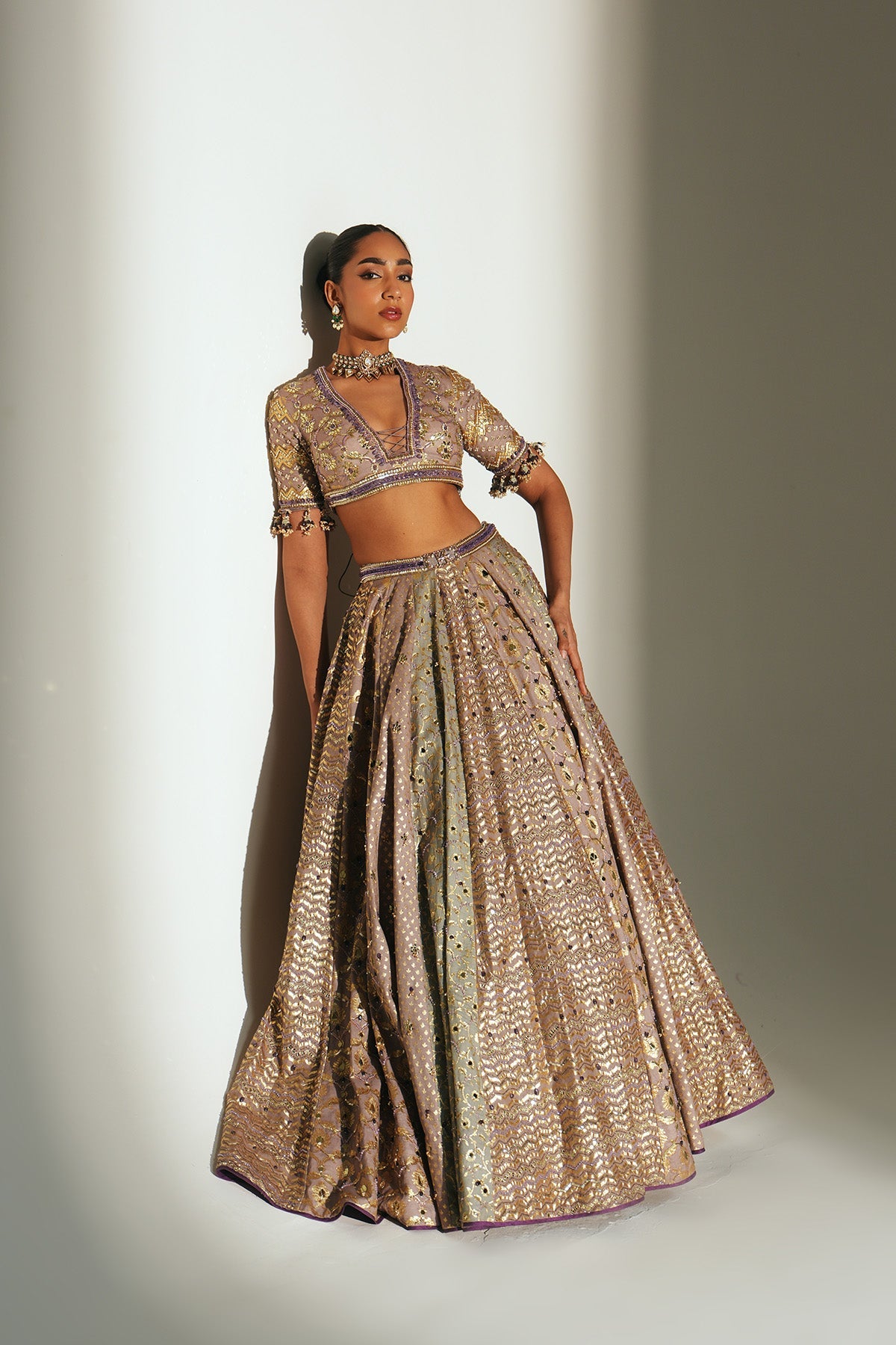 'Noorah' is from Mehfil collection by Mahima Mahajan. HAND EMBROIDERED LEHENGA FEATURING DRAGON FLY LOGO ON WAIST BELT PAIRED WITH MATCHING EMBROIDERE D BLOUSE AND DUPATTA