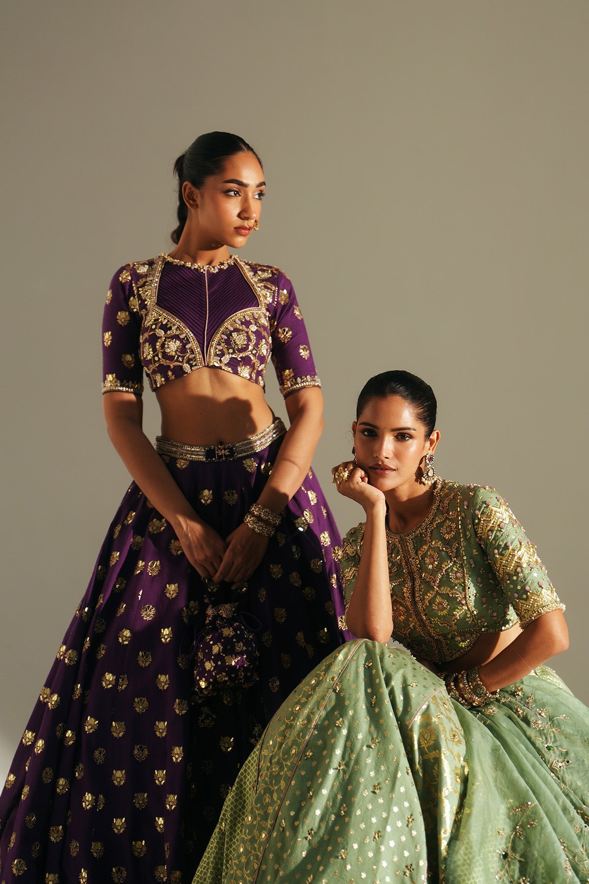 'Shubhi' is from Mehfil collection by Mahima Mahajan. HAND EMBROIDERED LEHENGA FEATURING DRAGON FLY LOGO ON WAIST BELT PAIRED WITH MATCHING EMBROIDERED BLOUSE AND DUPATTA