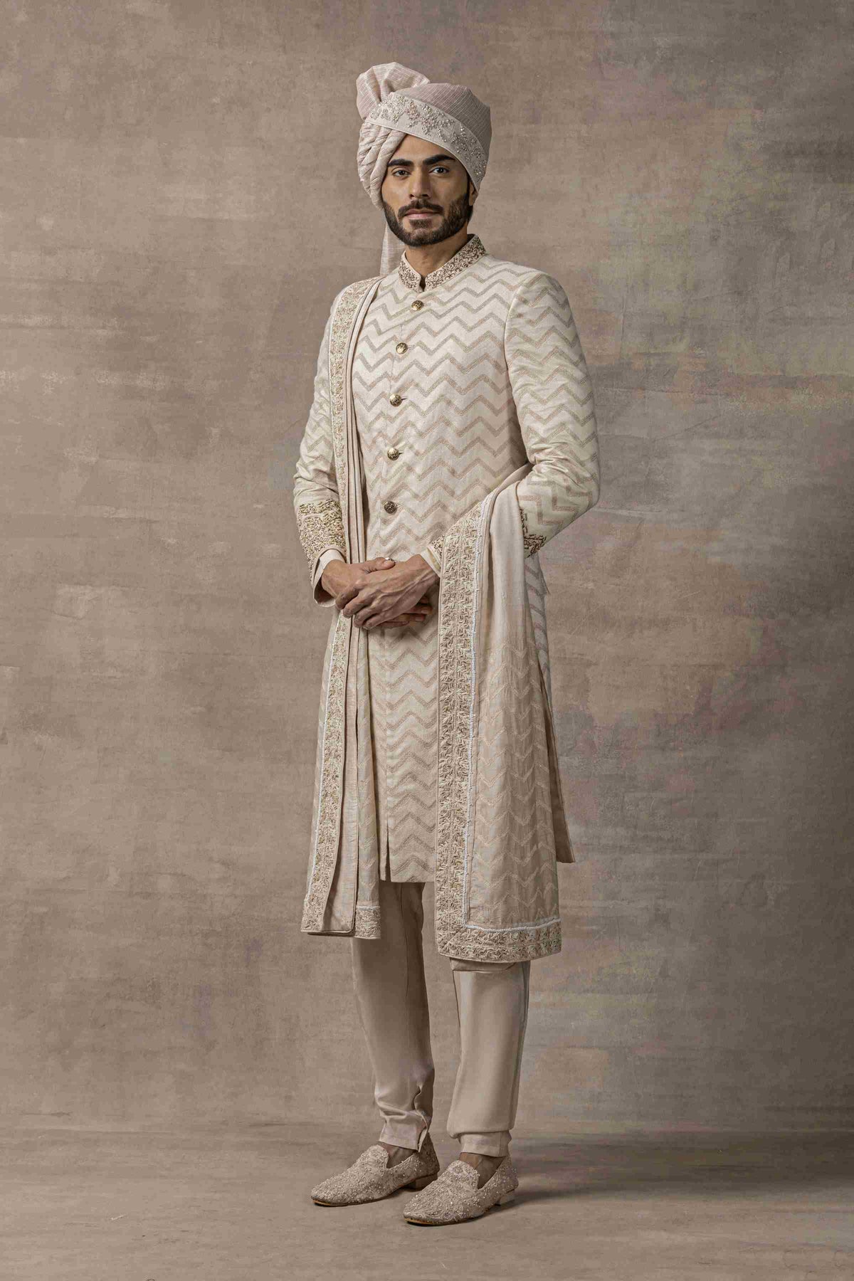 'Dusty Rose Chevron Sherwani' is from Sherwani Set collection by Sarab Khanijou. Featuring Dusty Rose Sherwani With Zari & Thread Work Highlighted With Sequin Paired With Kurta , Pant , Dupatta, Shoes And Safa Fabric