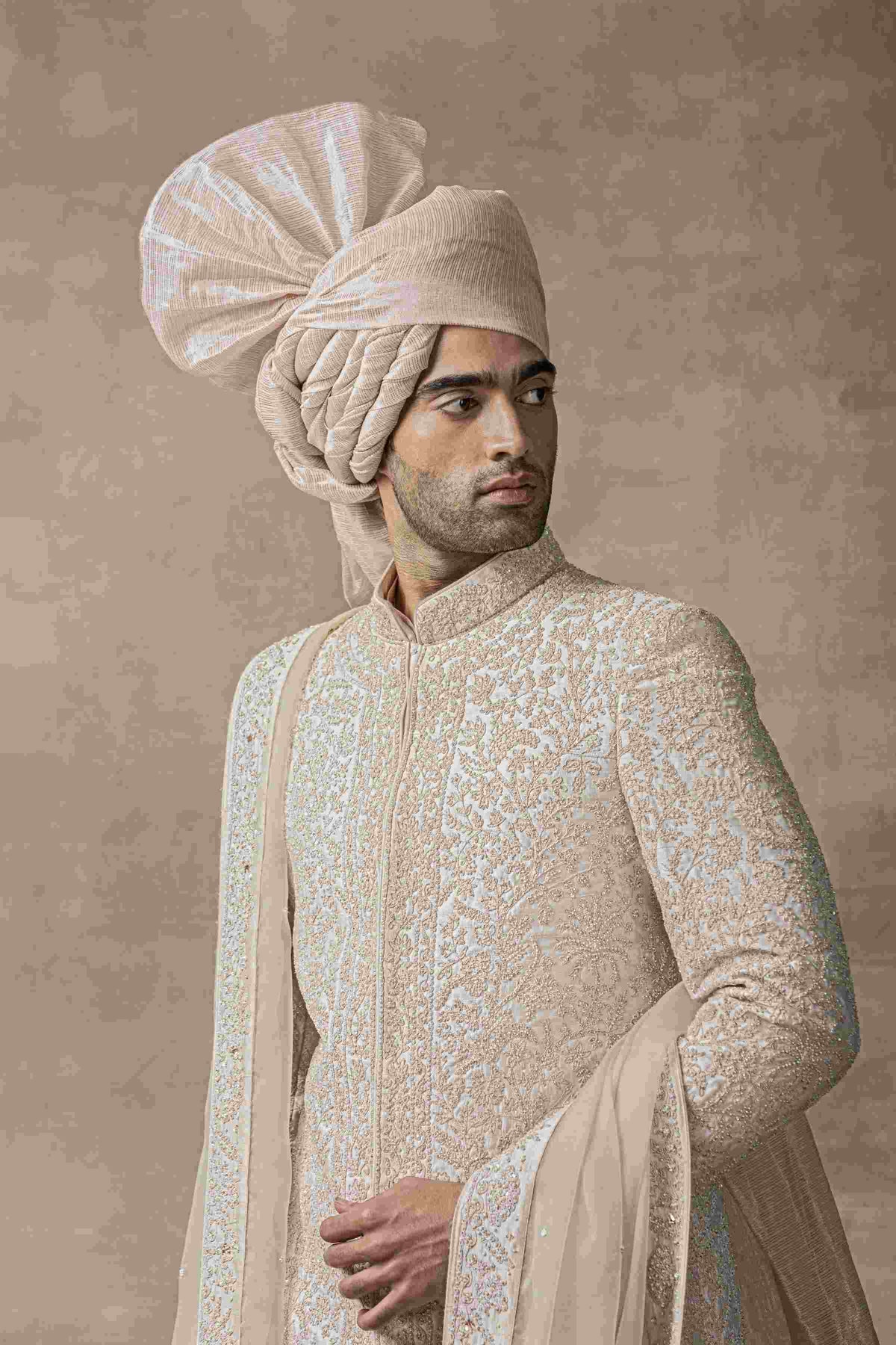 'Dusty Rose Sherwani With Thread Work Highlighted With Pearl And Sequin' is from Sherwani Set collection by Sarab Khanijou. Featuring Dusty Rose Sherwani With Thread Work Highlighted With Pearl And Sequin Work Paired With Kurta, Pant, Shoes , Dupatta And Safa Fabric