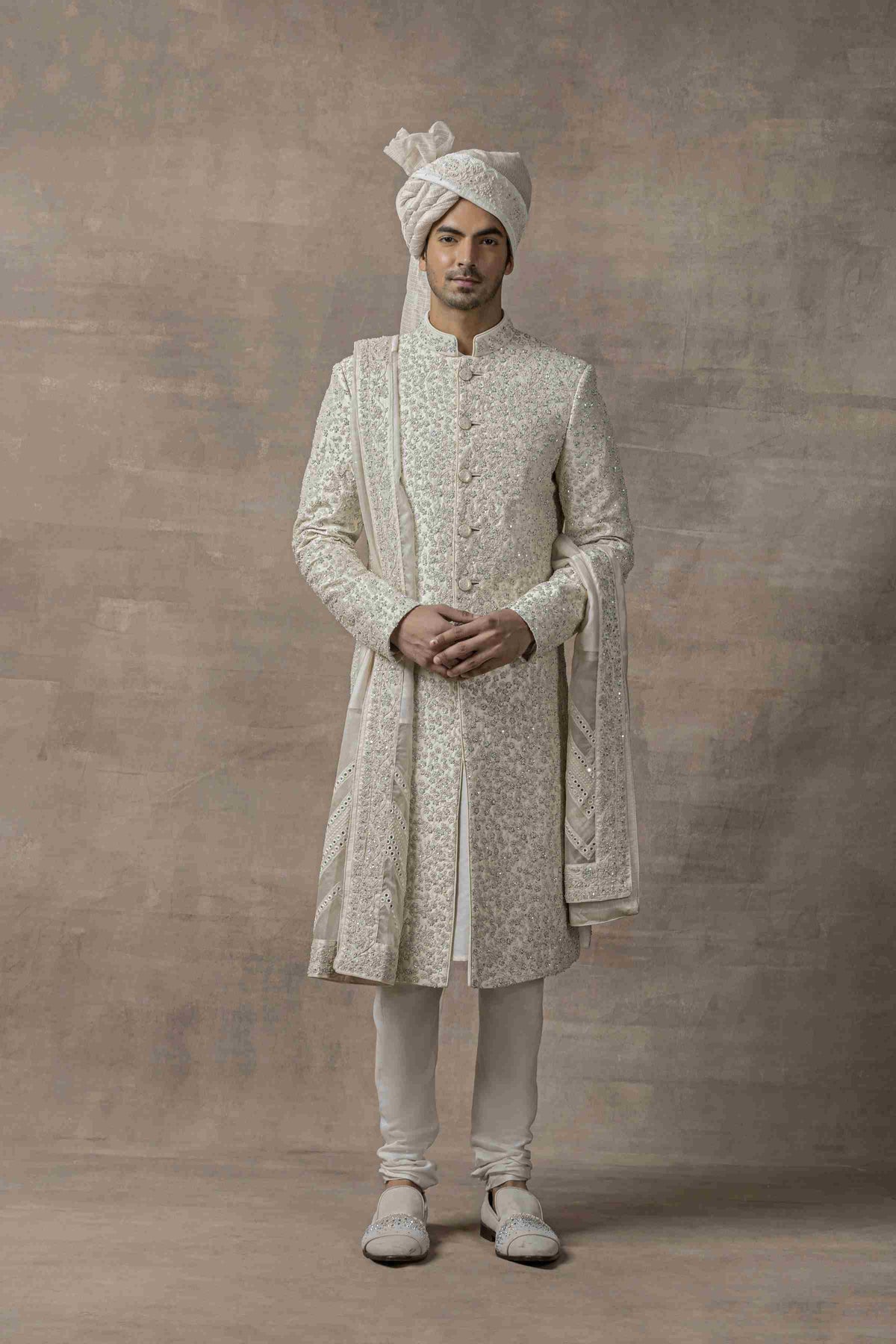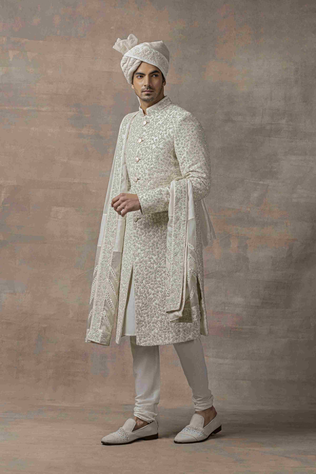 'Ivory Sequin Work Sherwani' is from Sherwani Set collection by Sarab Khanijou. Featuring Ivory Sherwani Highlighted With Silver Sequin Work Paired With Kurta, Pants, Shoes, Dupatta & Safa Fabric