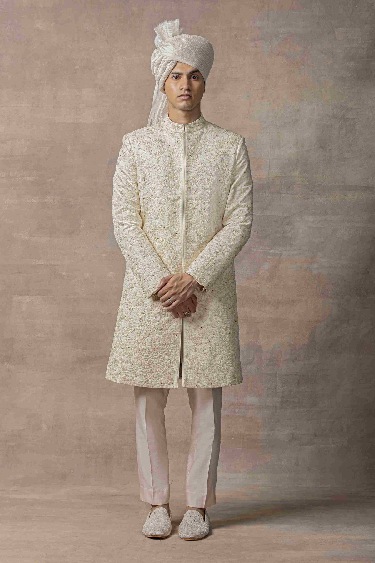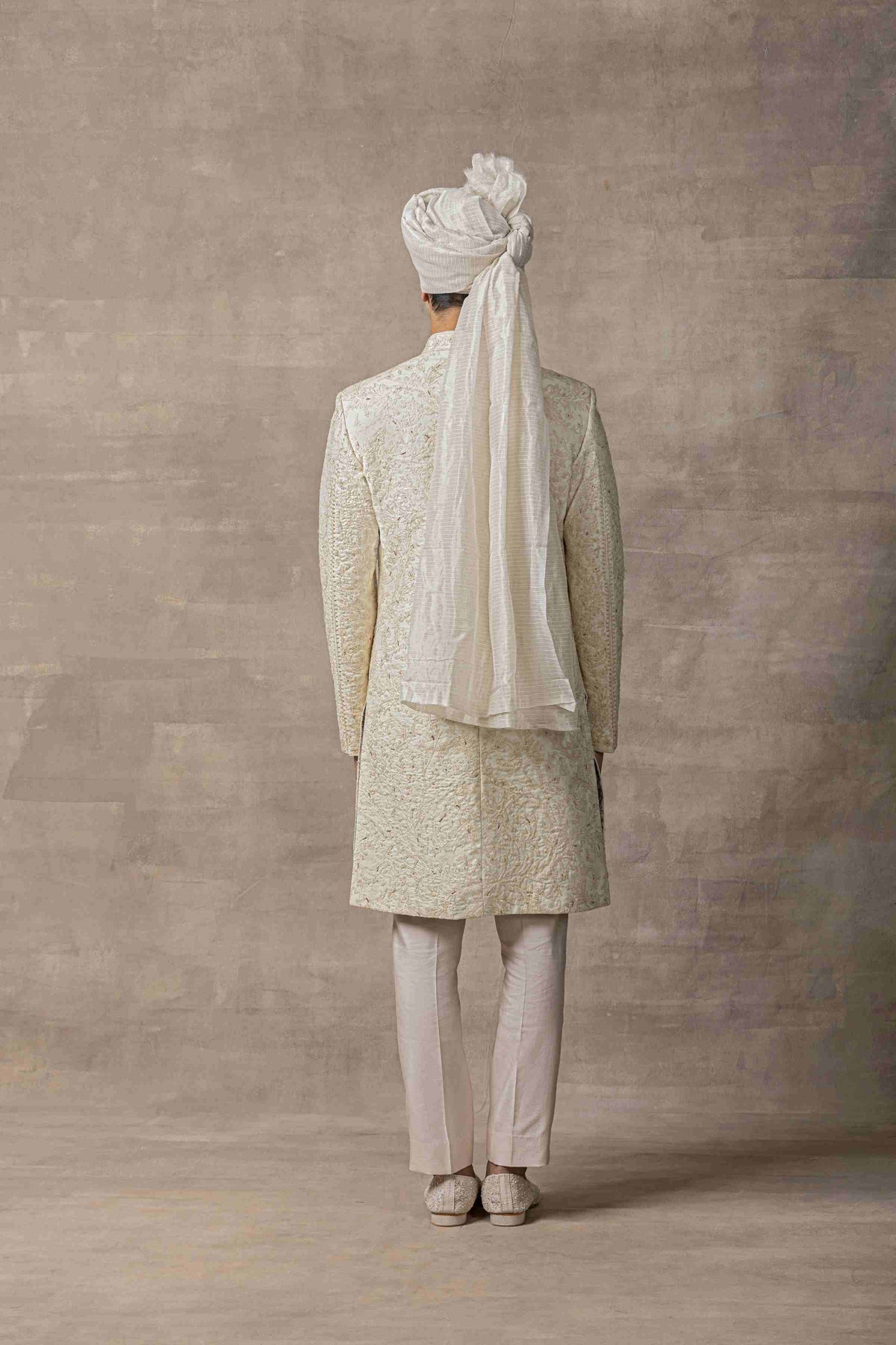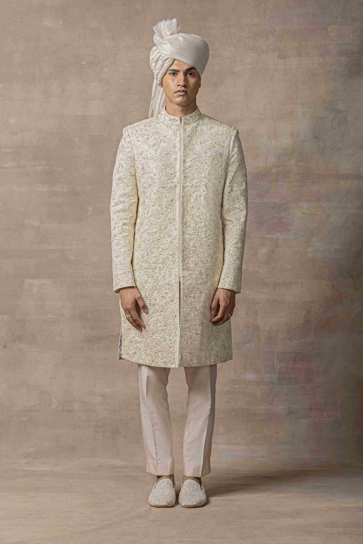 'Off White Sherwani Highlighted With Nude Peach Thread Work' is from Sherwani Set collection by Sarab Khanijou. Featuring An Off White Sherwani Highlighted With Nude Peach Thread Work With Rose Gold Swaroski Detailing Paired With Kurta, Pants, Shoes , Dupatta And Safa Fabric